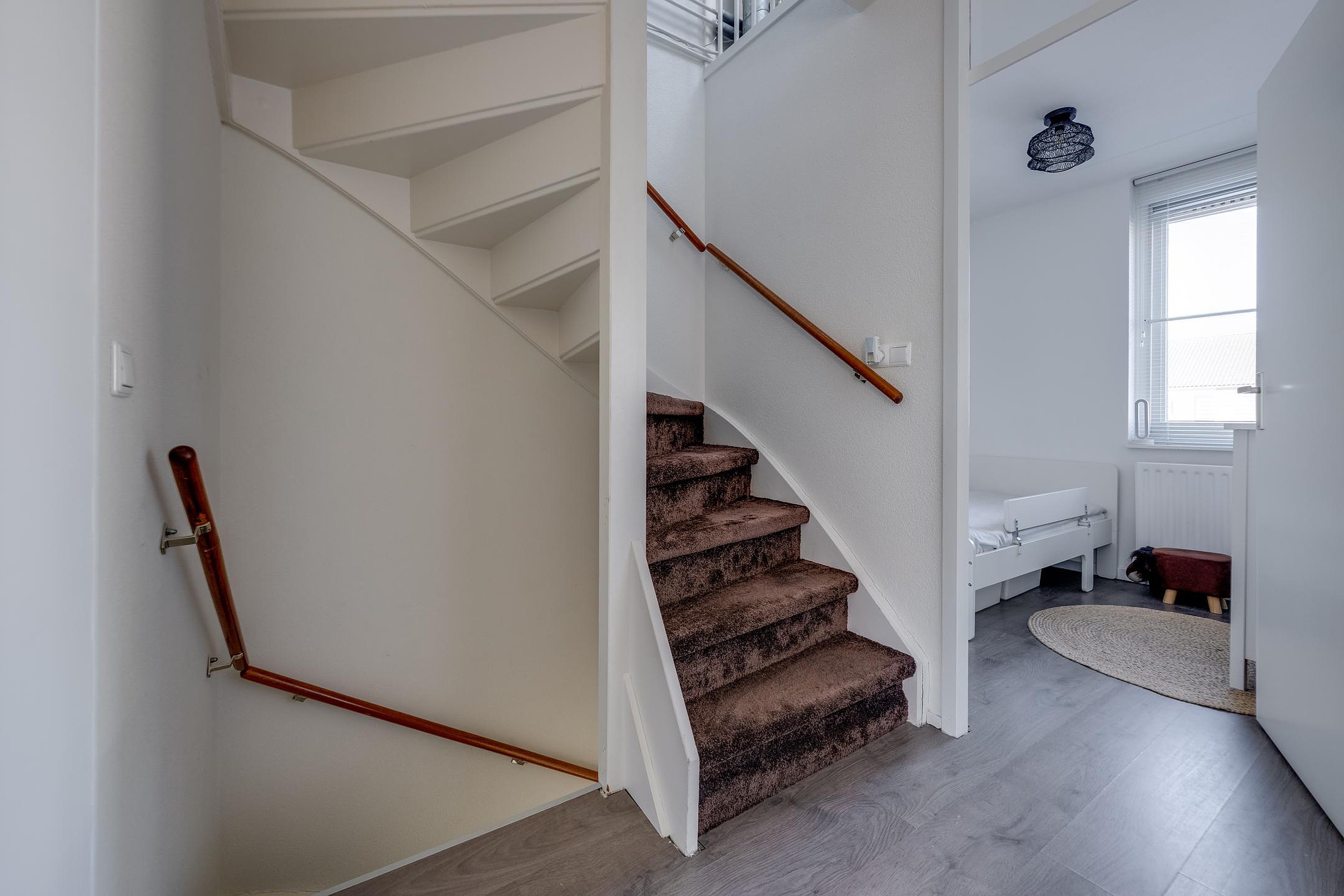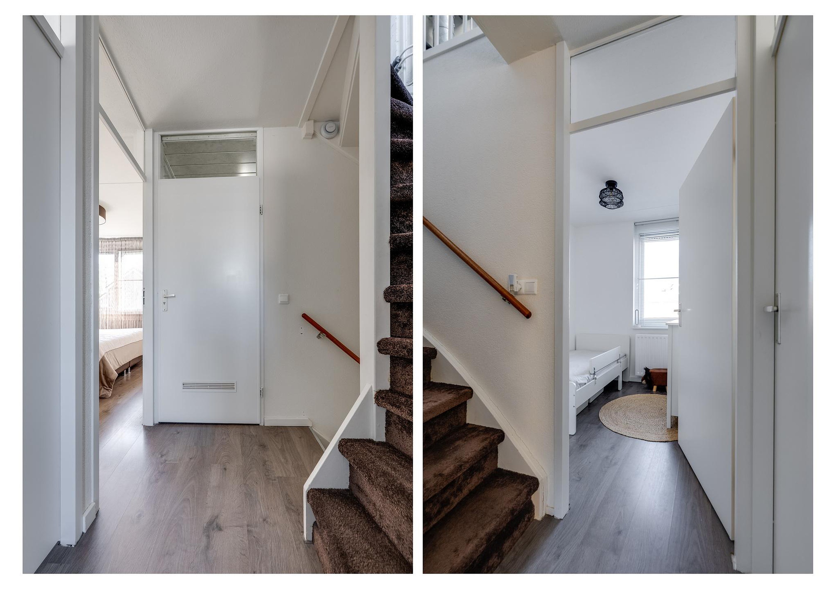 Eerste verdieping Overloop met toegang tot 3 slaapkamers, de badkamer en de vaste trap naar de tweede verdieping. Alle hardhouten kozijnen op deze verdieping zijn v.v. enkel glas en rolluiken. Alle kamers (m.u.v. de badkamer) hebben een doorlopende laminaatvloer.