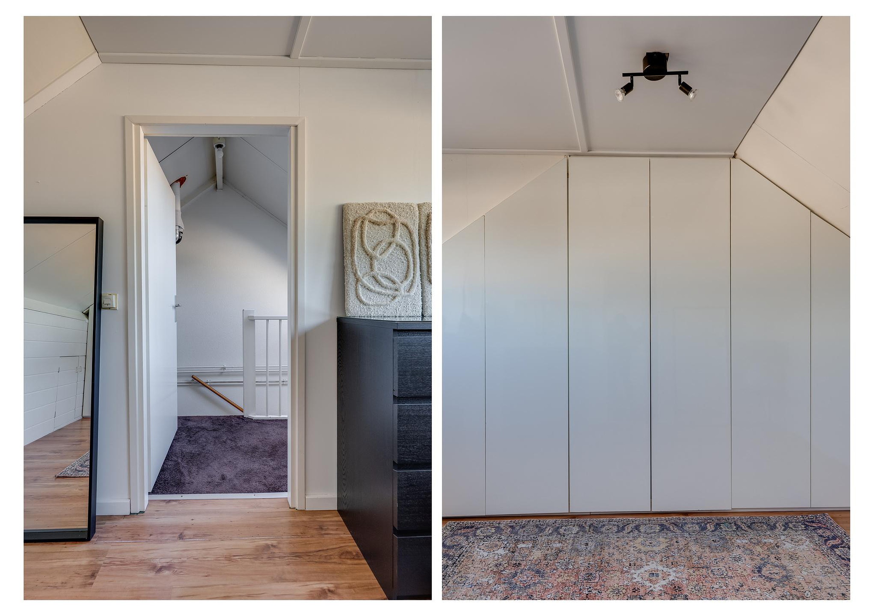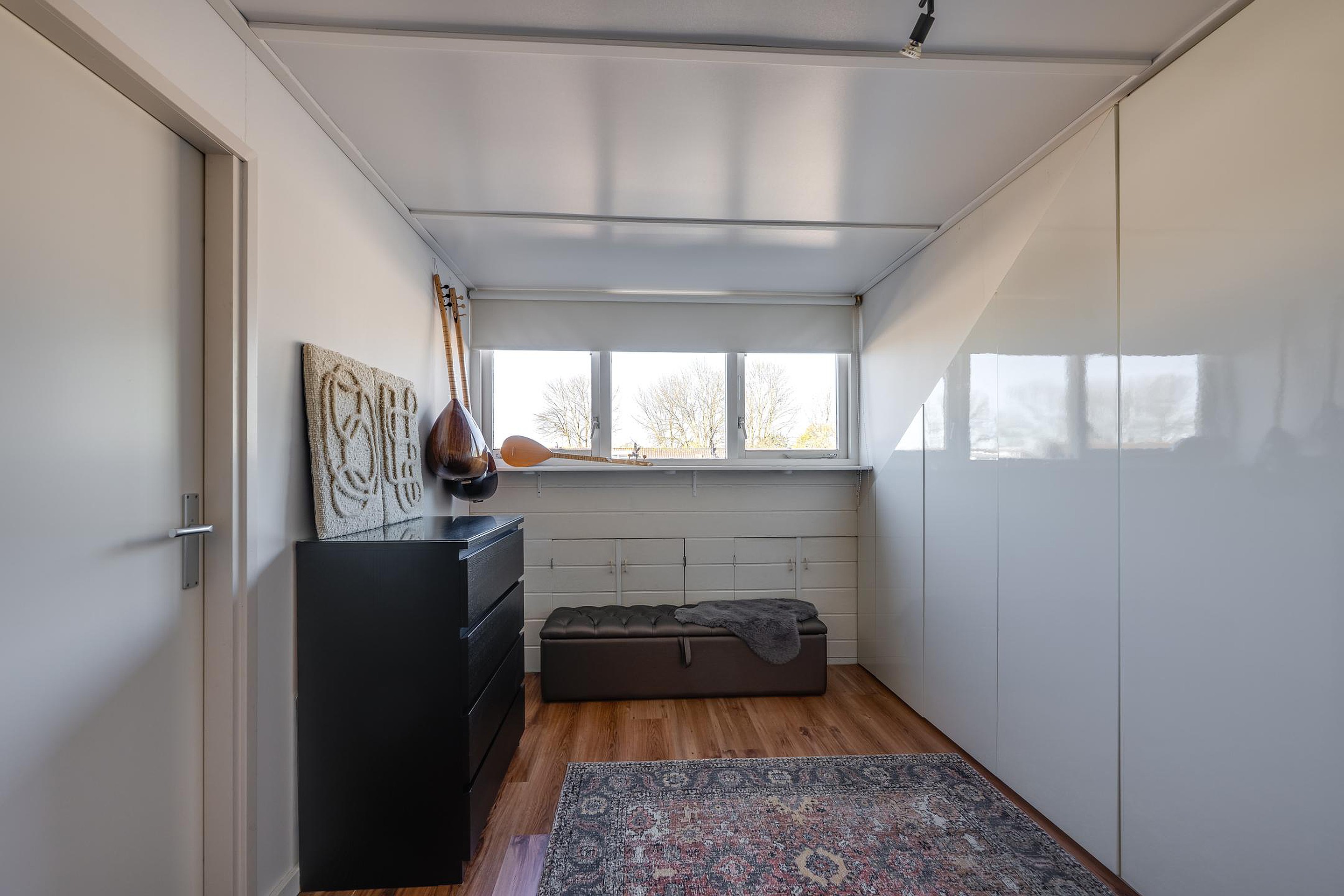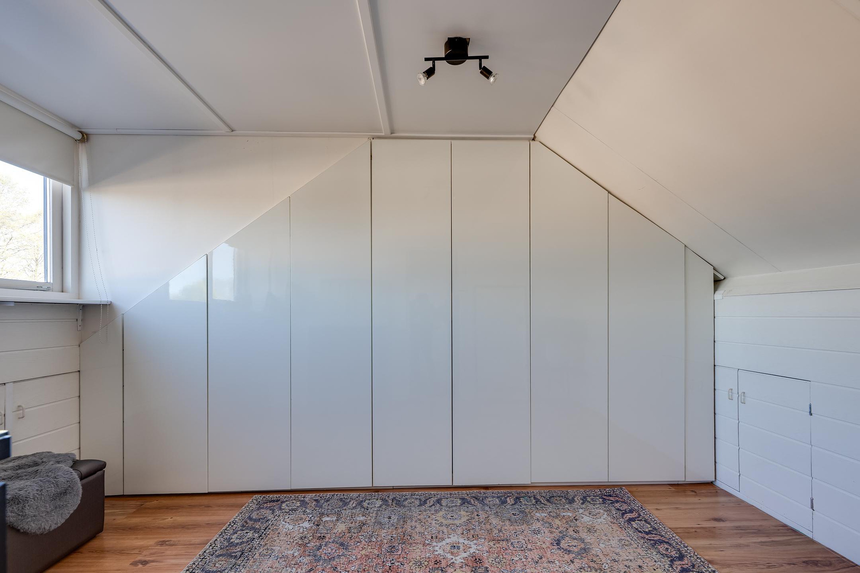 Deze ruime kamer (4,06 m. x 3,12 m.) heeft een praktische, vaste kastenwand. Er ligt een laminaatvloer. Aan twee zijdes vindt u knieschotten voor extra bergruimte.