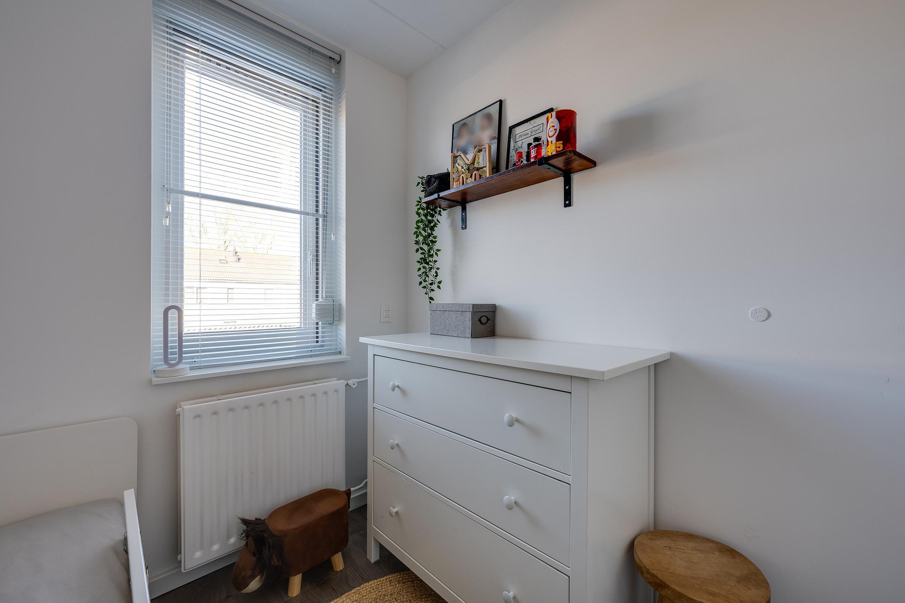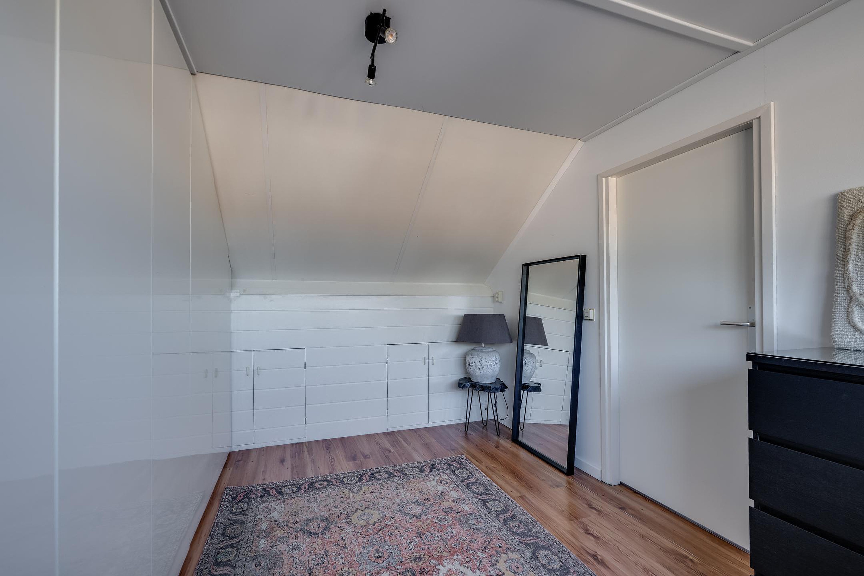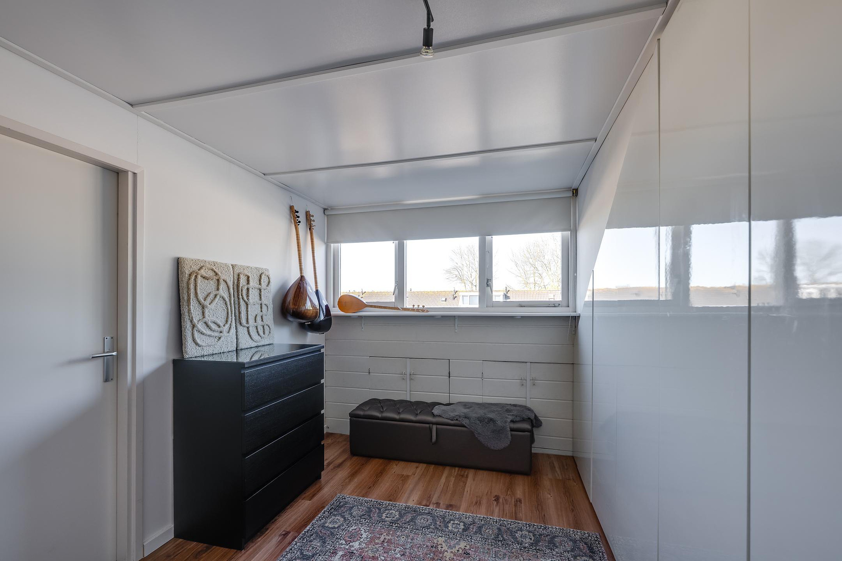 Deze ruime kamer (4,06 m. x 3,12 m.) heeft een praktische, vaste kastenwand. Er ligt een laminaatvloer. Aan twee zijdes vindt u knieschotten voor extra bergruimte.