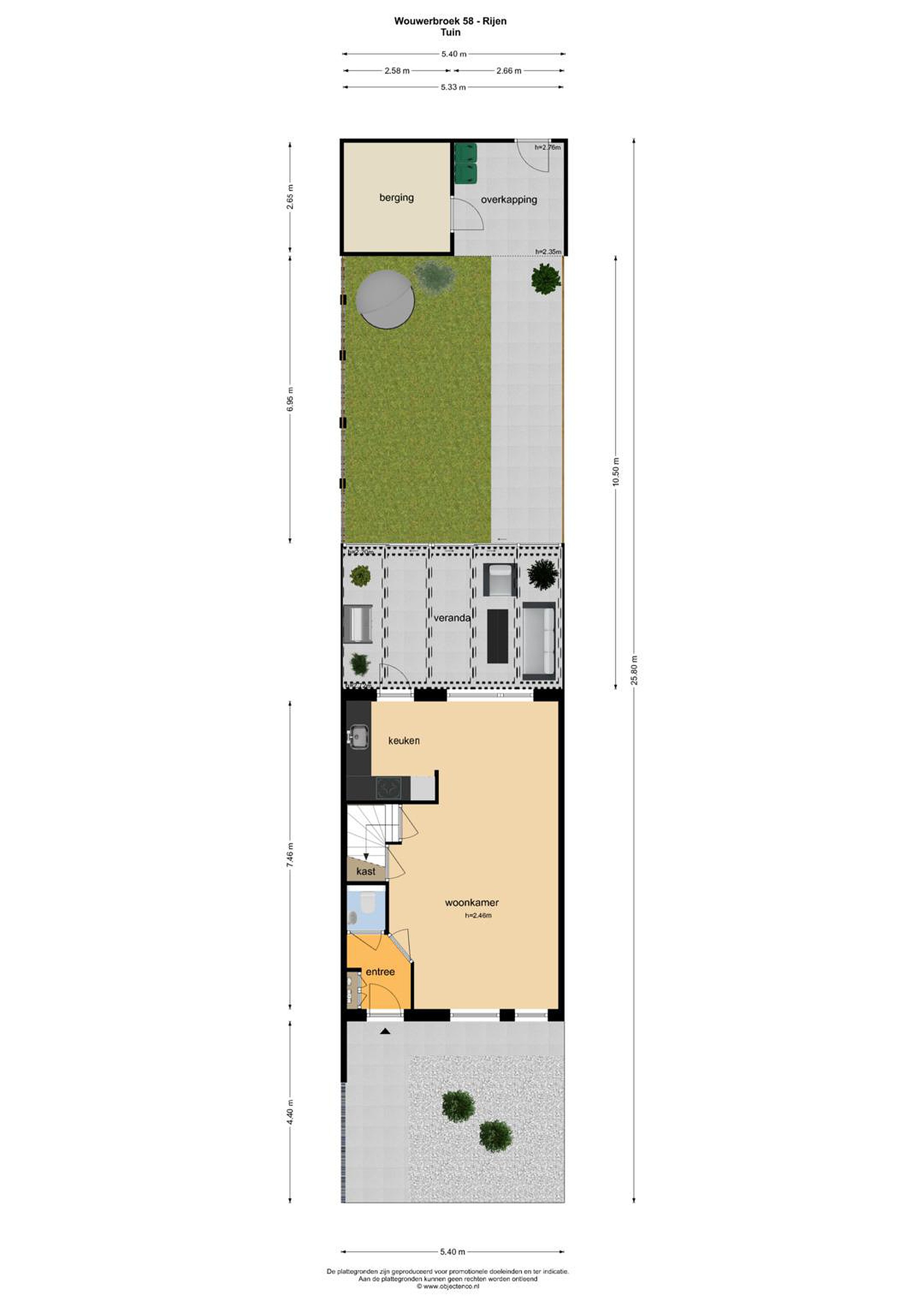 Tuin De achtertuin (13,15 m. x 5,33 m.) is gelegen op het zuidwesten. De tuin is v.v. een grote tegel en kunstgras. Verder is er een buitenkraan en buitenverlichting. Direct achter de woning staat een aluminium tuinserre (5,33 m. x 3,44 m.) over de gehele breedte van de woning. De serre is uitgerust met 6 glazen schuifdeuren en licht doorlatende, polycarbonaat kanaalplaten. Achter in de tuin staat een stenen berging (2,65 m. x 2,58 m.) v.v. en elektra. Er is een kleine overkapping en achterom.