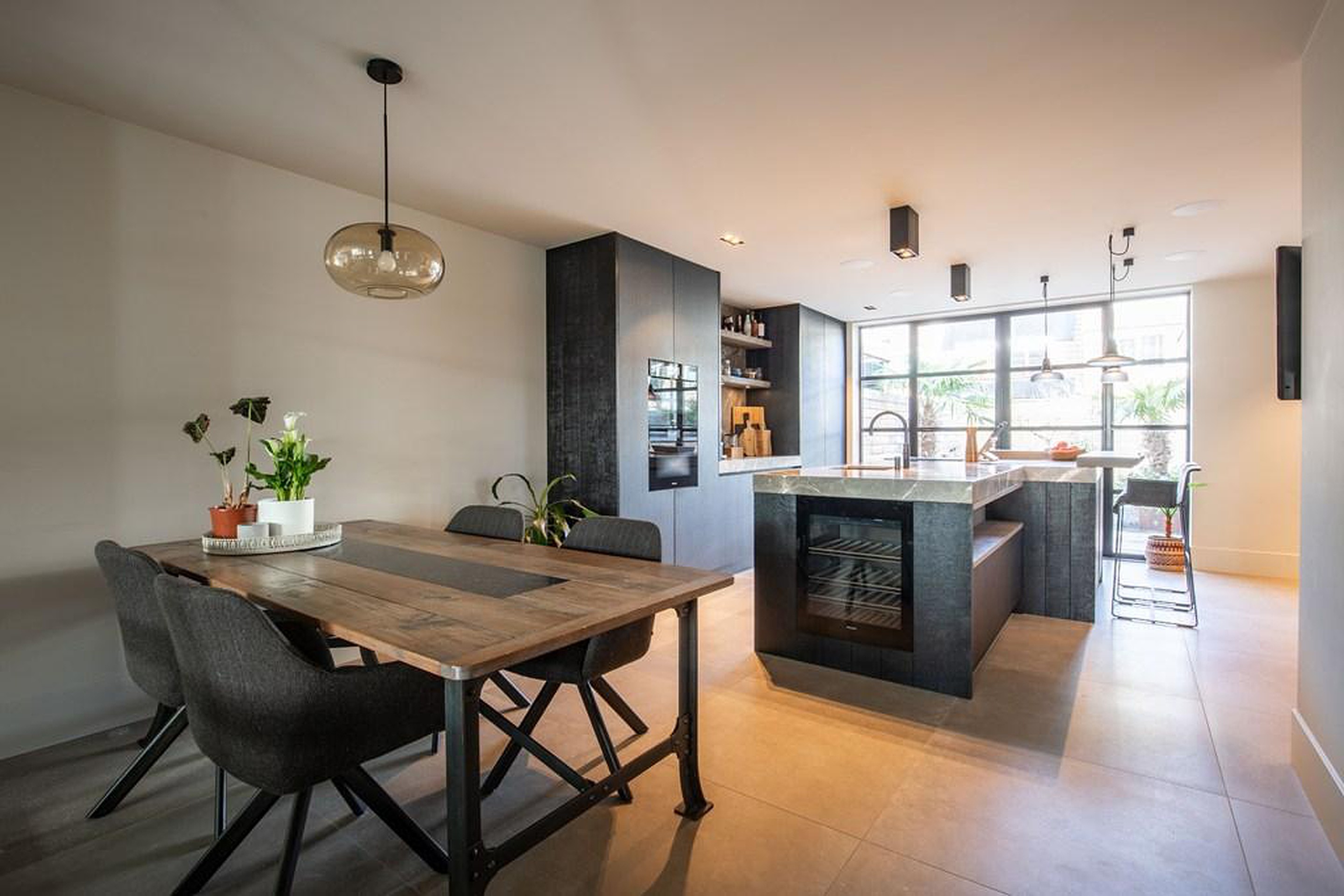 Vanuit de hal ontvouwt zich, achter een indrukwekkende taatsdeur, het kloppend hart van de woning: de woonkeuken. Een ruimte die niet ontworpen is om alleen te functioneren, maar om te leven. De woonkeuken en woonkamer zijn stijlvol van elkaar gescheiden door een taatswand met taatsdeur – een krachtig architectonisch statement waarin design en functionaliteit perfect samenkomen. Het royale kook- en spoeleiland vormt het middelpunt, met daaromheen barkrukken die uitnodigen tot lange avonden, gesprekken en samenzijn. Het hoogwaardige apparatuurpakket laat niets te wensen over: een inductiekookplaat met geïntegreerde afzuiging, klimaatkast, combi-stoomoven, combimagnetron, koelkast, vriezer en vaatwasser zijn volledig geïntegreerd en afgewerkt op topniveau, terwijl de Quooker-kraan het geheel compleet maakt. De ruimte is zó royaal opgezet dat naast het eiland moeiteloos een grote eethoek past én er extra werkruimte is gecreëerd. Openslaande deuren verbinden de woonkeuken direct met de achtertuin, waardoor binnen en buiten naadloos in elkaar overlopen.