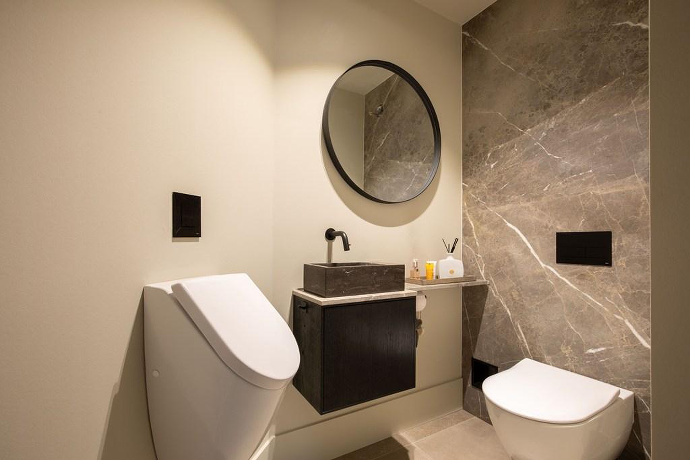 De entree leidt naar een royale hal waar ruimte, rust en verfijning gelijk al samenkomen. Alles is strak, doordacht en perfect afgewerkt. De uitgebreide meterkast is naadloos geïntegreerd en de toiletruimte is zeer luxe uitgevoerd, voorzien van een vrijdragend toilet, een urinoir en een elegant fonteintje.