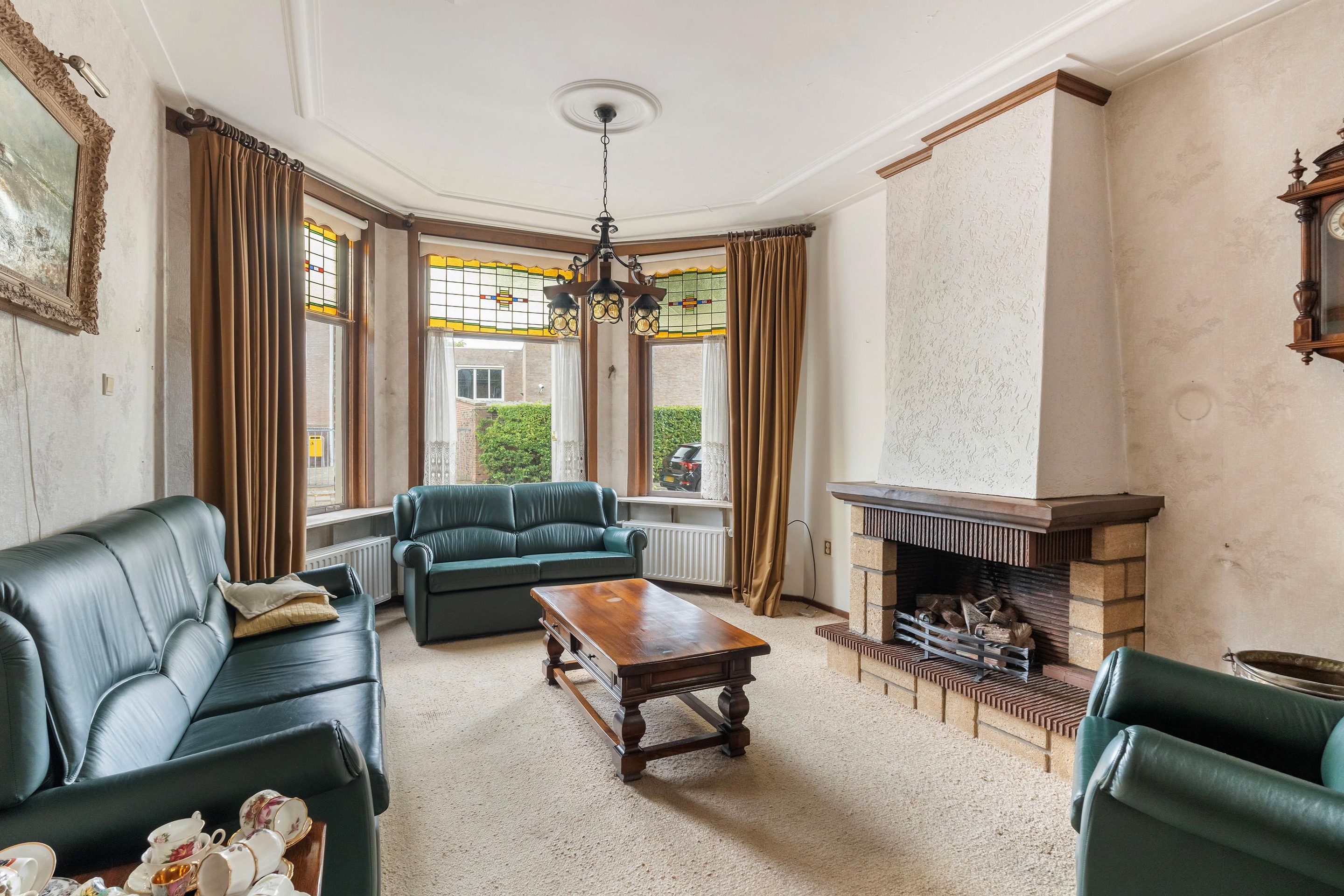 De lichte woonkamer van ca. 36 m2 met een plafondhoogte van 2.90 meter, klassieke schouw met open haard en sfeervolle erker aan de voorzijde, ademt de sfeer van de jaren ’30. Grote ramen zorgen voor veel lichtinval en zicht op het straatbeeld.