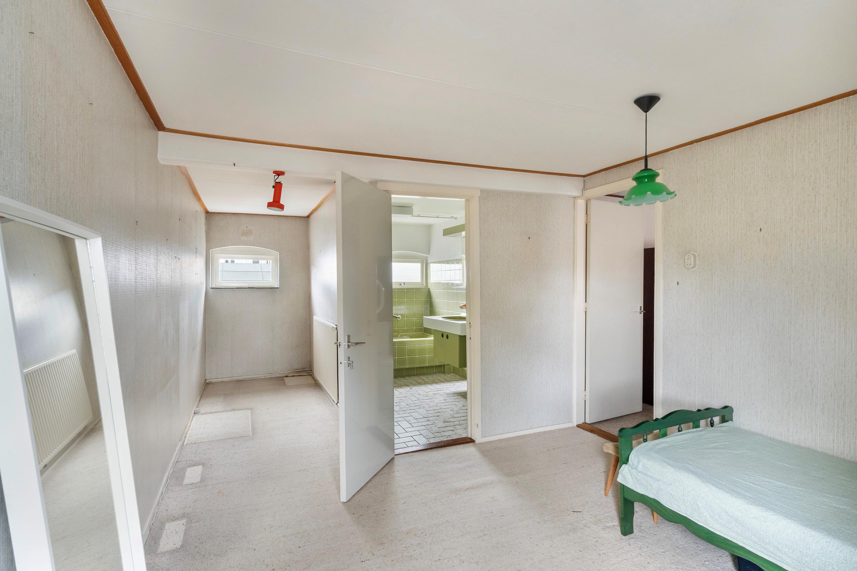 De overloop geeft toegang tot vier slaapkamers en een badkamer. De hoofdslaapkamer aan de voorzijde heeft een vaste kastwand én openslaande deuren naar het karakteristieke balkon. De badkamer is eenvoudig maar functioneel ingericht en voorzien van een ligbad/douchecombinatie, wastafelmeubel en tweede toilet.