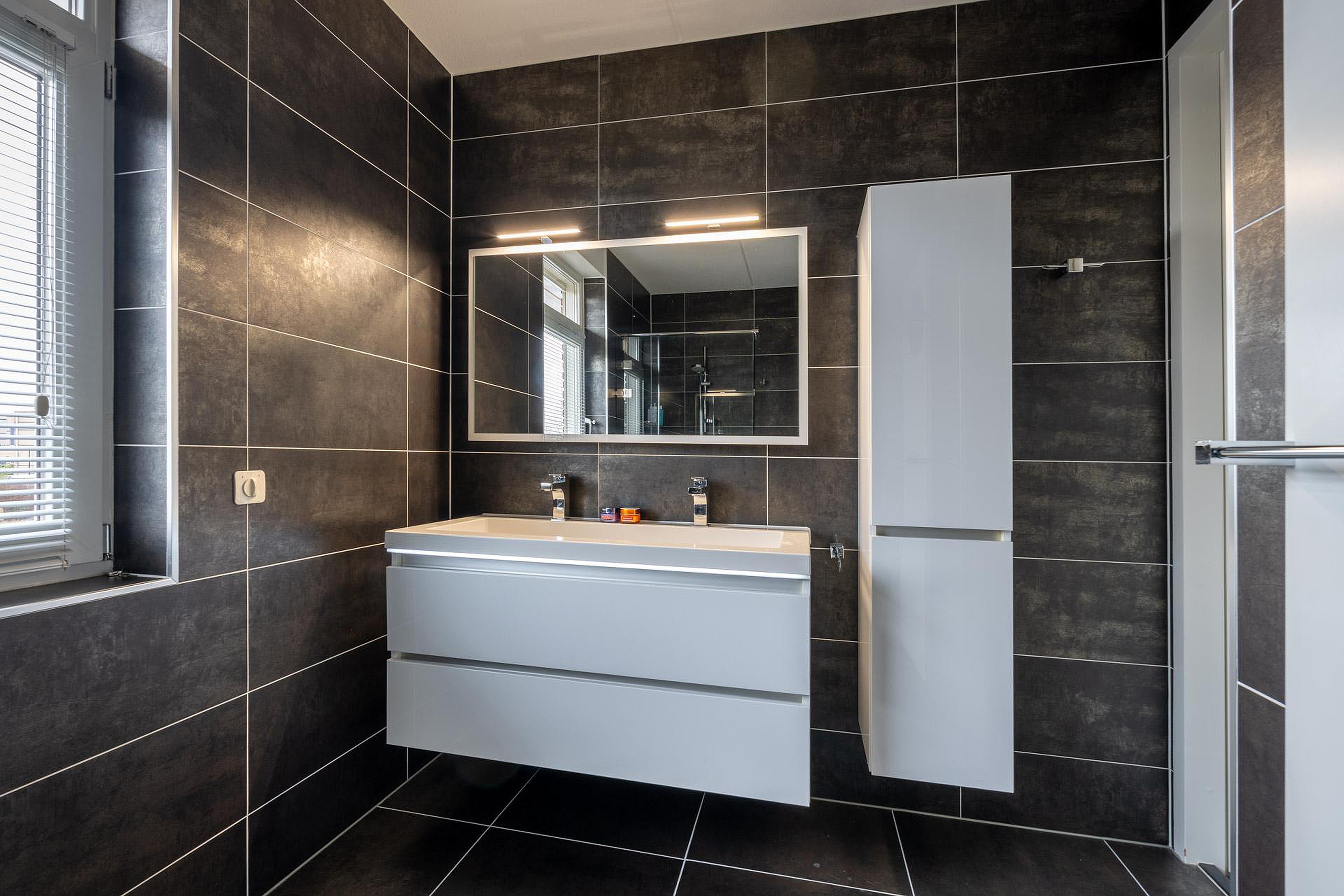 Overloop met airco-installatie en toegang tot drie royale slaapkamers en badkamer voorzien van vloerverwarming, inloopdouche, dubbel wastafelmeubel en toilet.