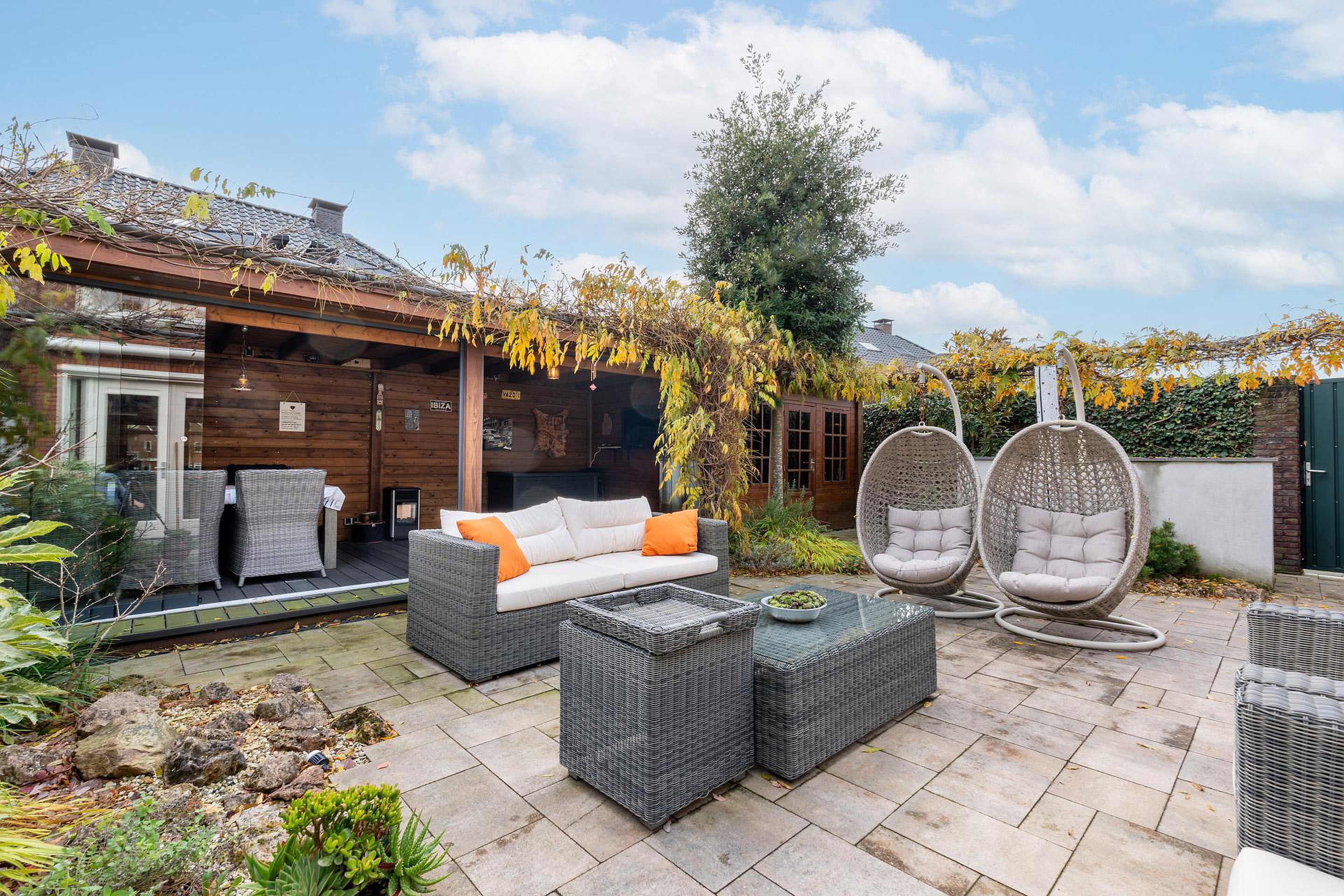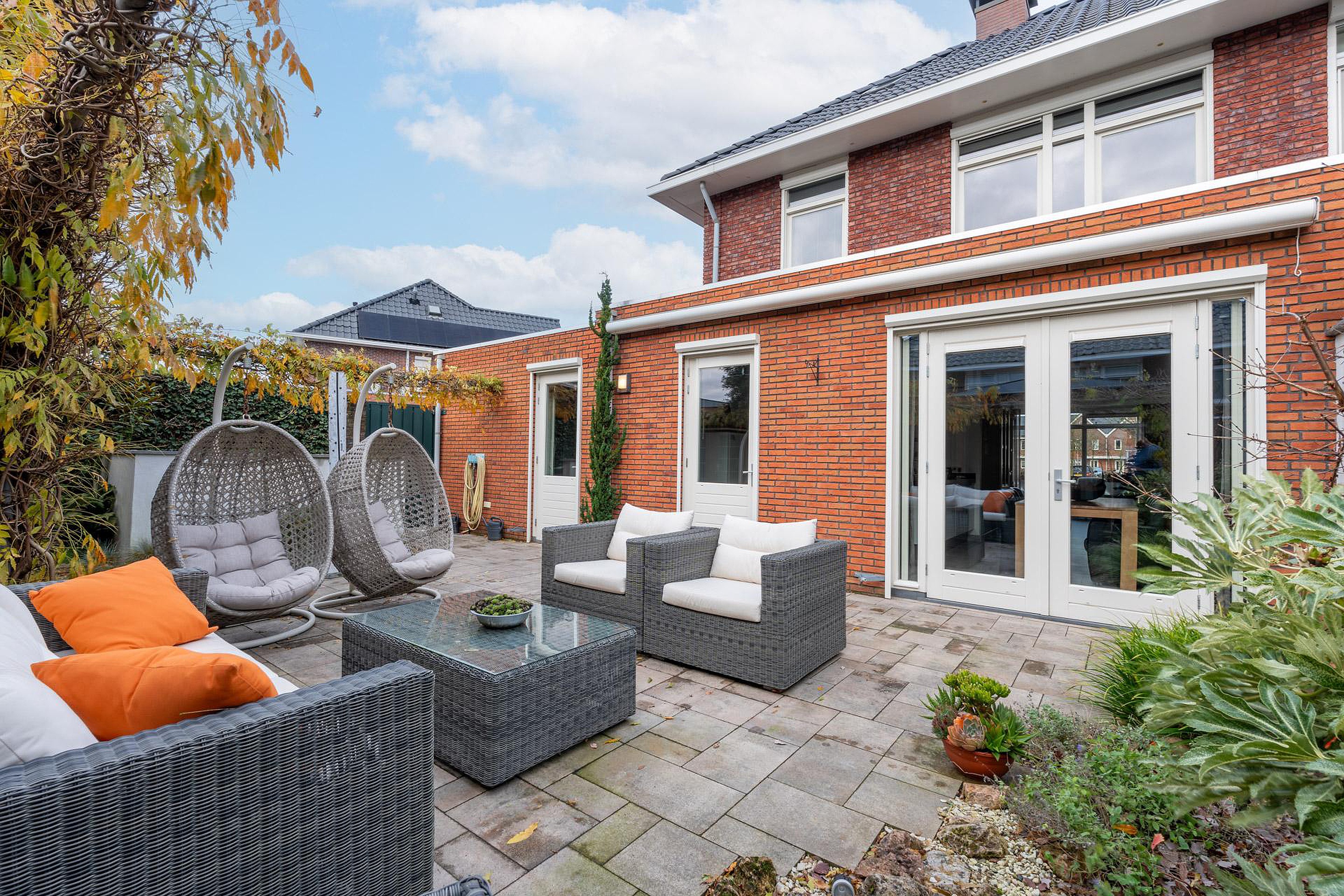 De achtertuin is perfect op het zuiden gesitueerd en voorzien van een achterom en nette overkapping met glazen schuifwanden. Grenzend aan de overkapping is een houten tuinschuur gesitueerd. Het zonneterras met zonnescherm grenst aan de leefkeuken.