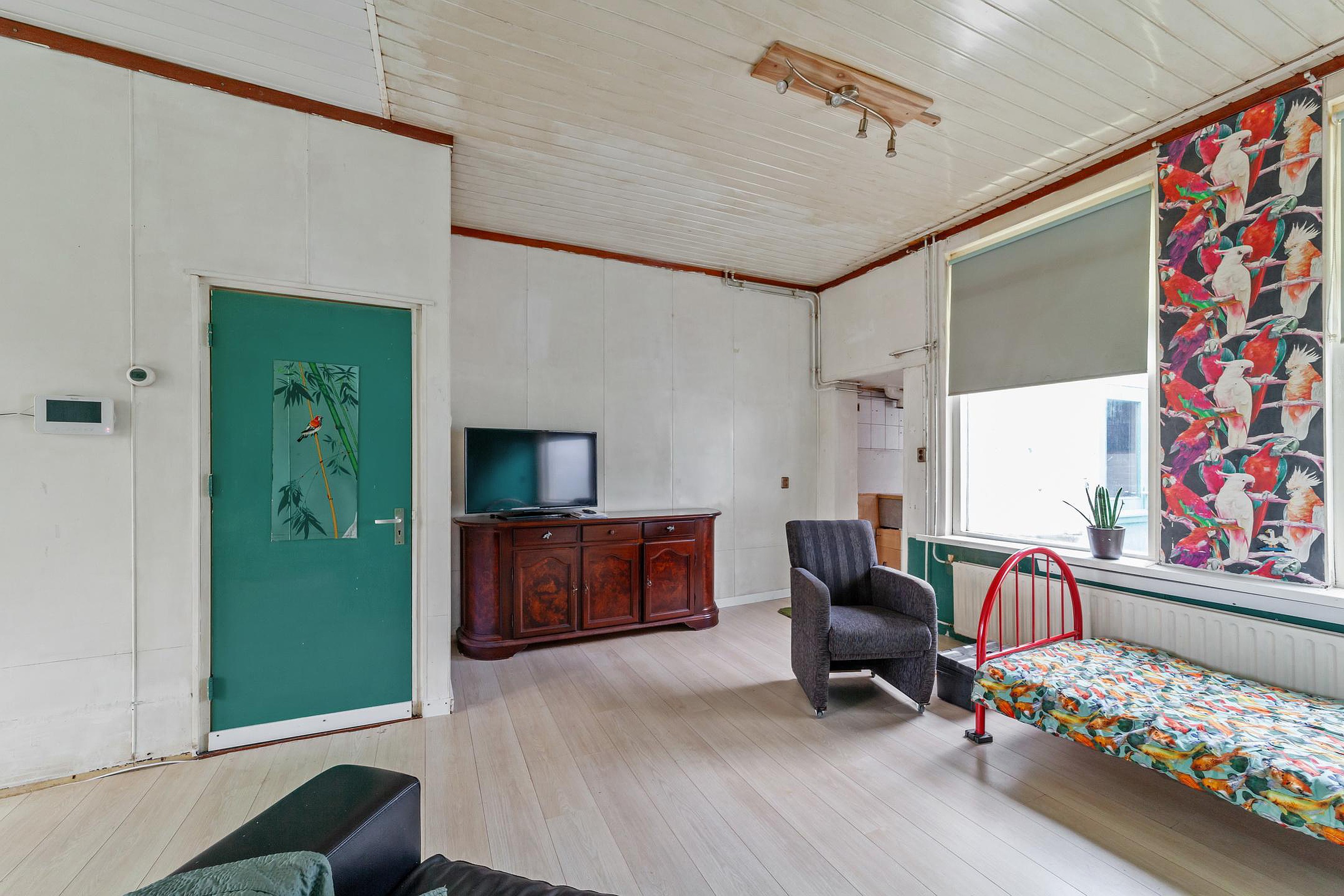 De woon-/eetkamer met zitgedeelte aan de voorzijde en eetgedeelte met aansluitend halfopen keuken met zeer eenvoudig keukenblok aan de achterzijde.