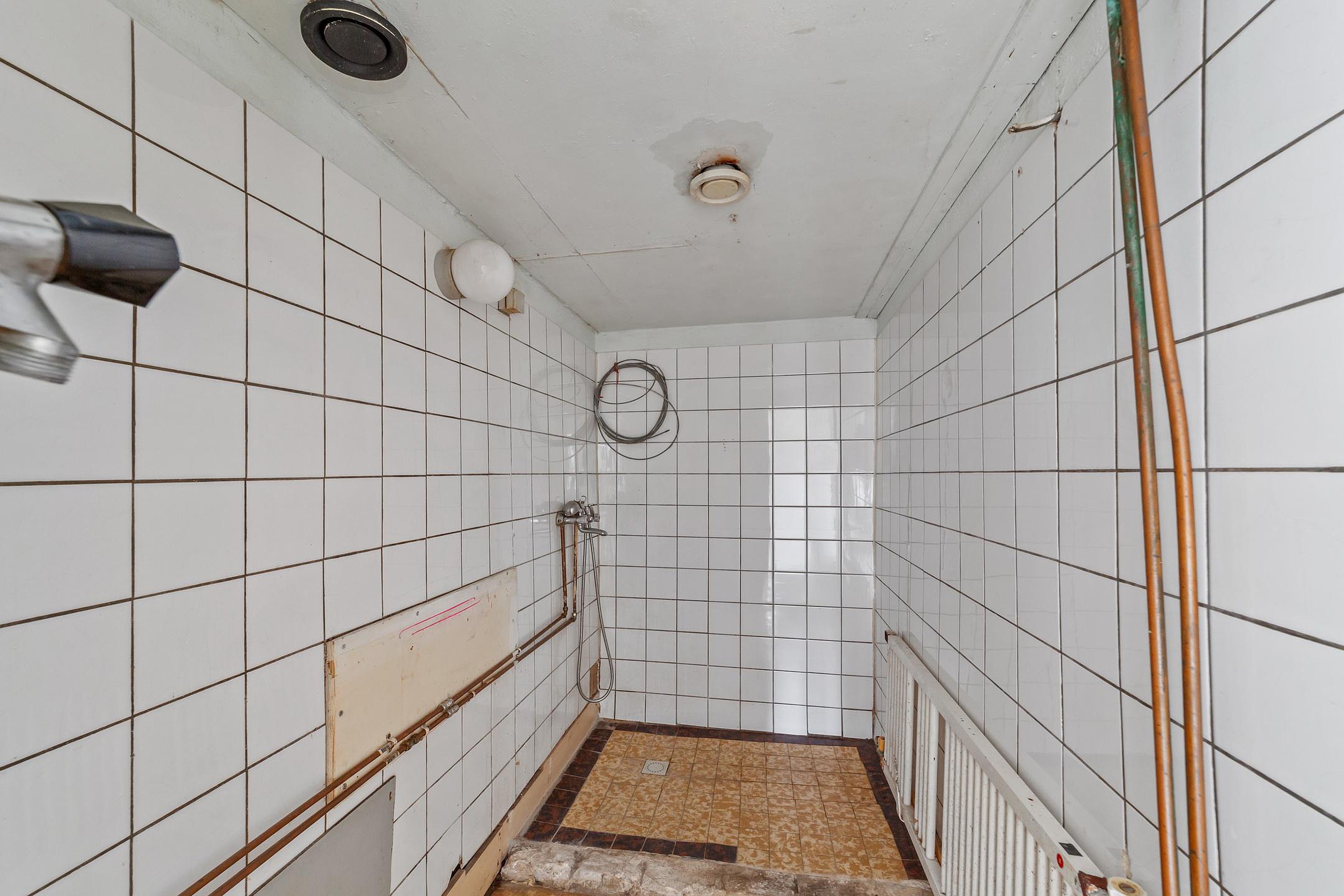 Aansluitend de badkamer en kleine buitenruimte met houten schuur.