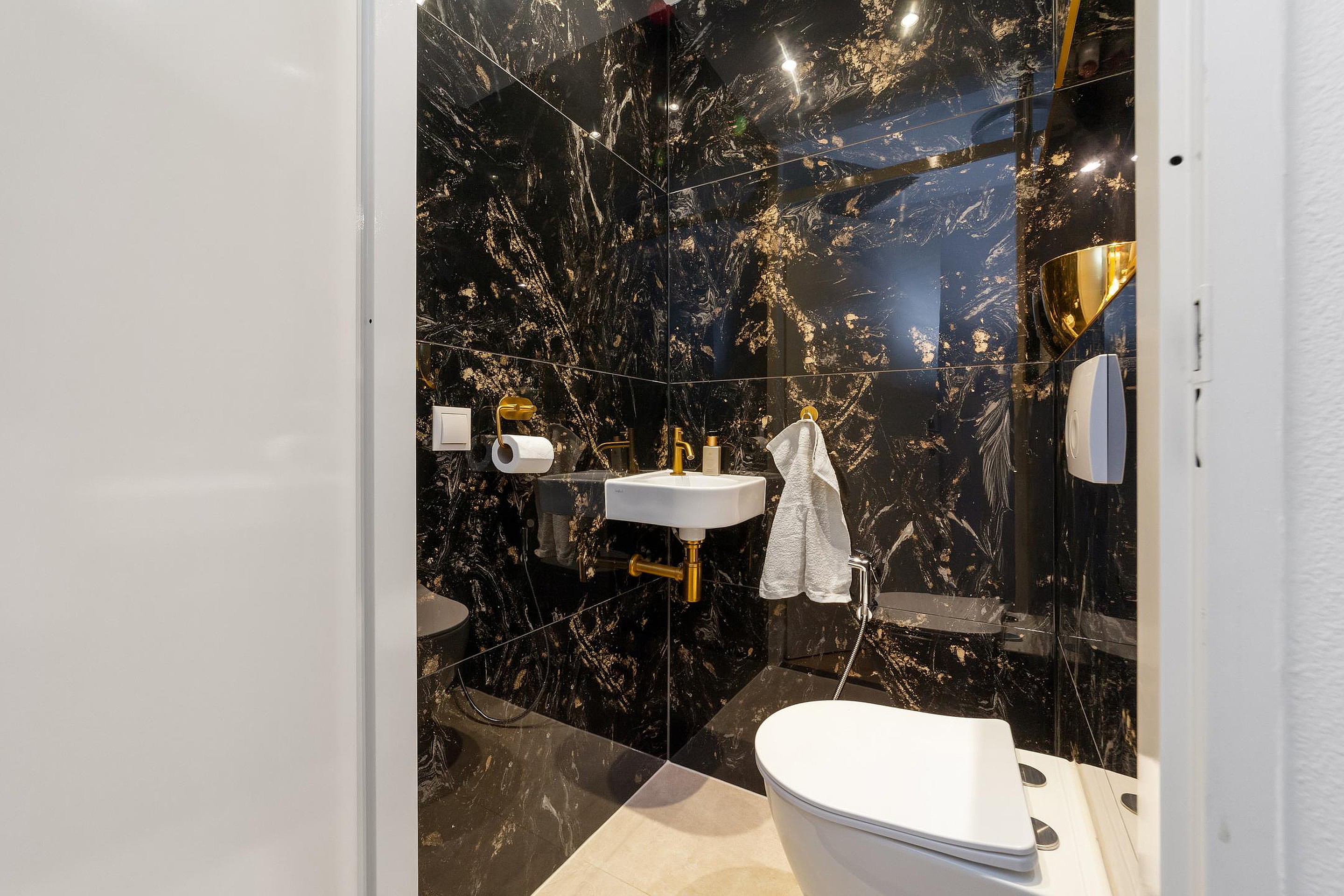 Upon entering, you will find the hallway with the meter cupboard and a modern restroom equipped with a wall-hung toilet and a small sink.