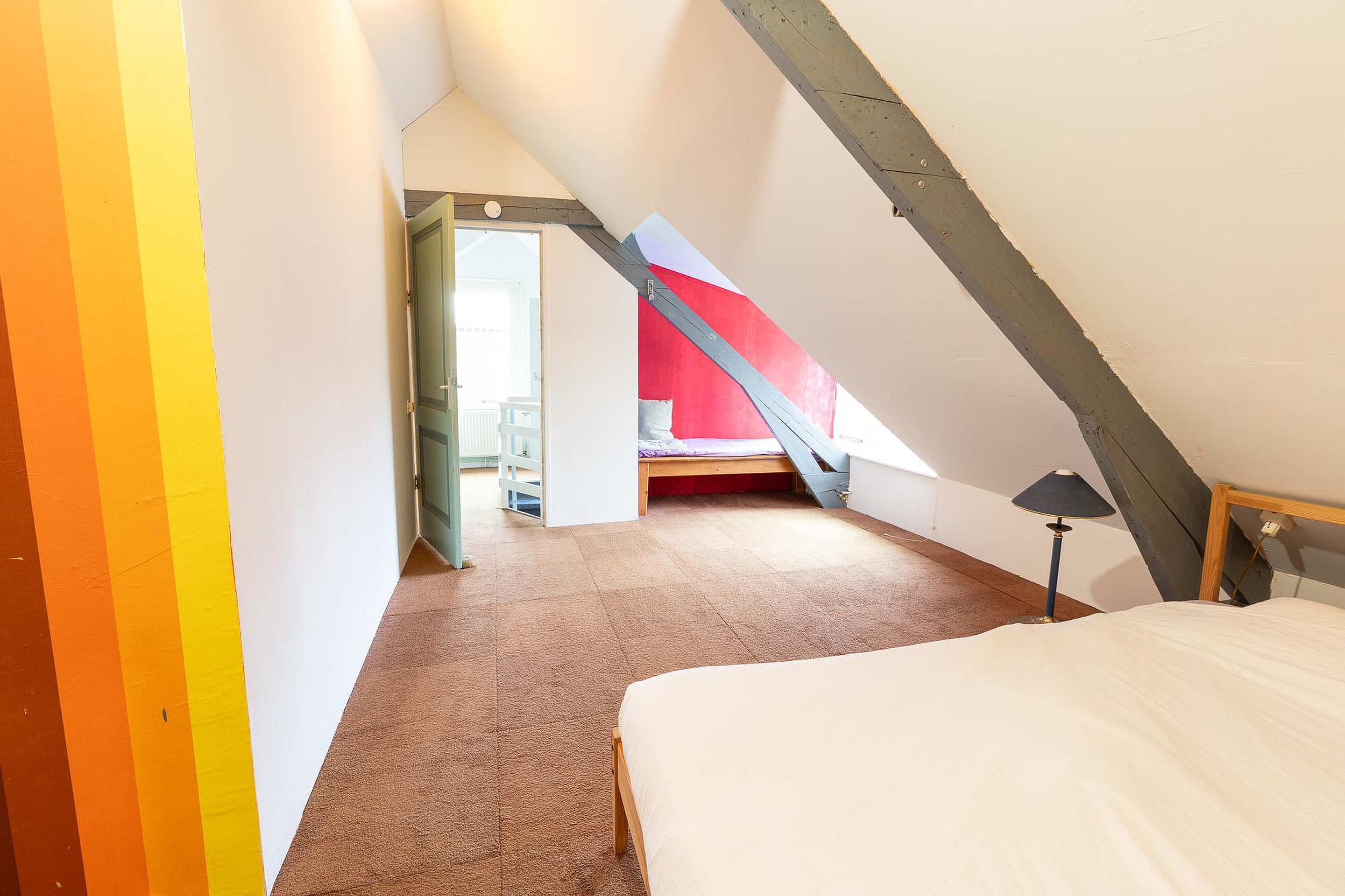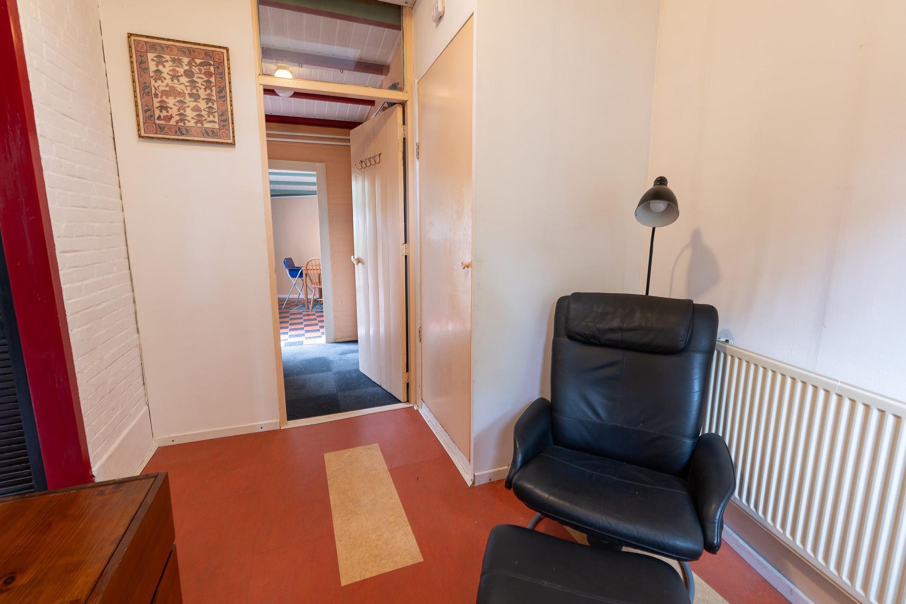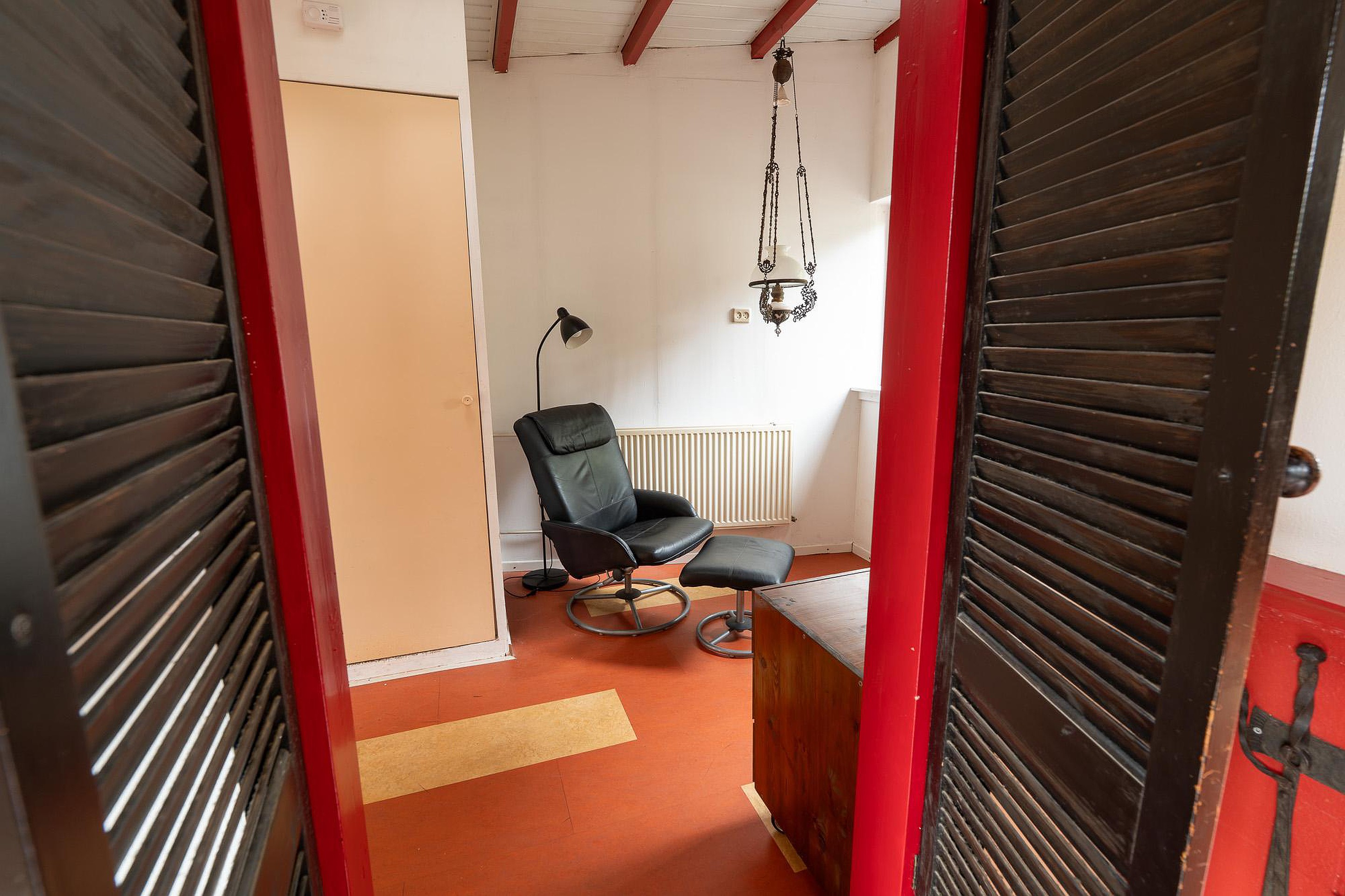 Eerste verdieping Via de trap in de hal bereikt u de eerste verdieping, een verdieping vol verrassingen en mogelijkheden. Hier bevinden zich twee slaapkamers en een opbergruimte. De hoofdslaapkamer op deze verdieping is relatief groot en voorzien van een wastafel, wat extra gemak biedt. De kamer is strak afgewerkt, maar heeft een uniek detail: de originele dakspanten zijn nog zichtbaar, wat een karakteristieke en robuuste sfeer geeft.