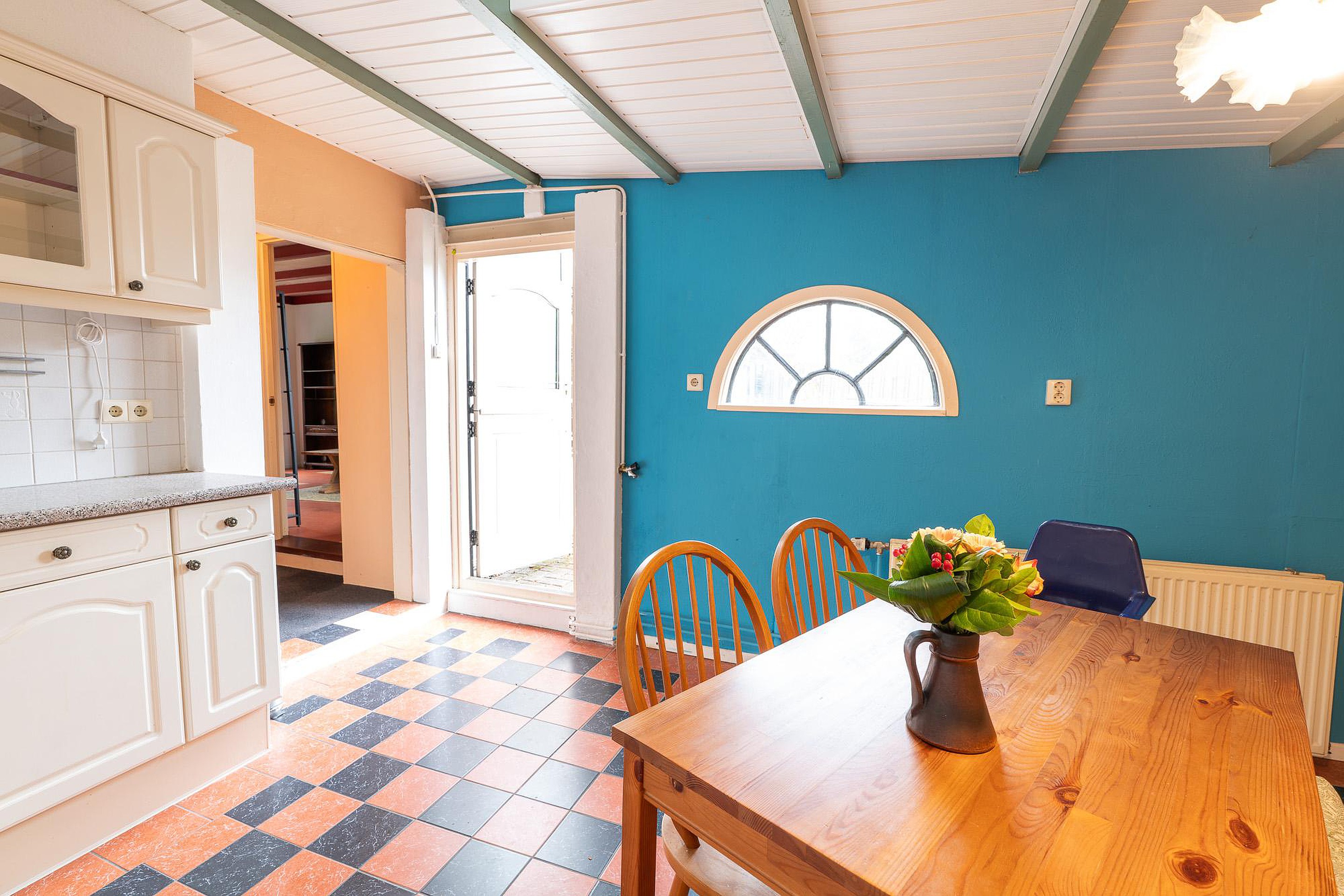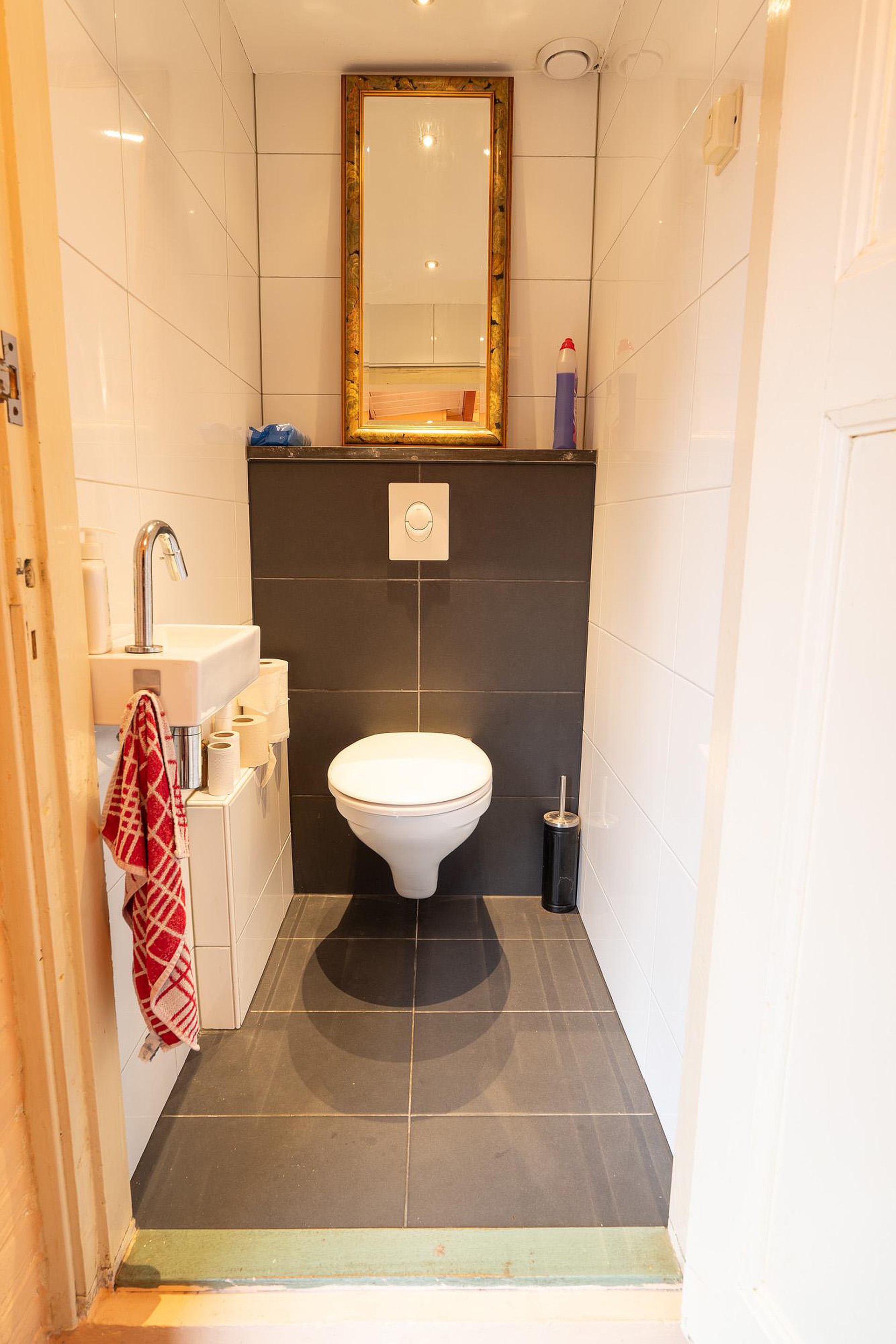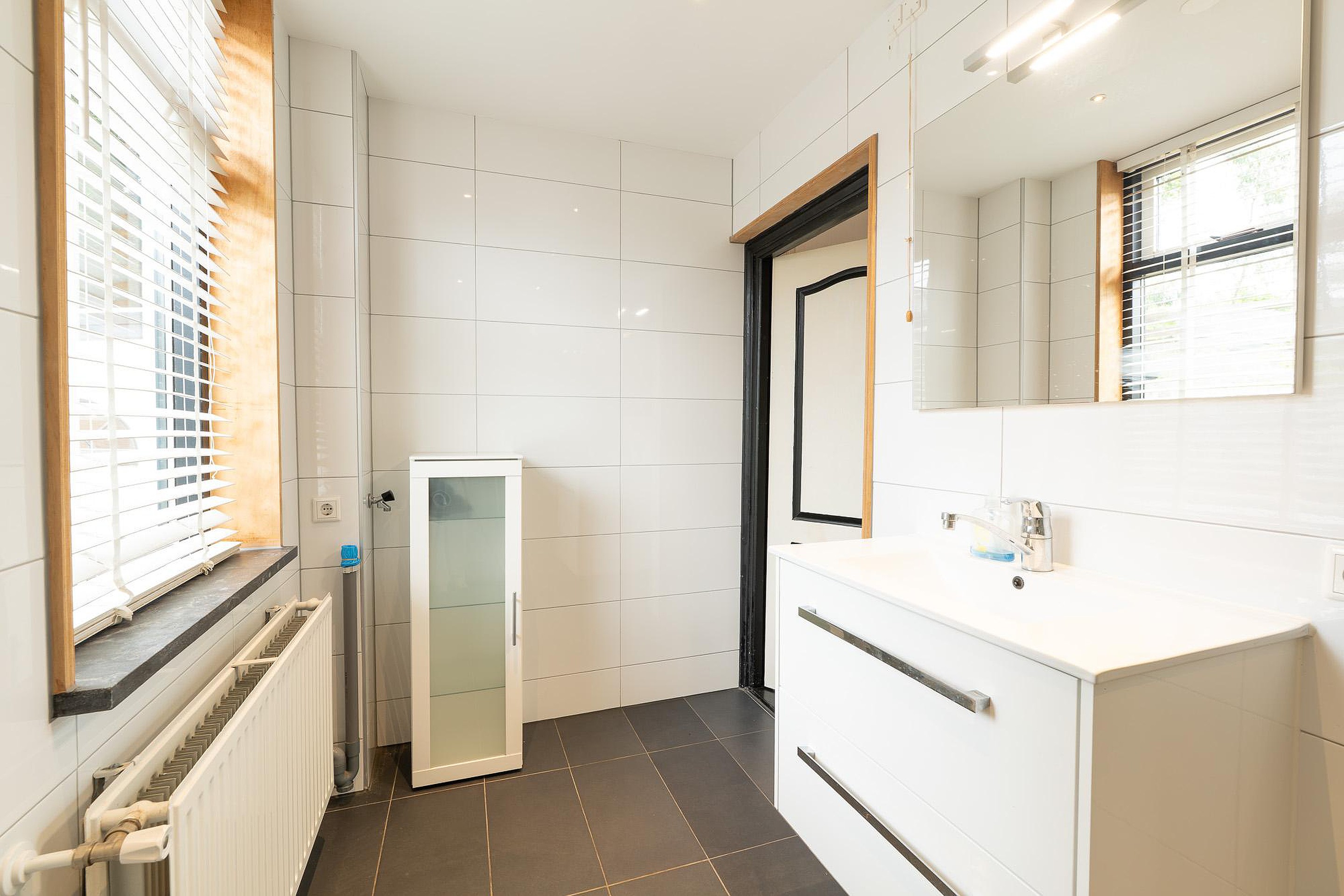 In het verlengde van deze kamer bevindt zich de keuken aan de achterkant van de woning. Deze keuken is gedateerd en biedt een uitstekende kans om deze ruimte volledig naar eigen smaak in te richten en zo het culinaire hart van de woning te creëren. De begane grond huisvest tevens de moderne badkamer, die onlangs volledig is vernieuwd. Met een inloopdouche, een strakke wastafel, een hangend toilet en de aansluiting voor een wasmachine, biedt deze ruimte alle comfort van nu. Naast de keuken is er een separaat, vernieuwd gastentoilet met een frisse en moderne uitstraling. De slaapkamer op de begane grond maakt het plaatje compleet en biedt het gemak van gelijkvloers wonen.