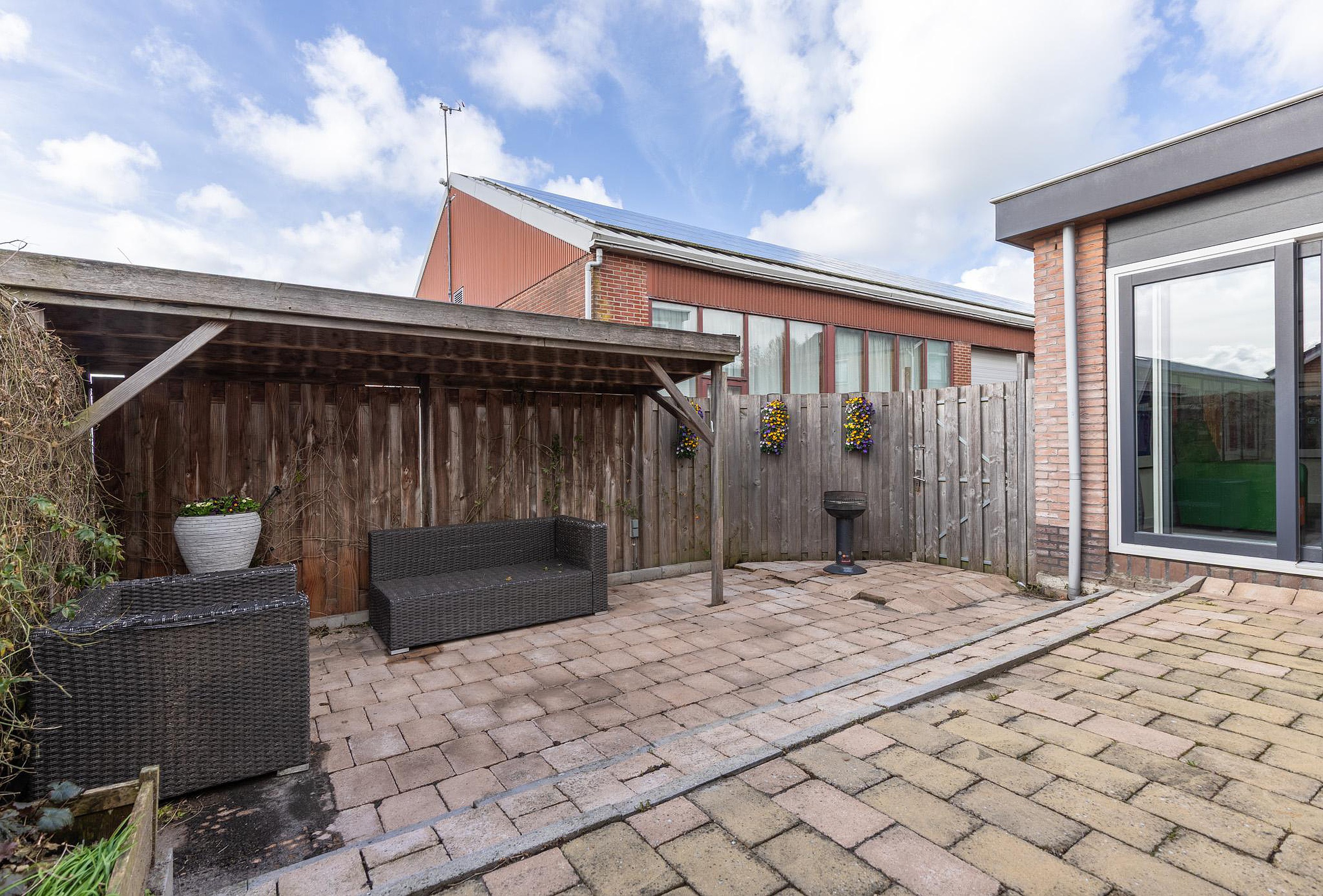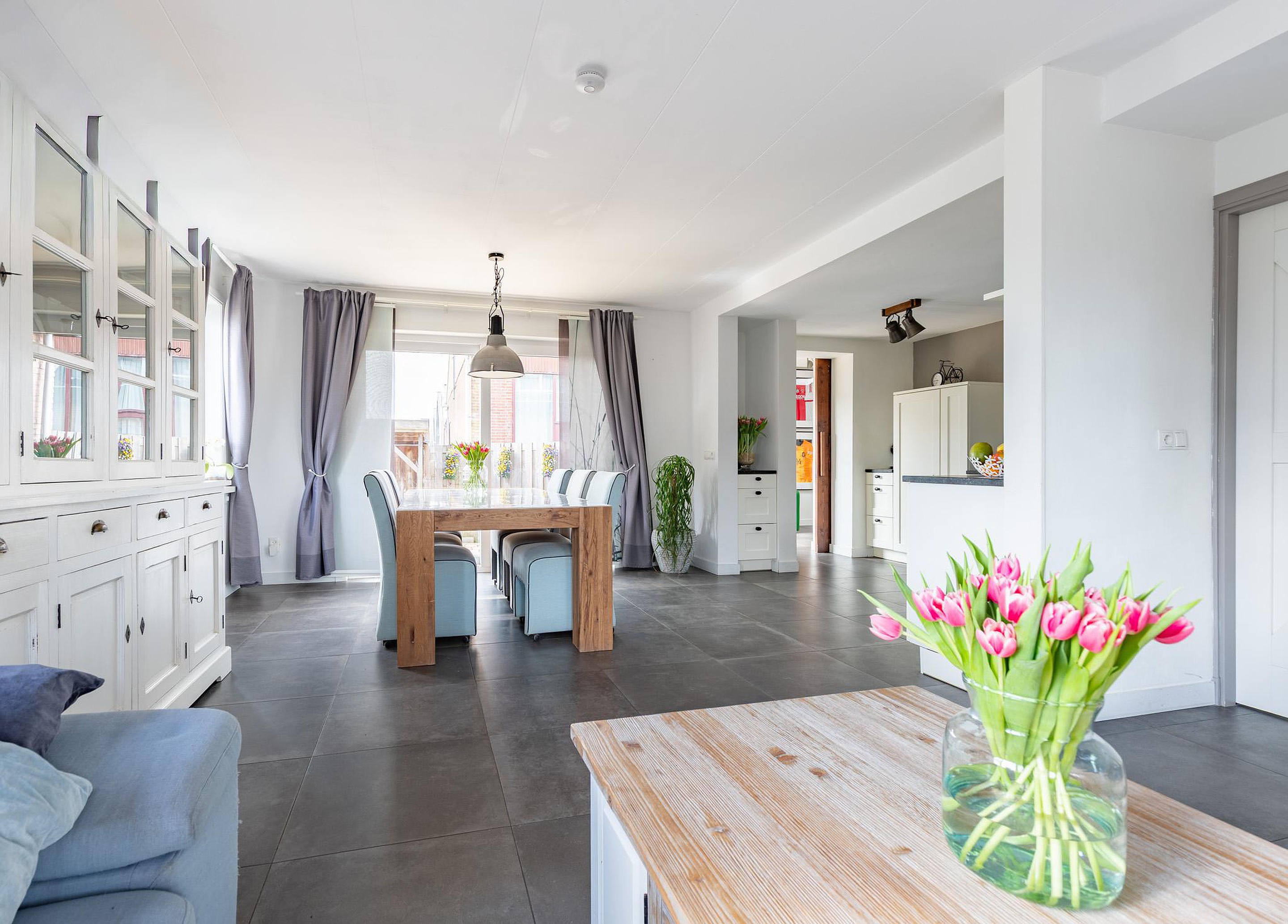 Vanuit de woonkamer geeft een schuifpui toegang tot de achtertuin, wat zorgt voor een prettige verbinding tussen binnen en buiten.
