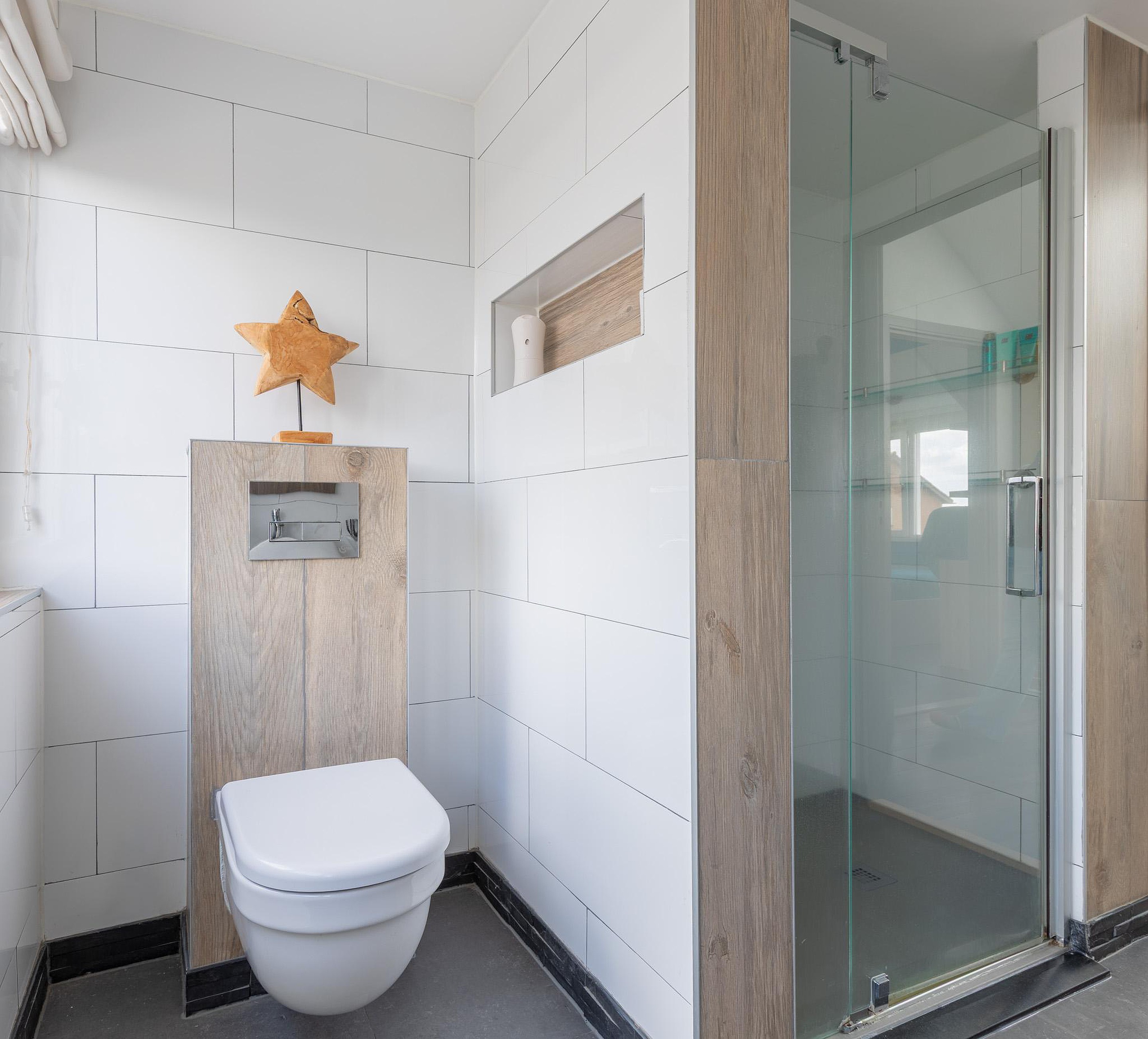 Aansluitend bevinden zich een separate toiletruimte, voorzien van een vrijhangend toilet met fonteitje, en een badkamer uitgerust met een ligbad, wastafel in meubel en een was-/droogopstelling.