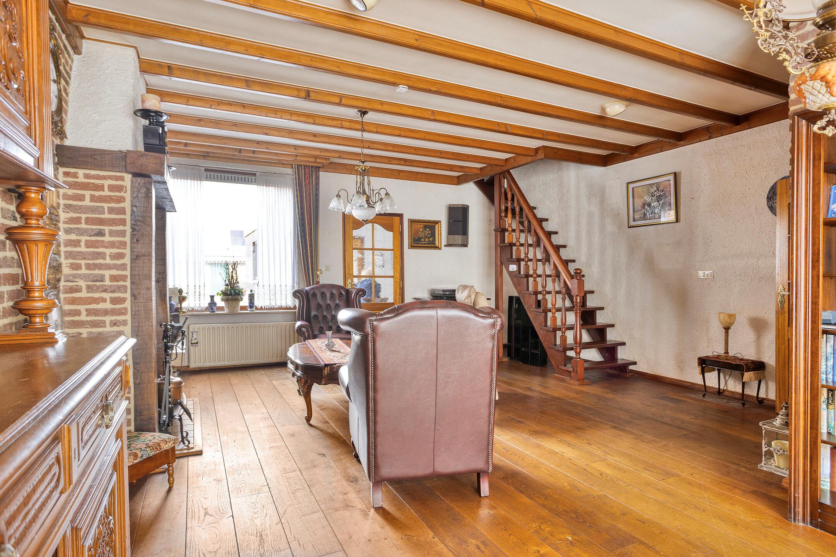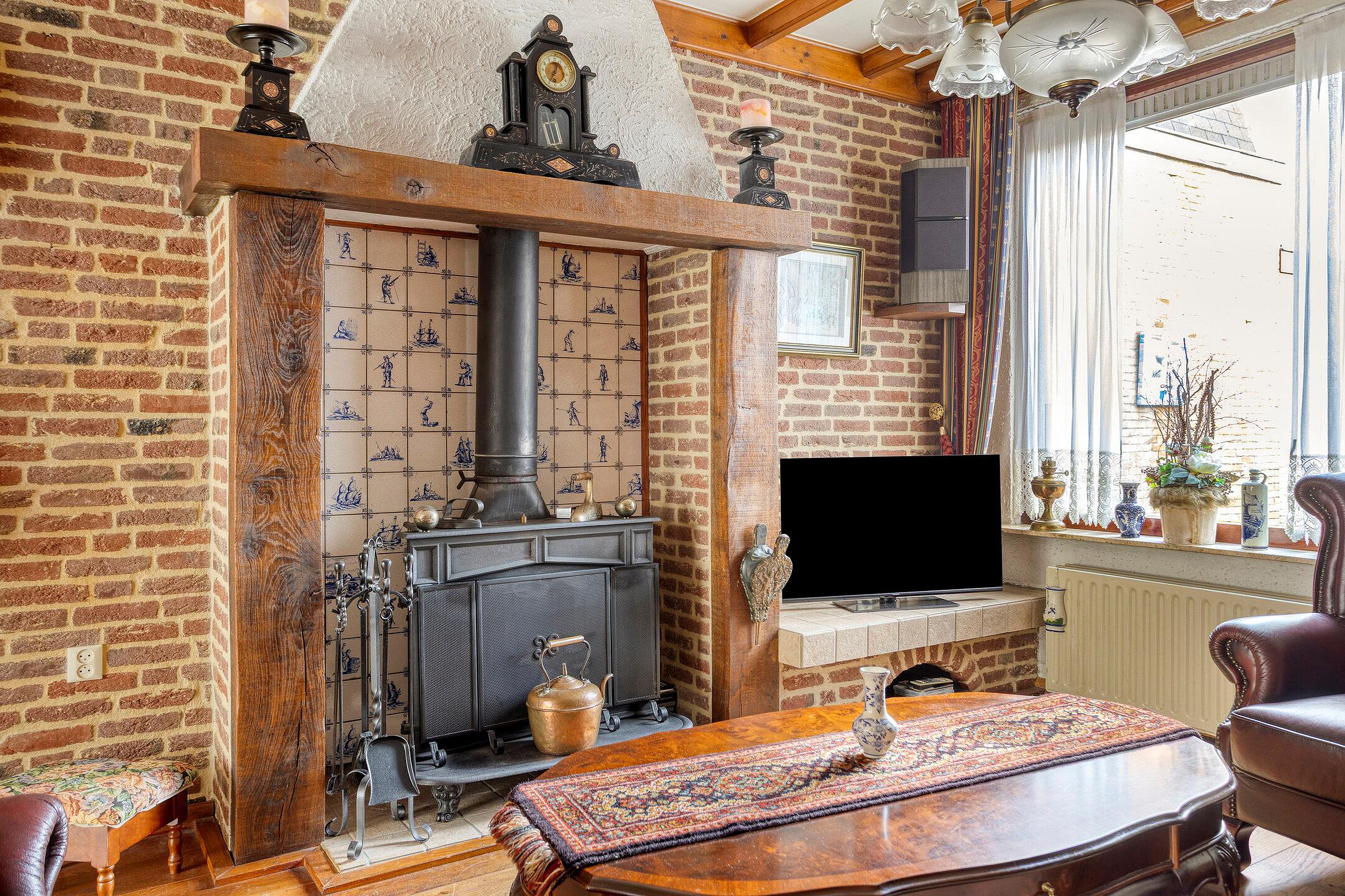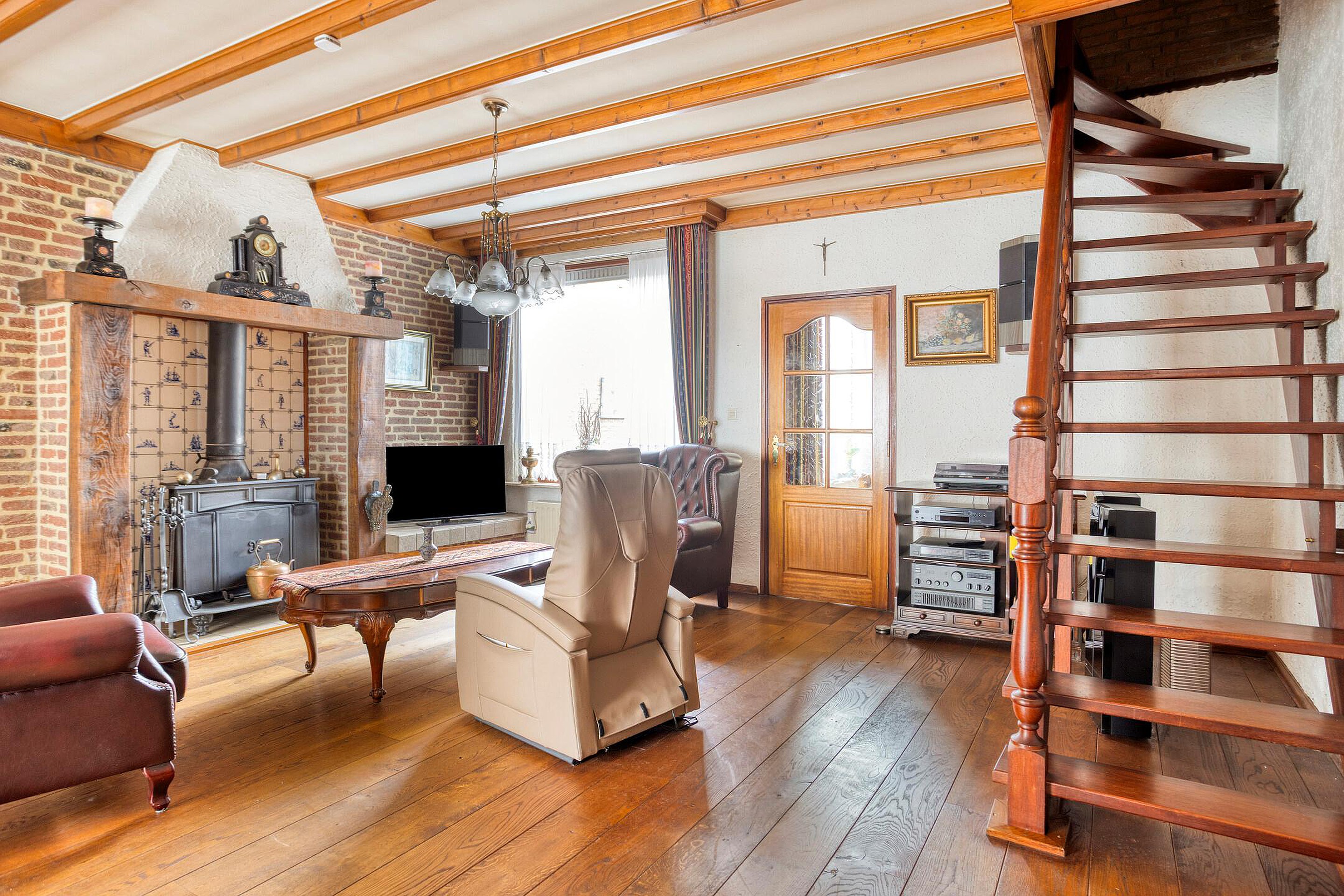 Bij binnenkomst valt direct de sfeervolle woonkamer op, voorzien van een fraaie schouw met houtkachel en een massief houten vloer – een heerlijke plek om te ontspannen. De open trap naar de verdieping geeft de ruimte extra karakter.