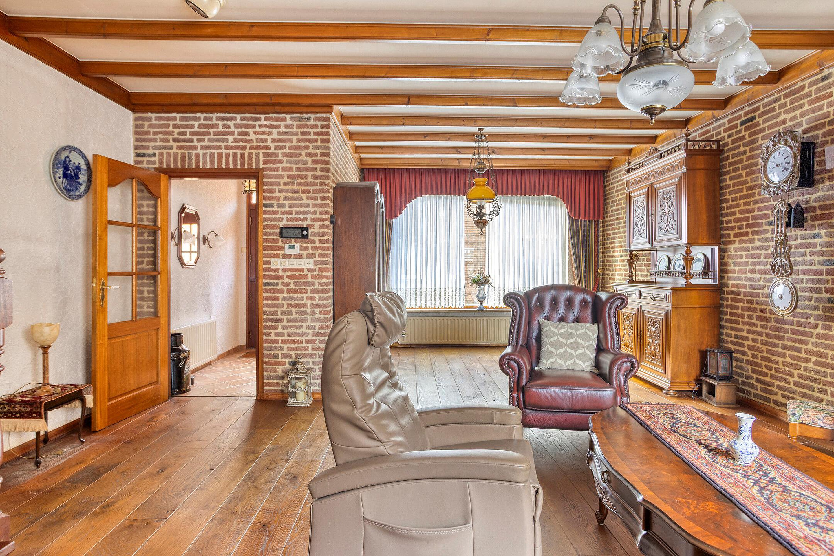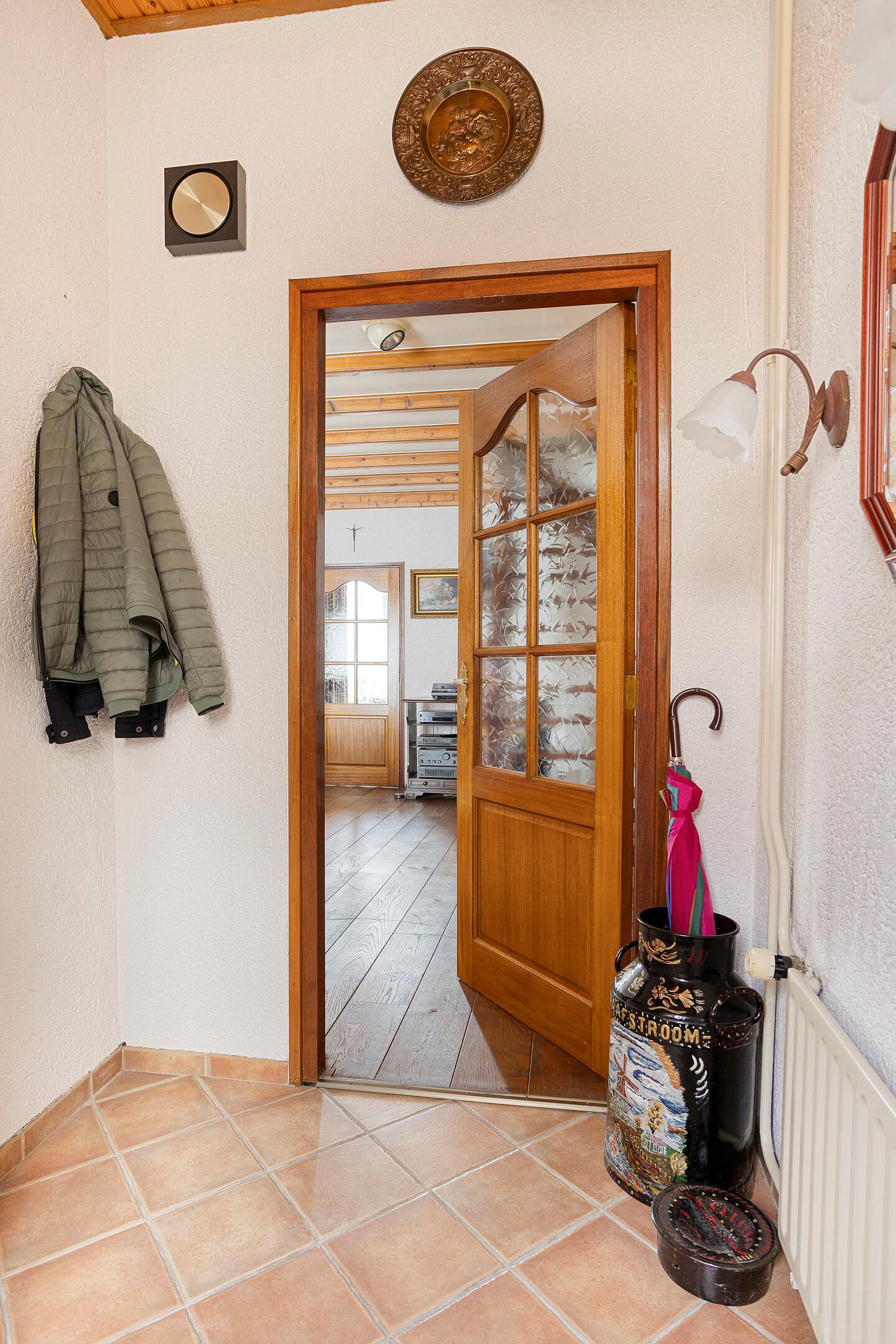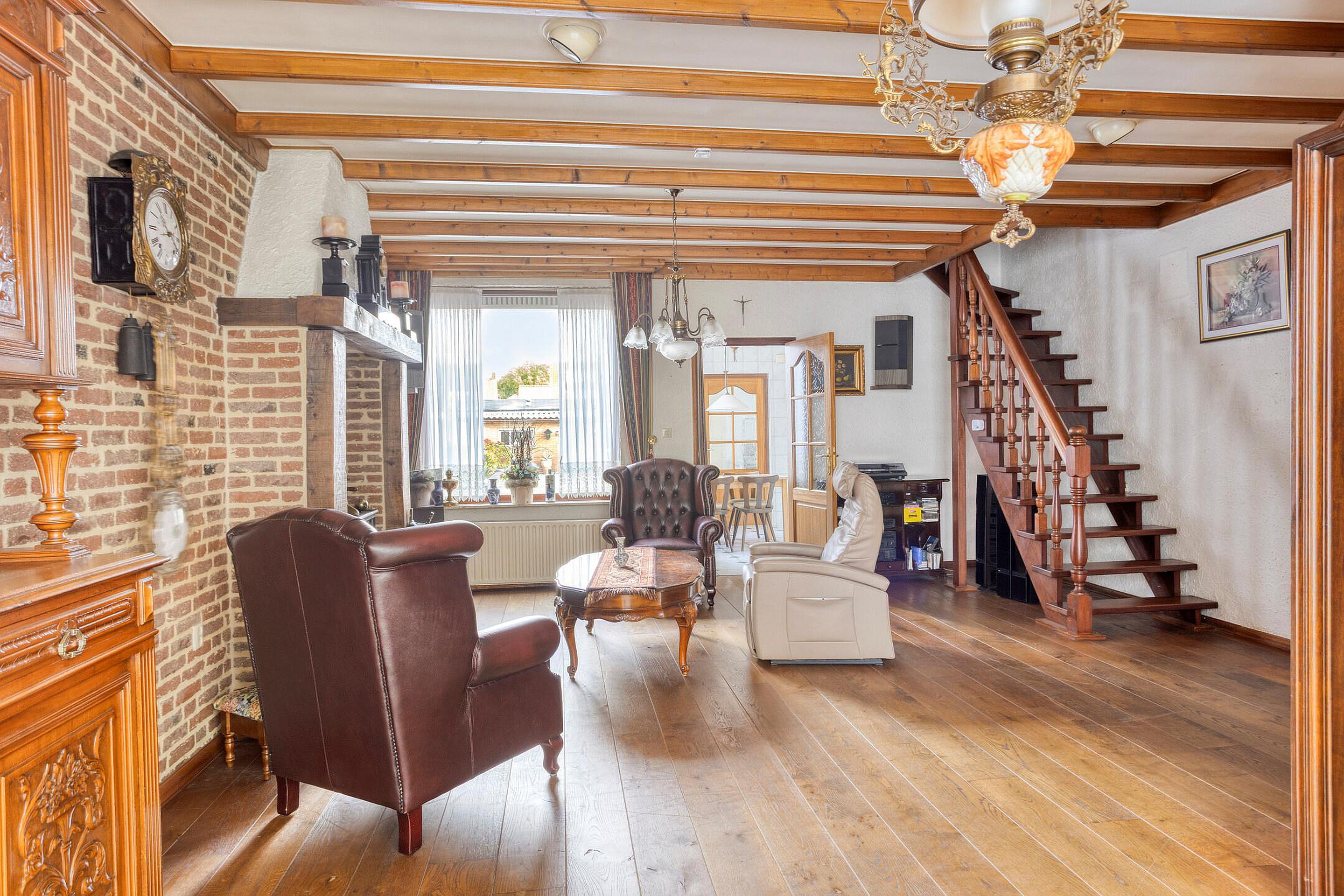 Bij binnenkomst valt direct de sfeervolle woonkamer op, voorzien van een fraaie schouw met houtkachel en een massief houten vloer – een heerlijke plek om te ontspannen. De open trap naar de verdieping geeft de ruimte extra karakter.