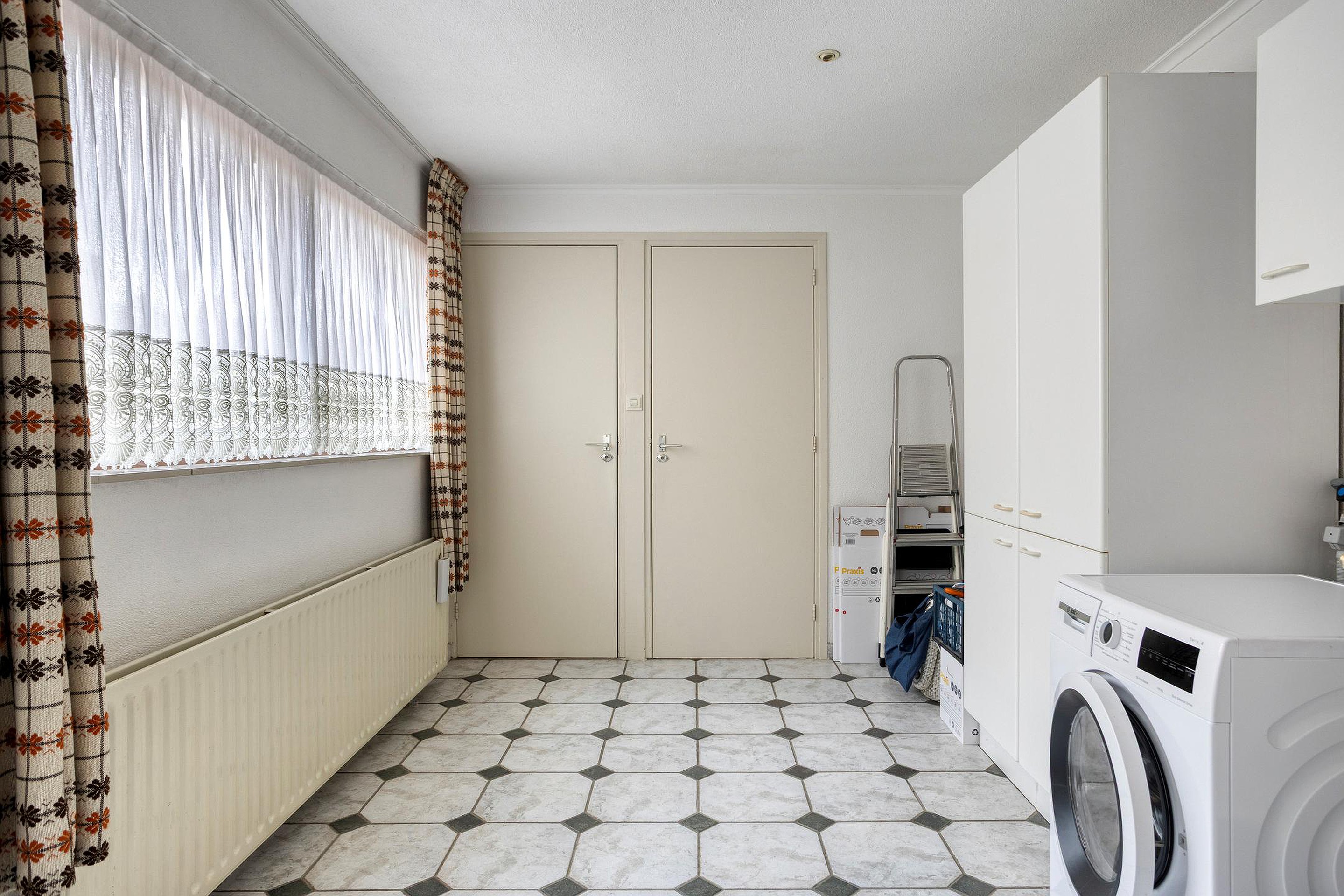 Aansluitend bevindt zich de royale bijkeuken met aansluitingen voor wasapparatuur. Vanuit de bijkeuken bereikt u zowel de badkamer als de toiletruimte.