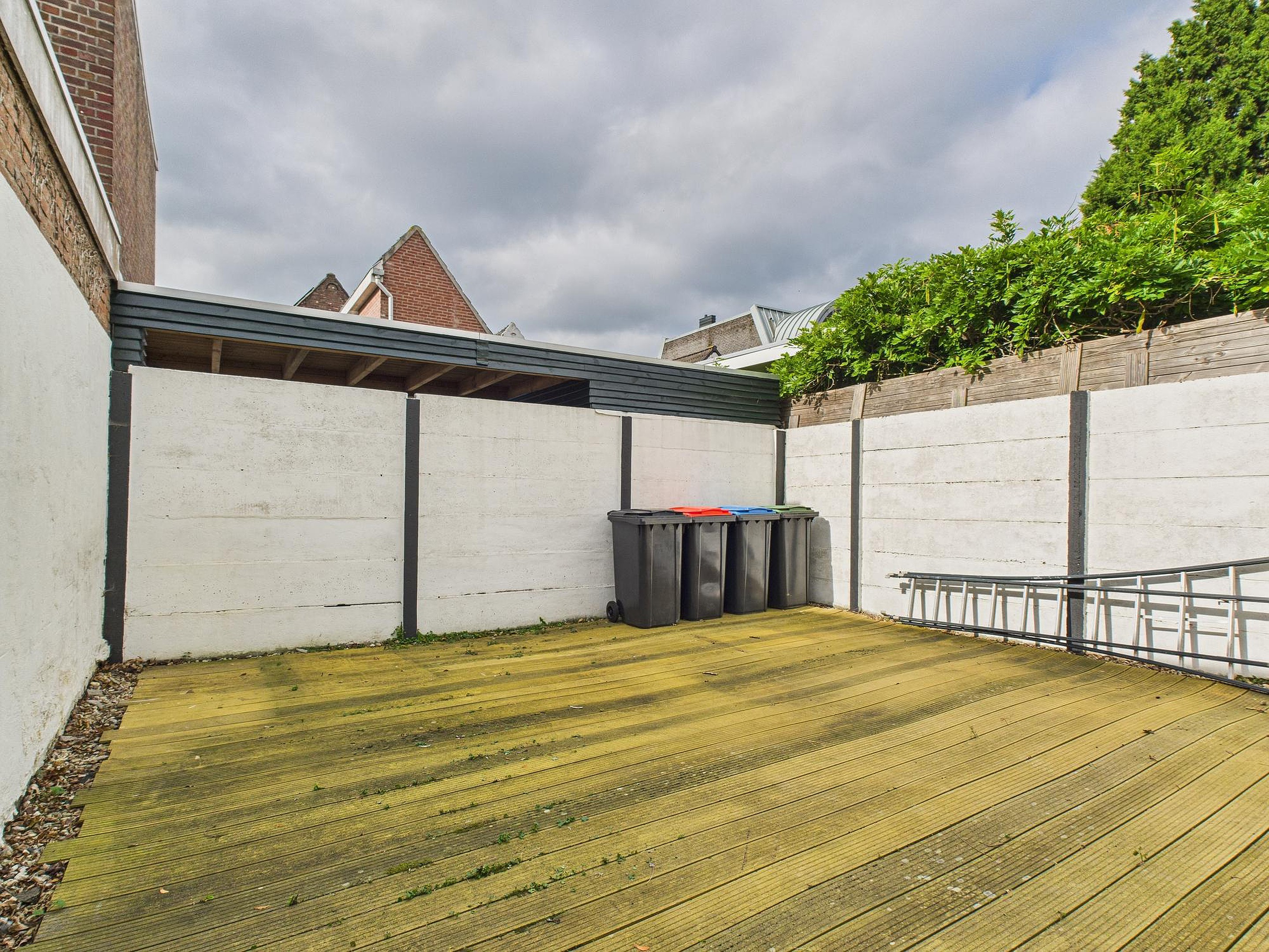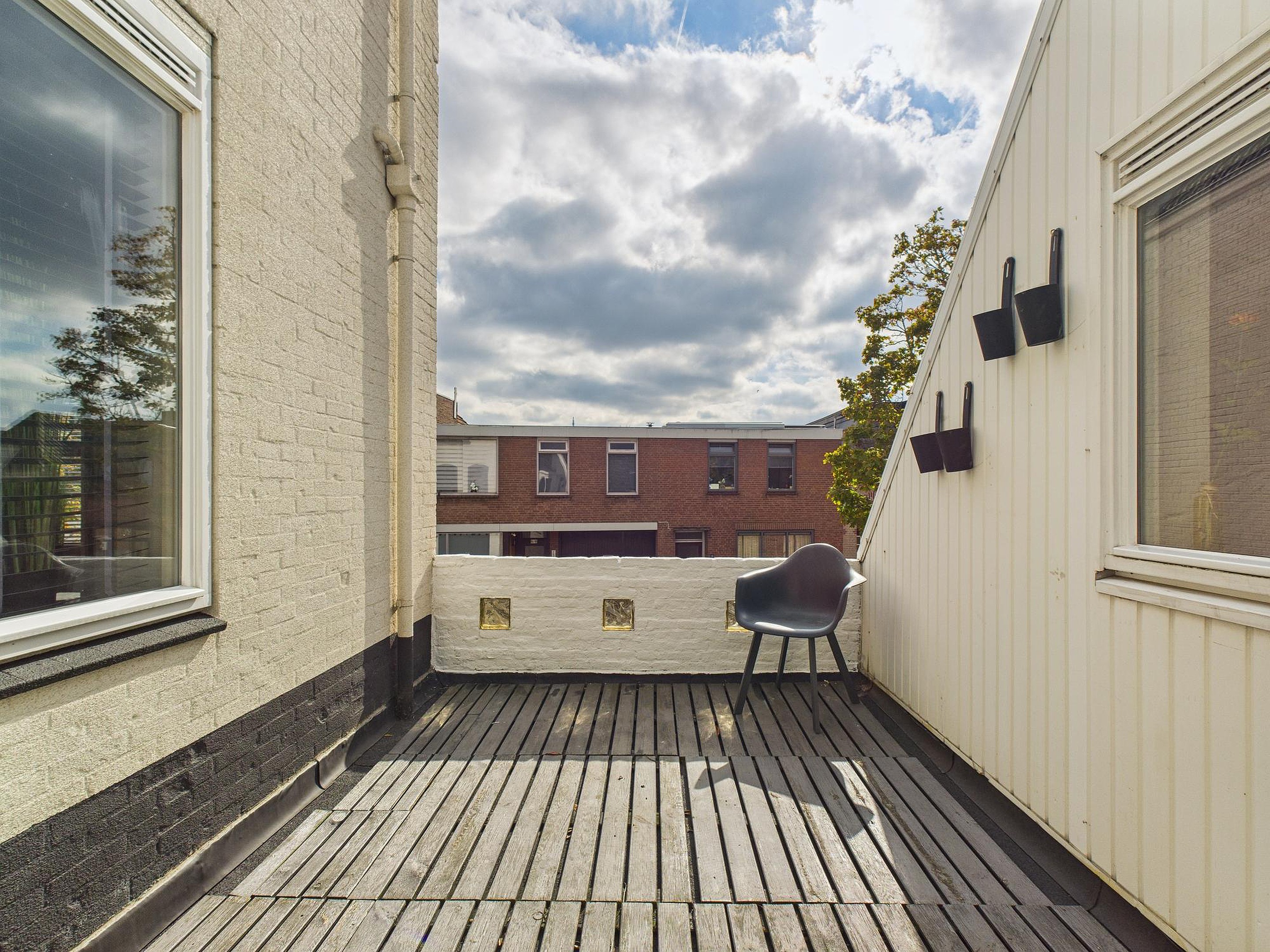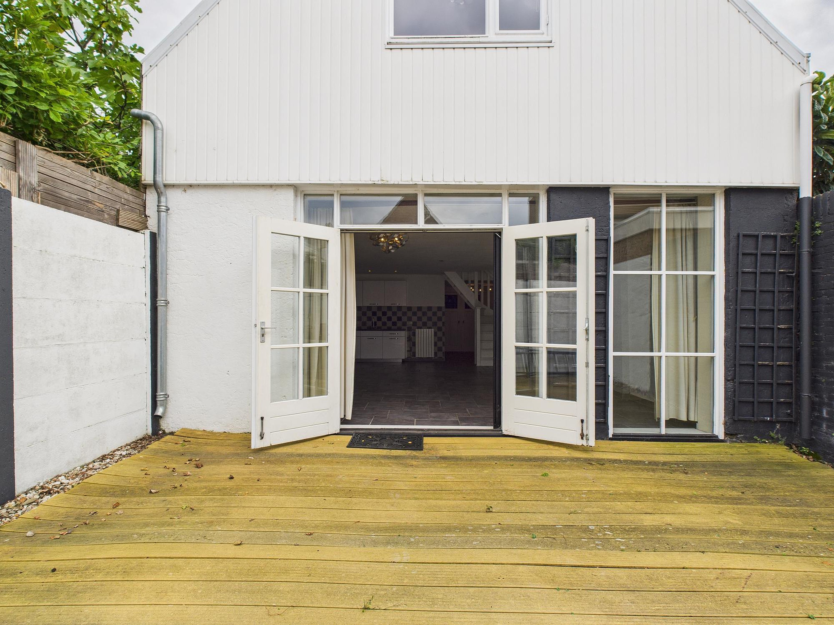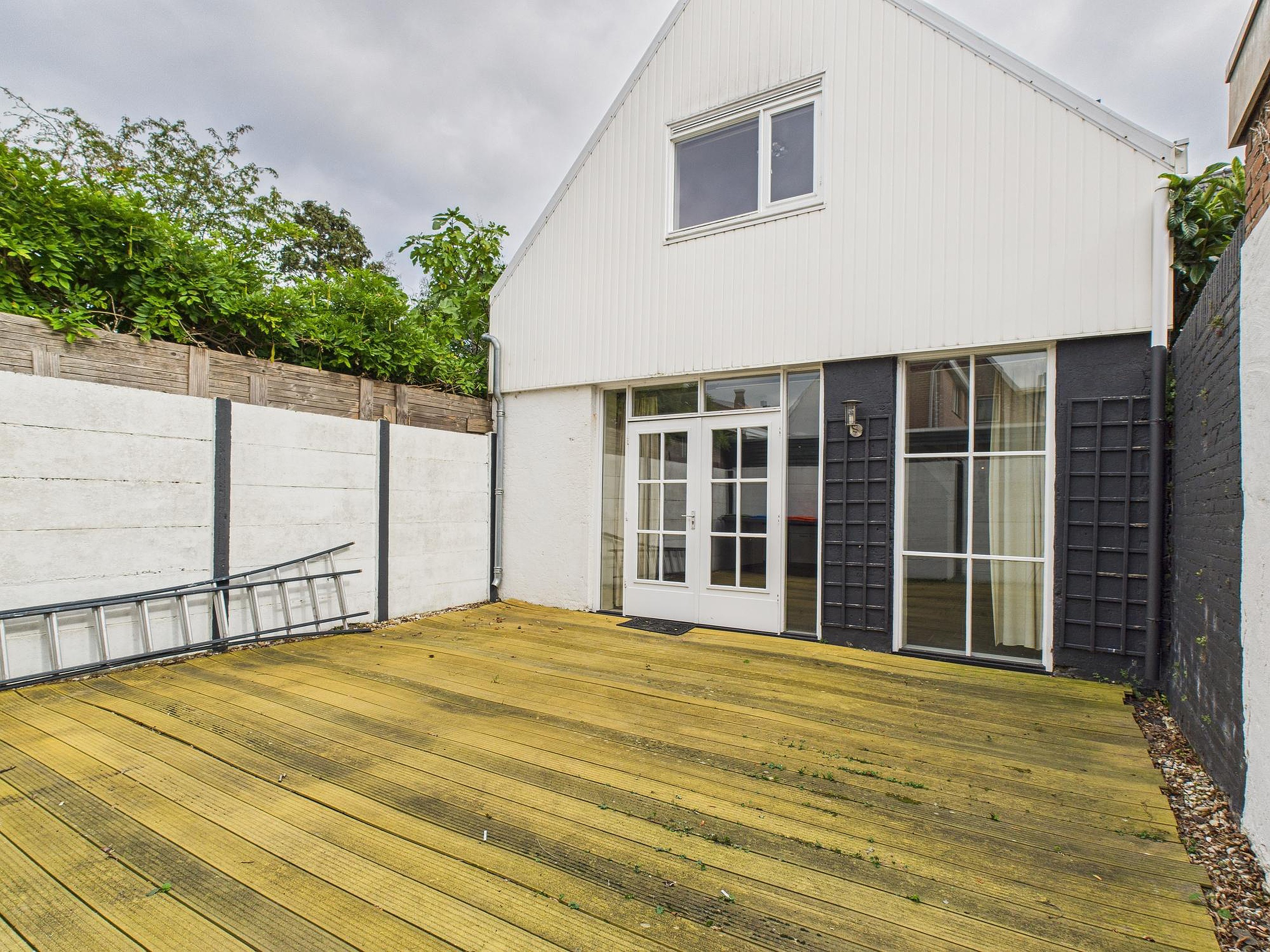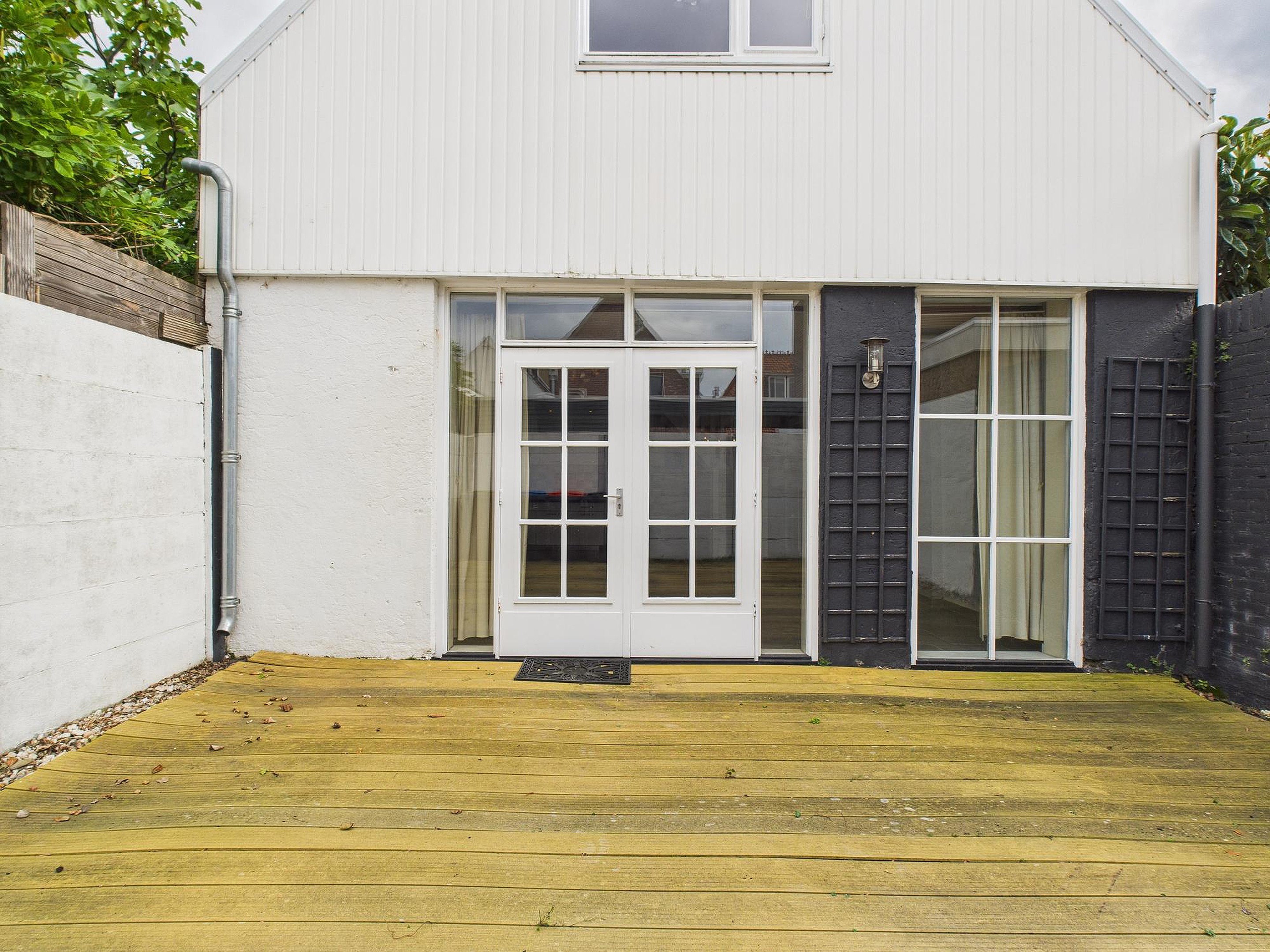 De achtertuin – eigenlijk meer een sfeervolle patio – ligt op het westen. Met een fijn vlonderterras en veel privacy is dit een heerlijke plek om te genieten van de middag- en avondzon.