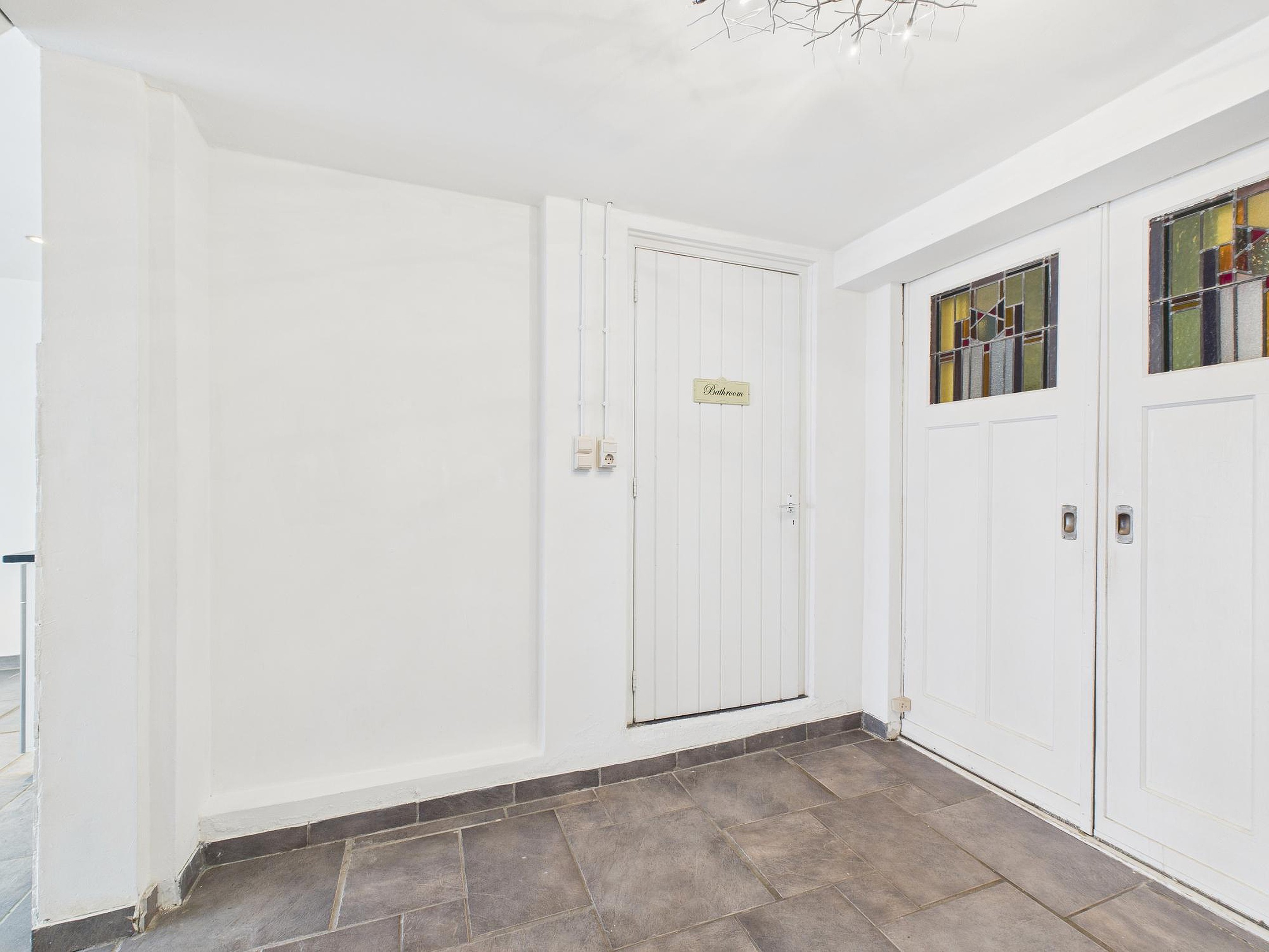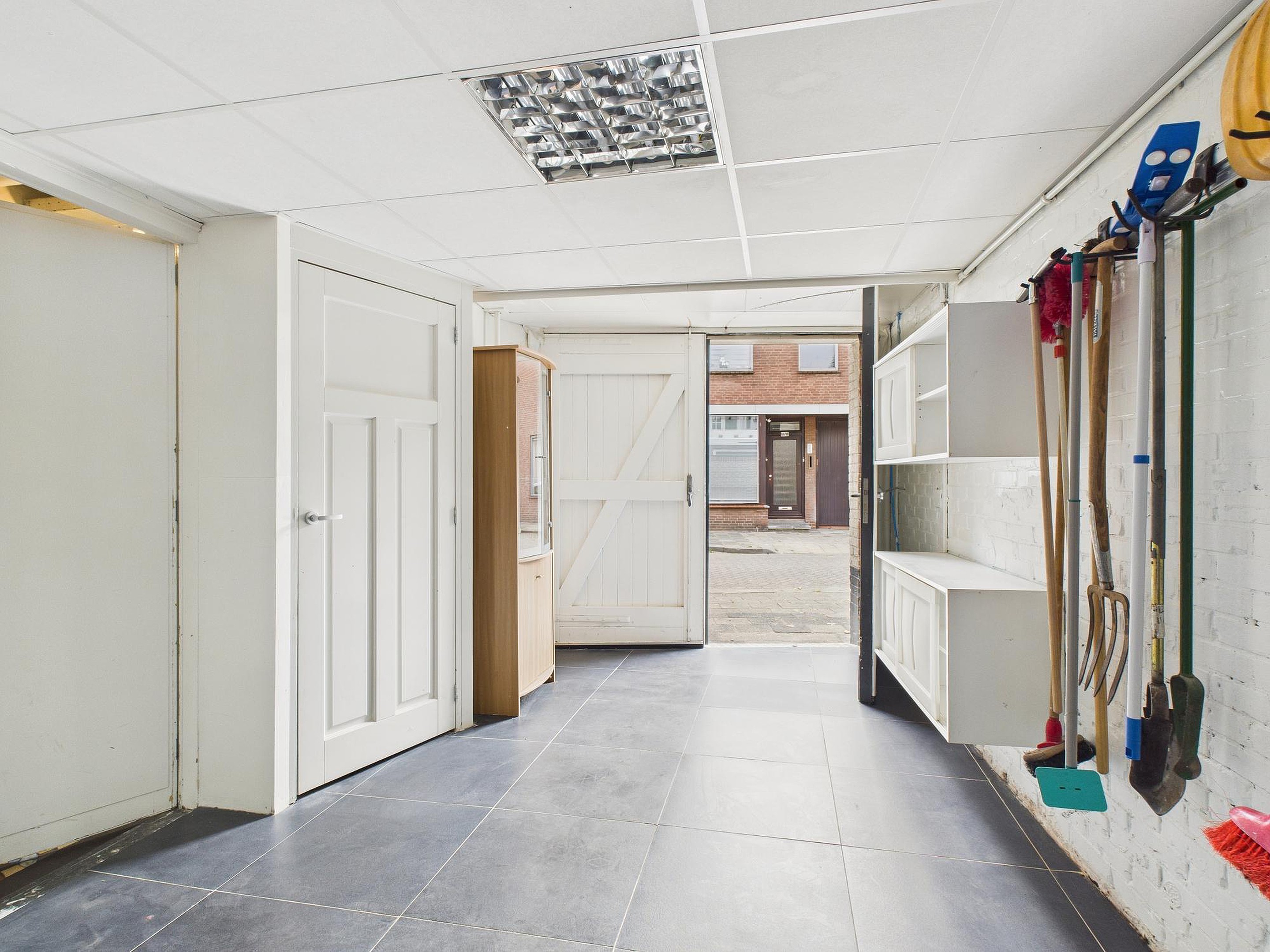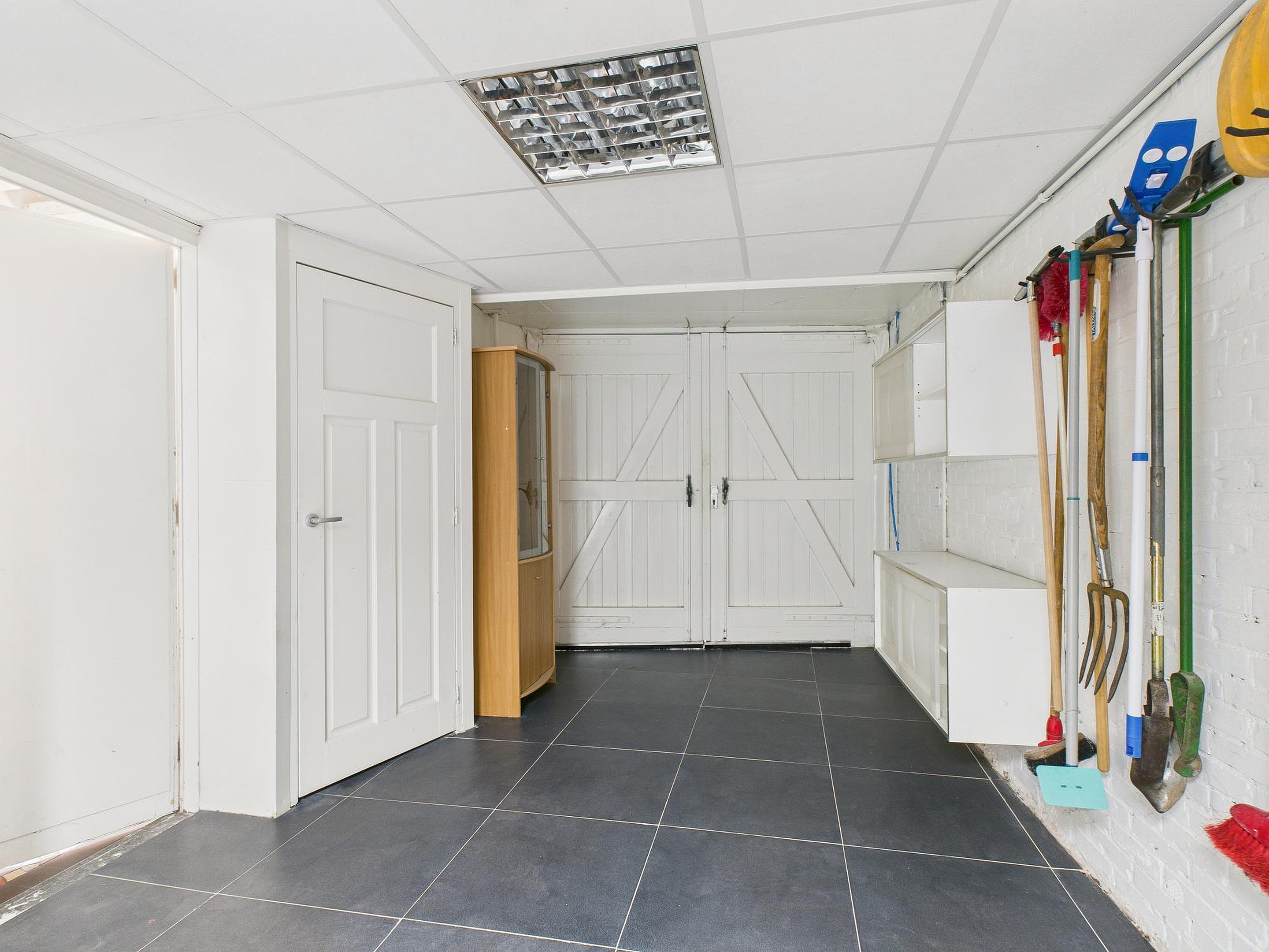 Bij binnenkomst kom je in een portaal met de trapopgang. Vanuit hier stap je in de inpandige garage/berging, die is voorzien van royale vaste kastruimte met aansluitingen voor wasmachine en droger. Daarnaast vind je hier de meterkast en extra bergruimte.