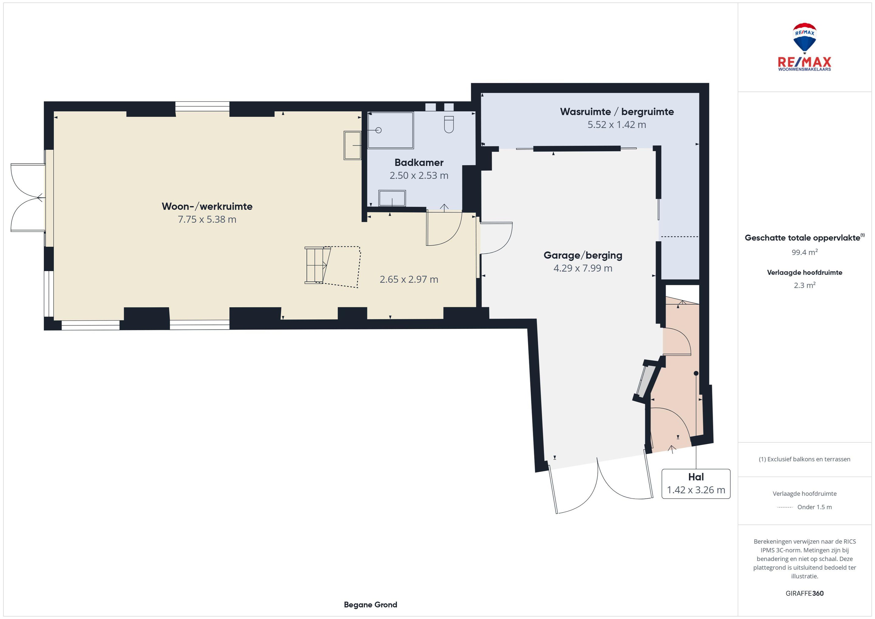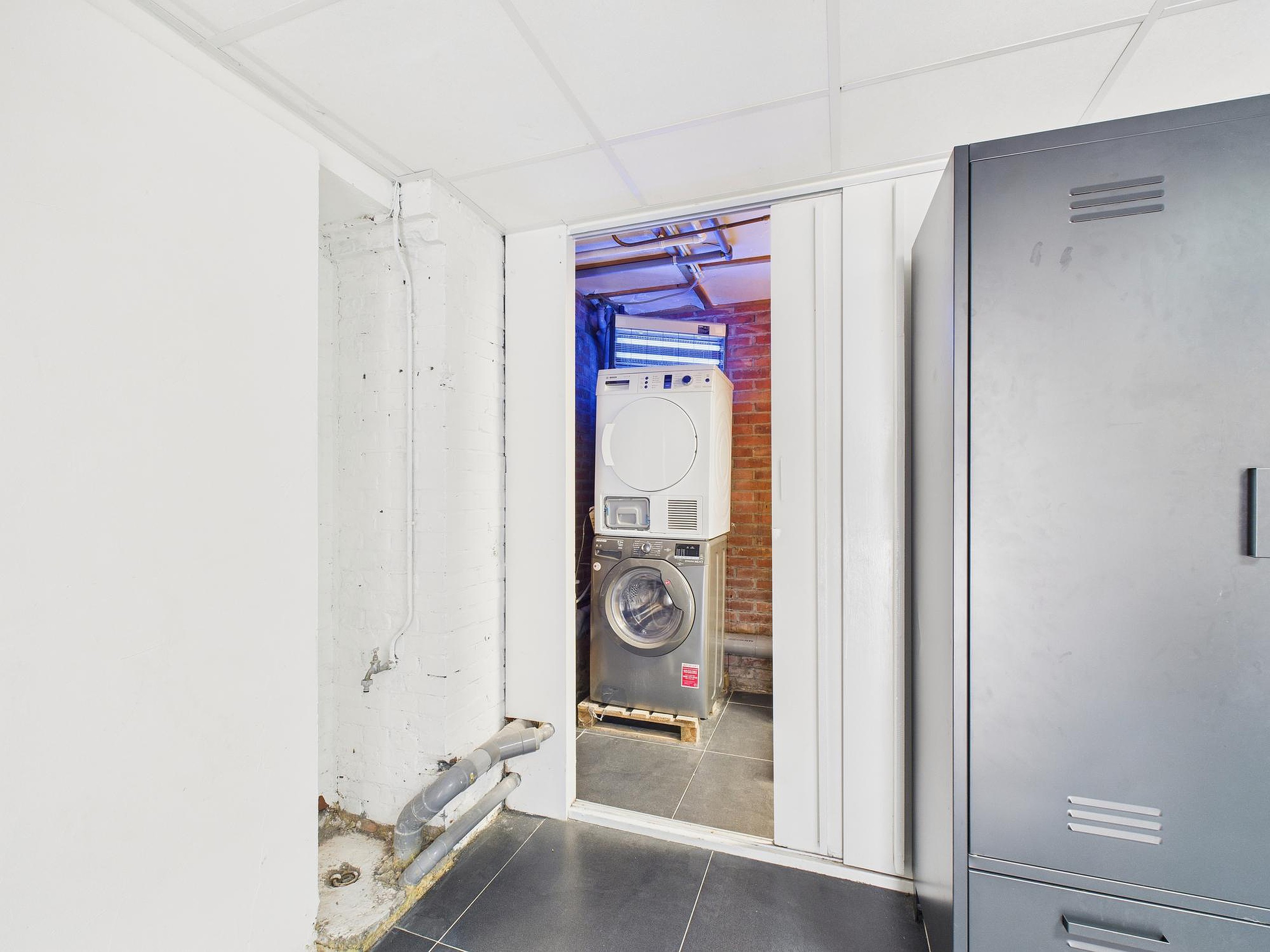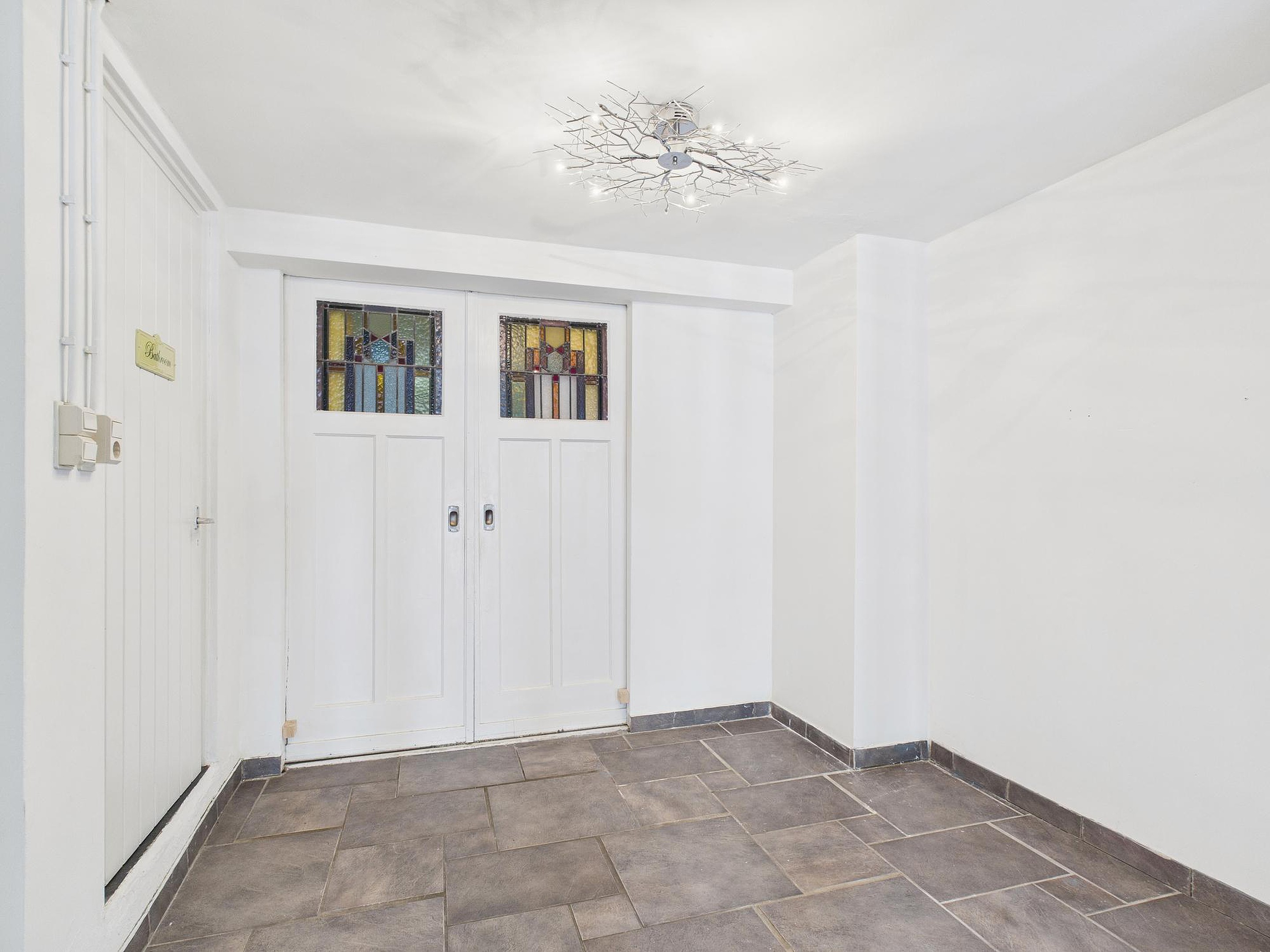 Bij binnenkomst kom je in een portaal met de trapopgang. Vanuit hier stap je in de inpandige garage/berging, die is voorzien van royale vaste kastruimte met aansluitingen voor wasmachine en droger. Daarnaast vind je hier de meterkast en extra bergruimte.