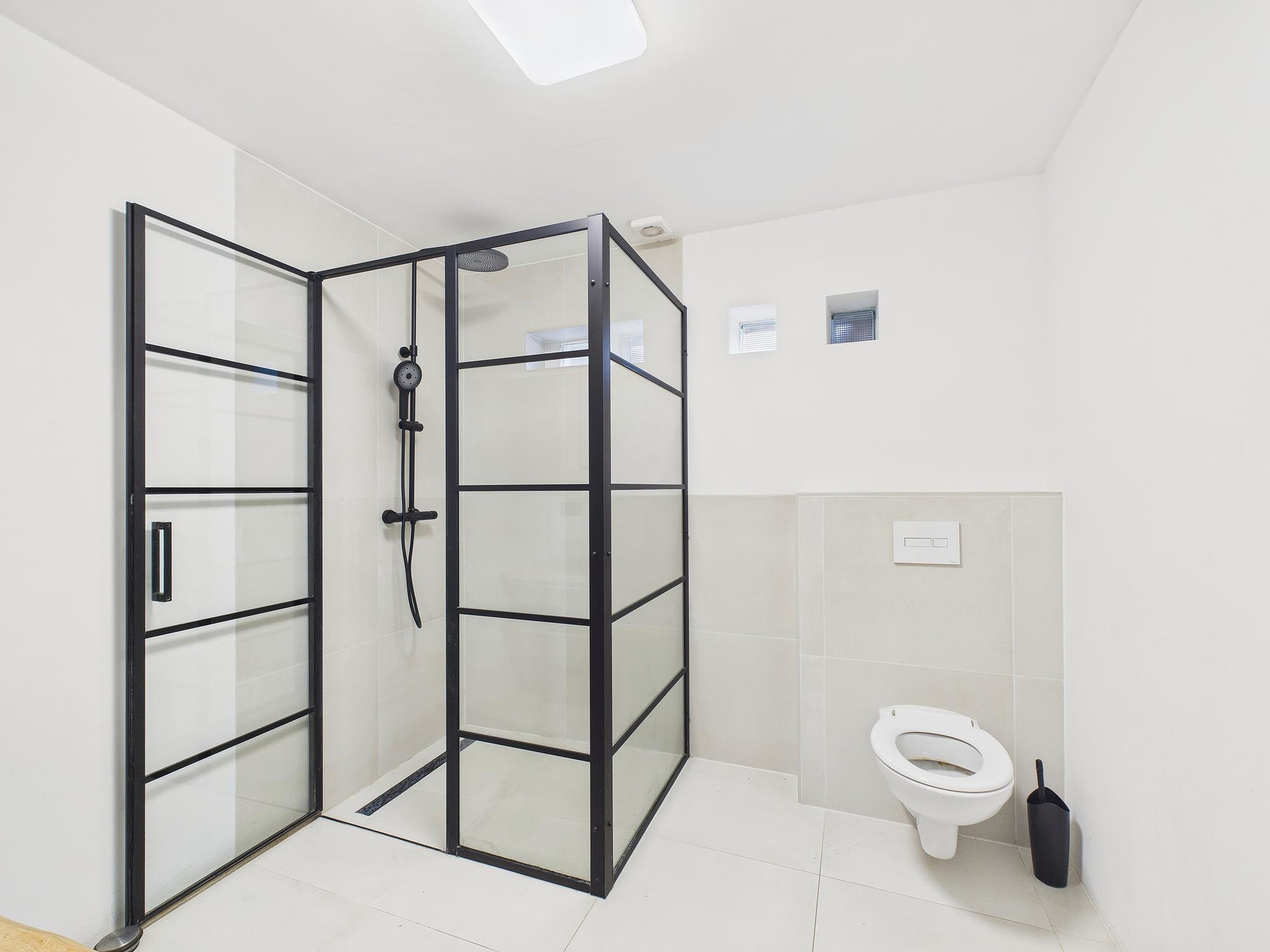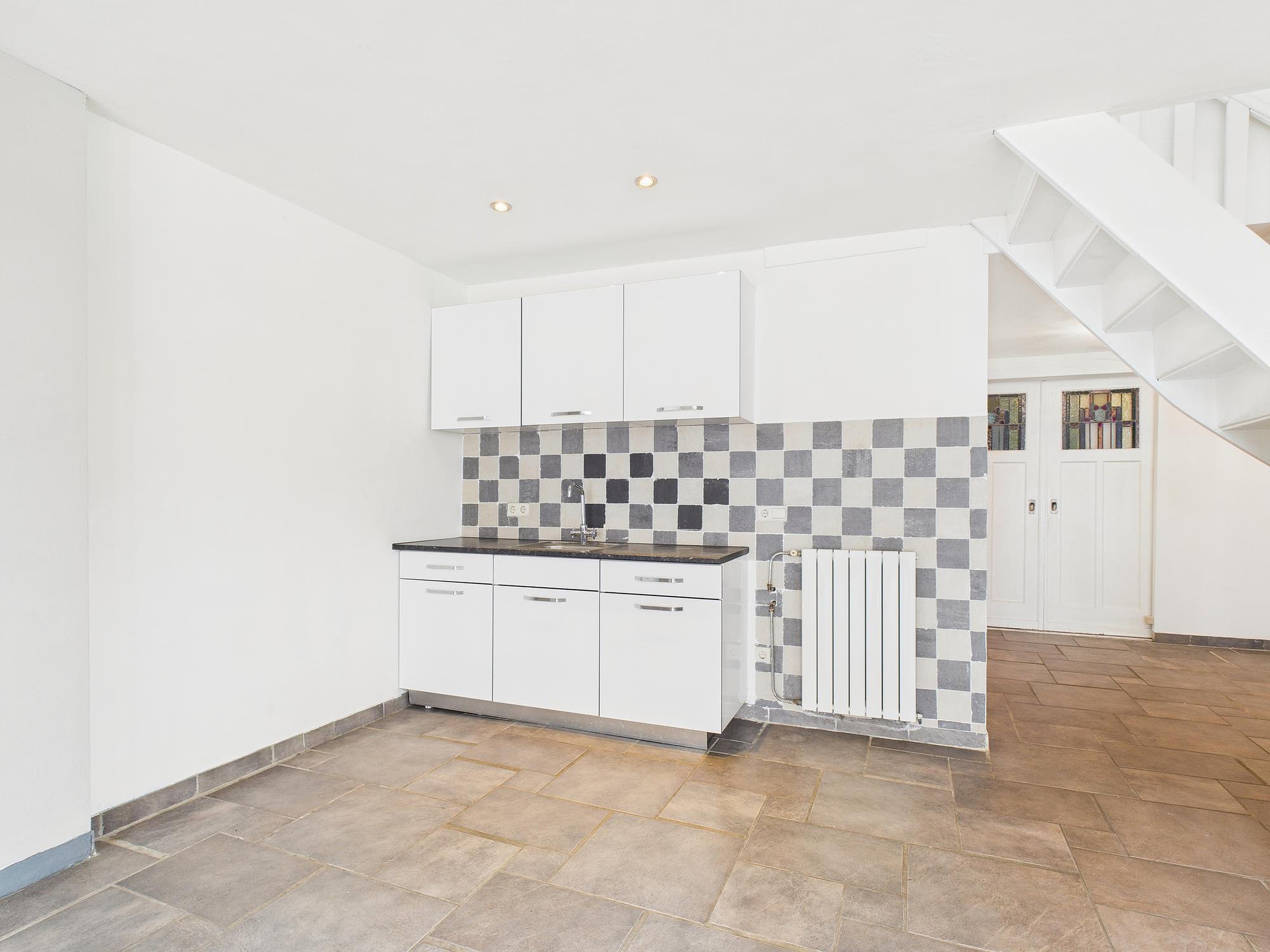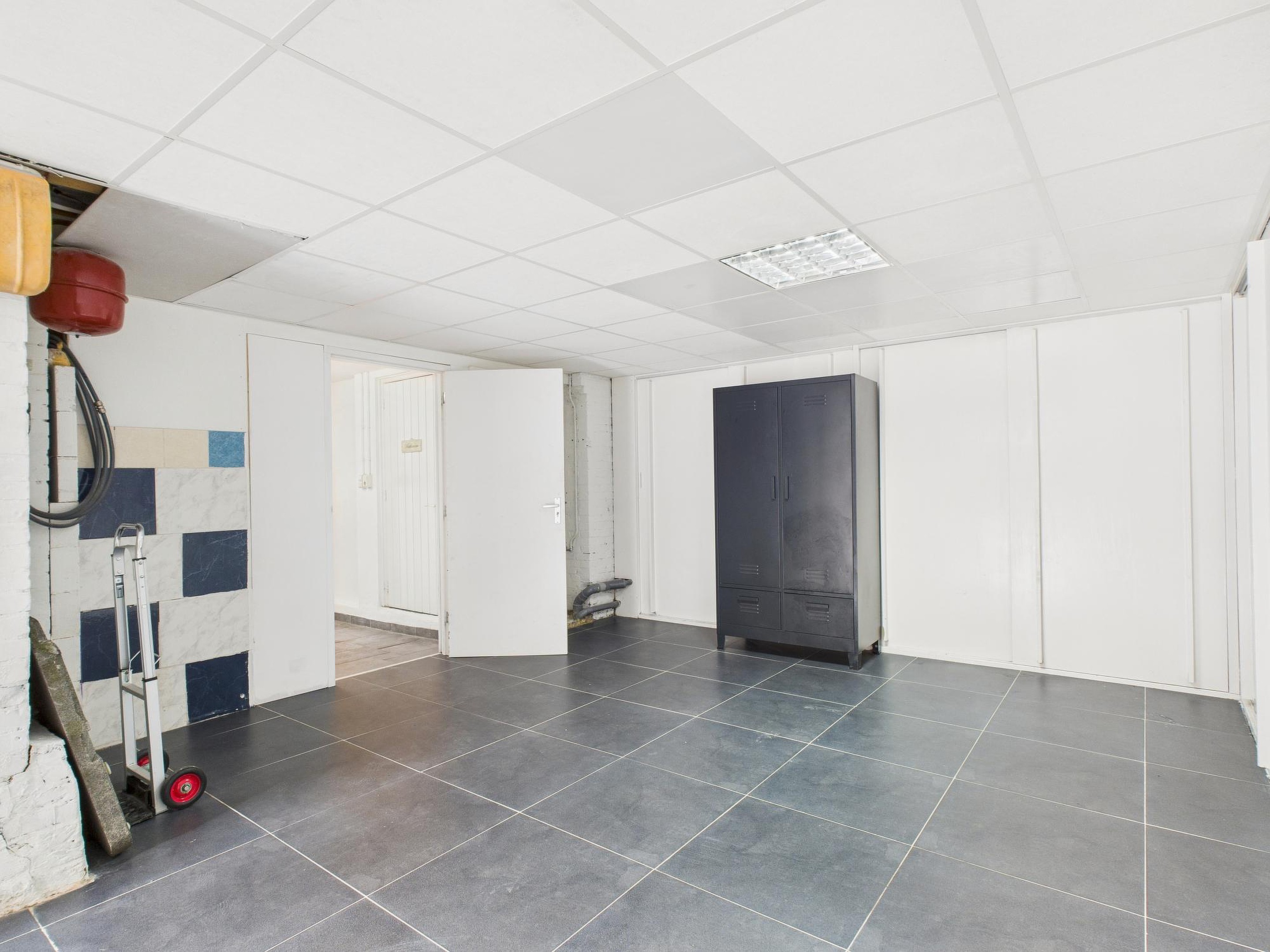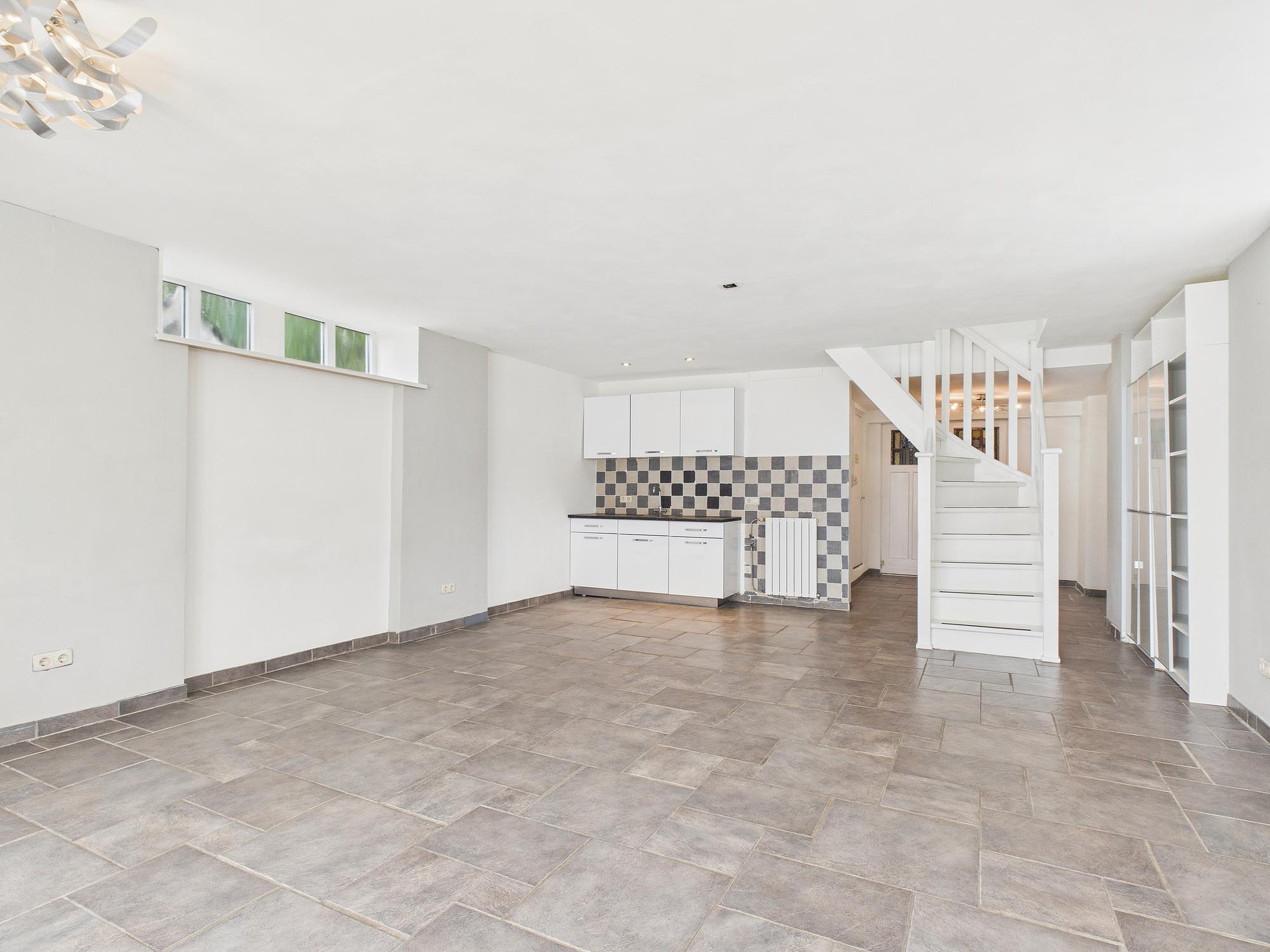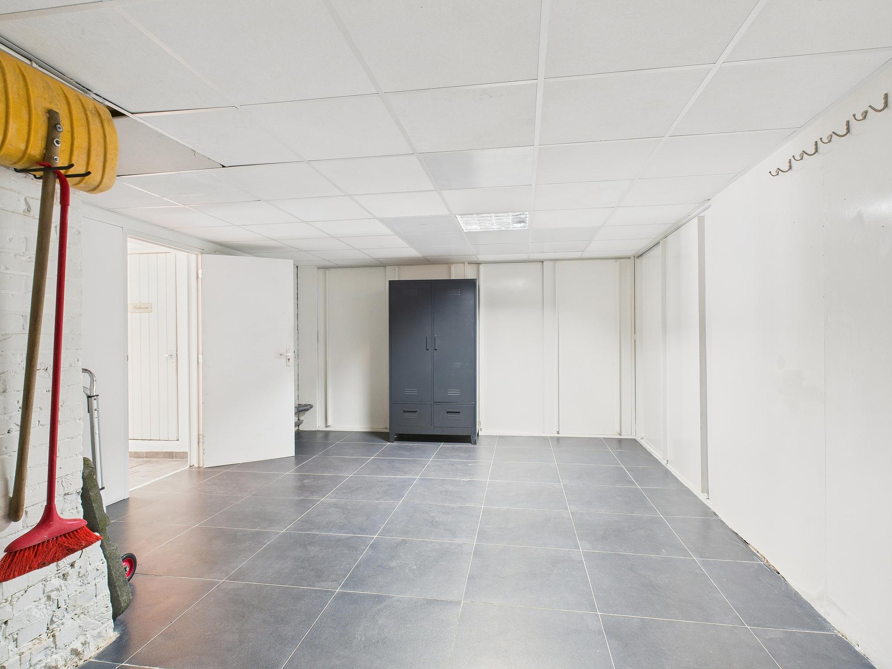 Aan de achterzijde bevindt zich een ruime praktijk- of woonruimte met tegelvloer, trapopgang, tuindeuren, keukenblok en diverse aansluitingen. Deze ruimte is ideaal als kantoor, atelier of woon-/hobbykamer. Verder is er op de begane grond een volledig betegelde badkamer met wastafel, douche en het eerste toilet.