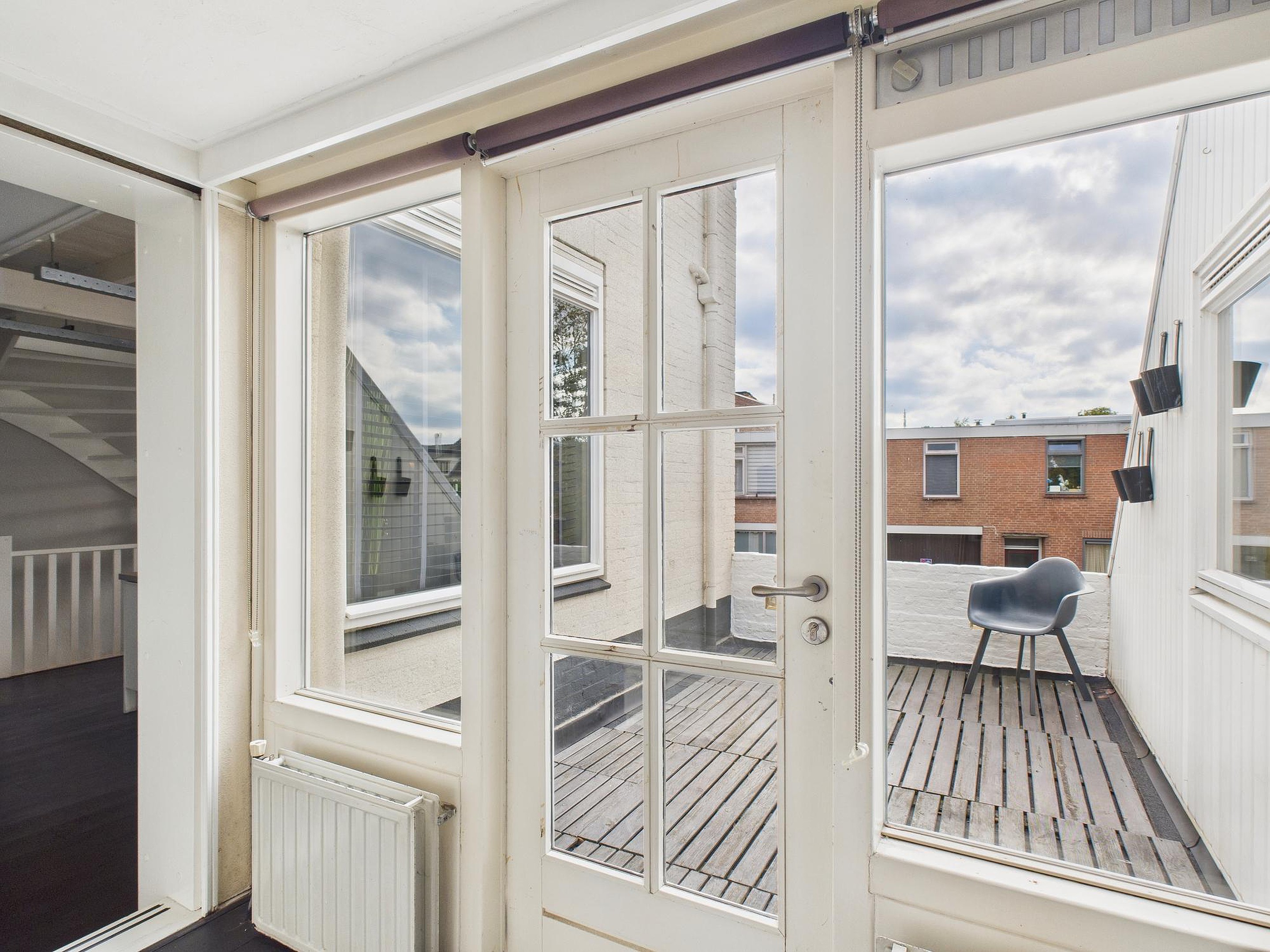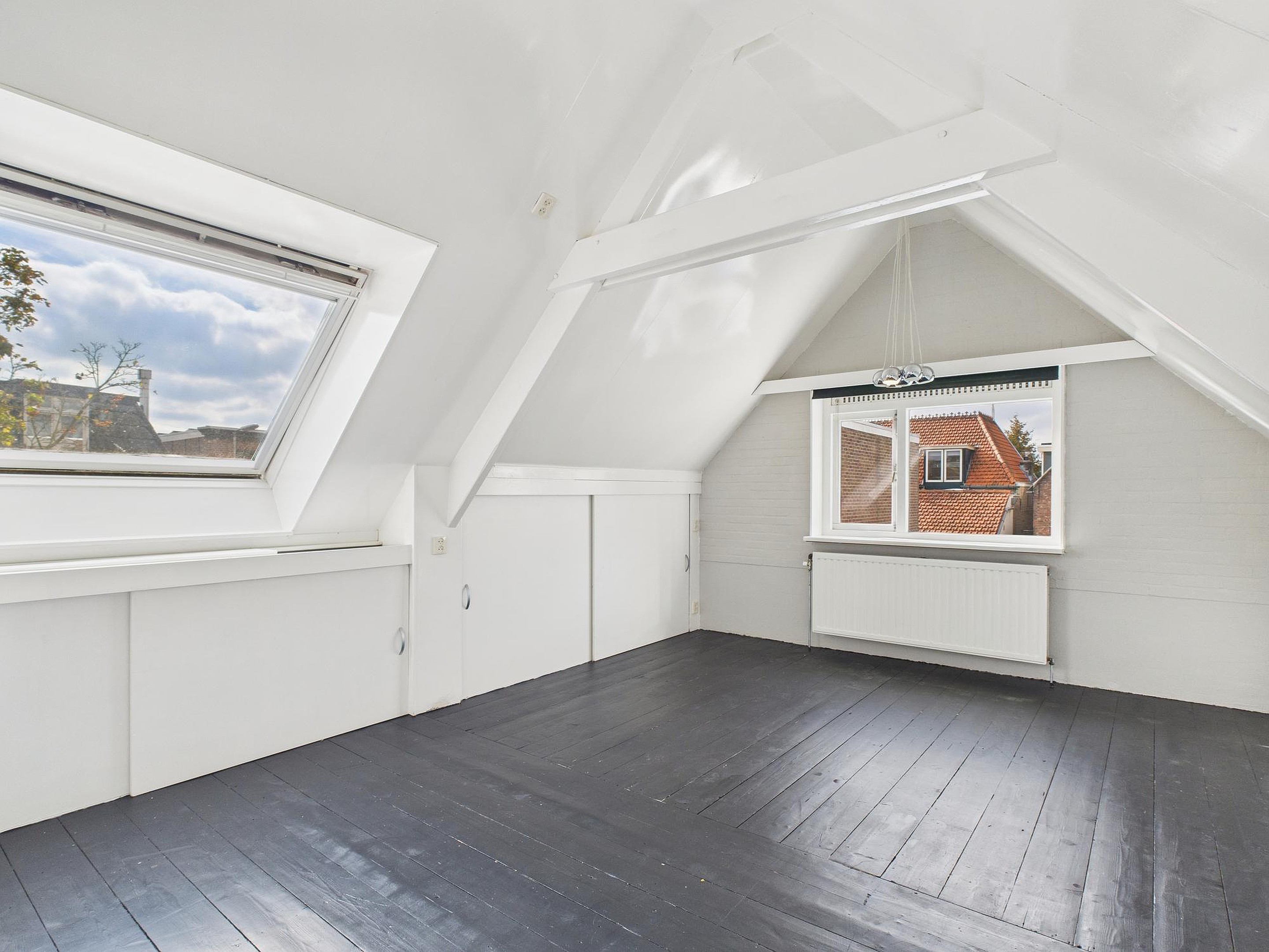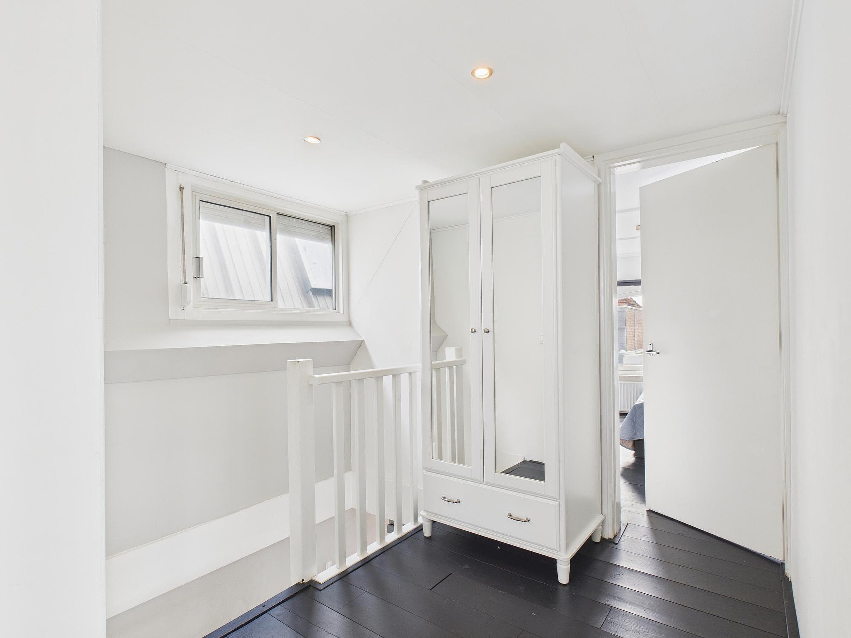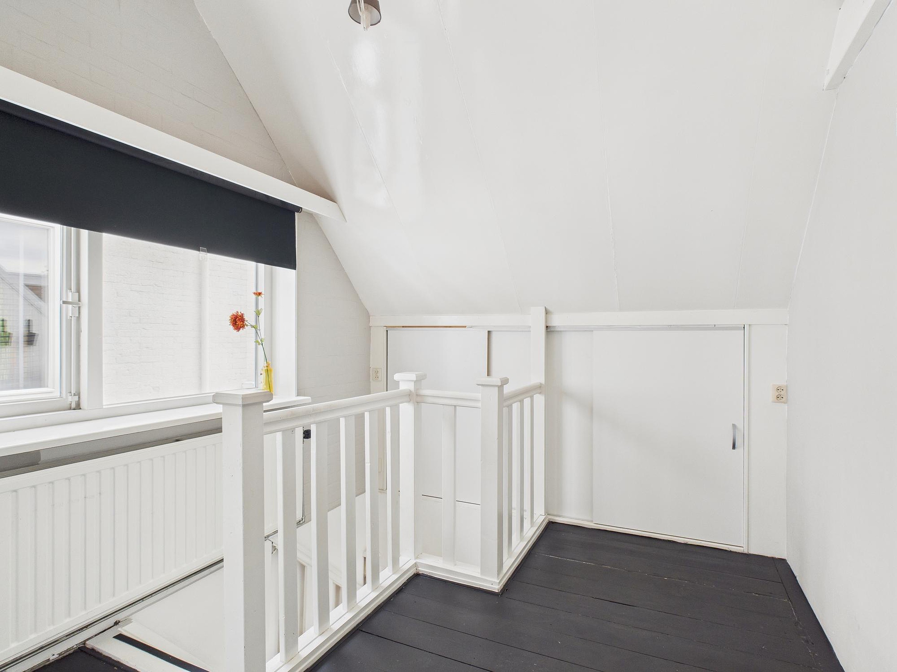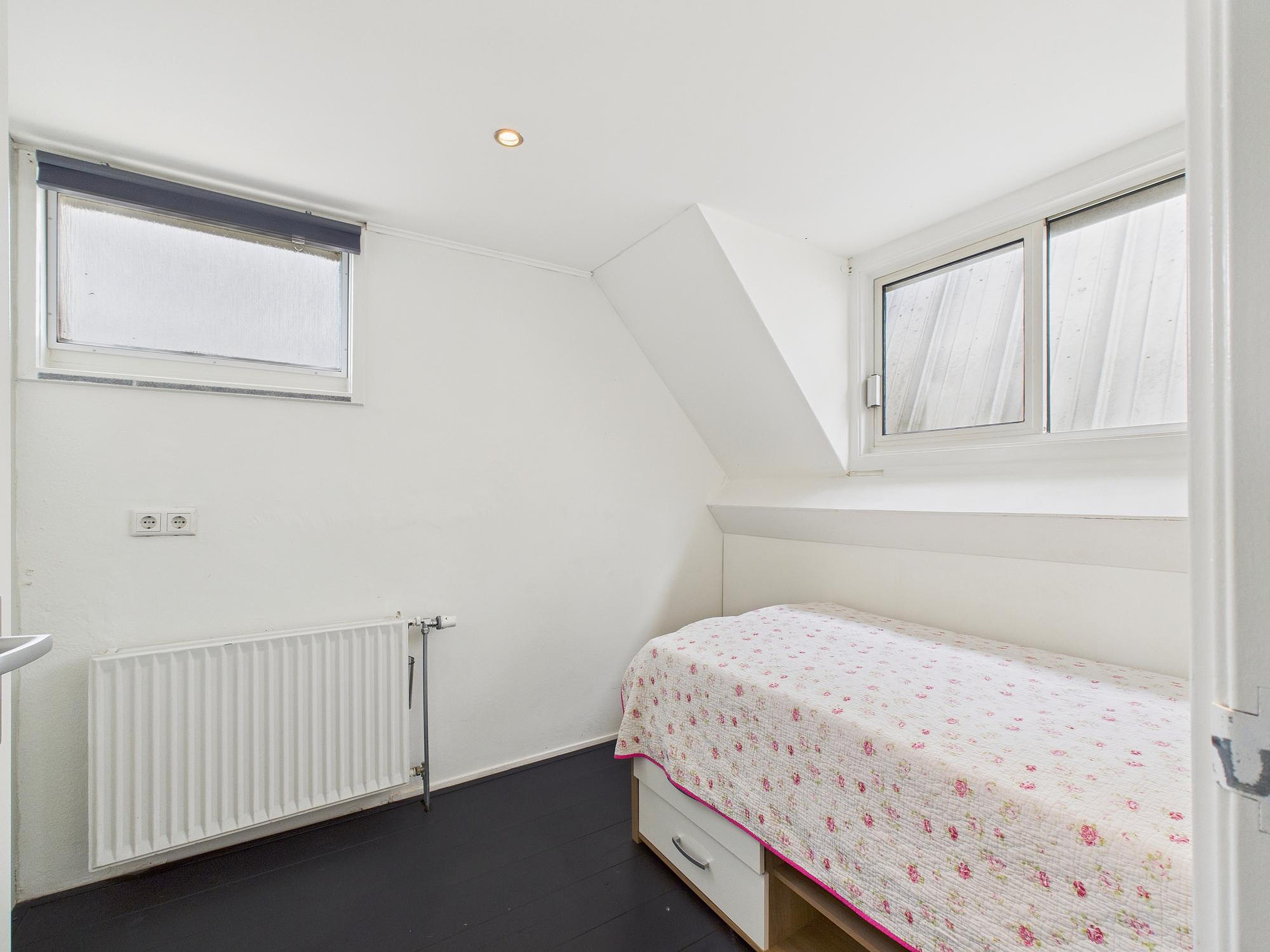 In deze ruimte van woonkamer en keuken is er een betegelde toiletruimte met fonteintje. Vanuit de tussenkamer, die ook nog als fijne werkplek kan dienen, stap je zo het zonnige dakterras op van circa 10 m2 – een heerlijke plek voor een kop koffie of een borrel in de buitenlucht. Tot slot vind je op deze verdieping een ruime slaapkamer met houten vloer, dakraam en vaste kastruimte.
