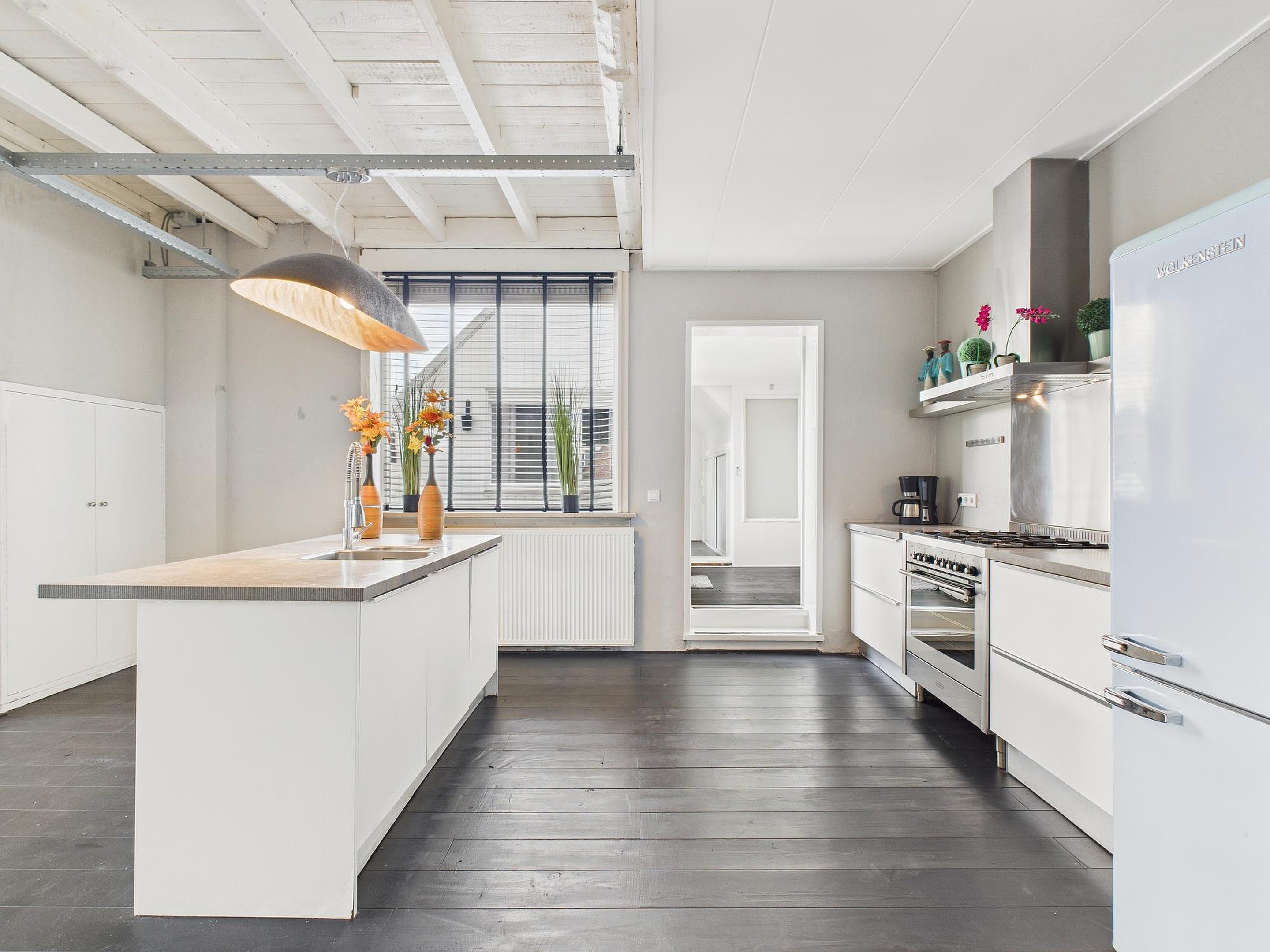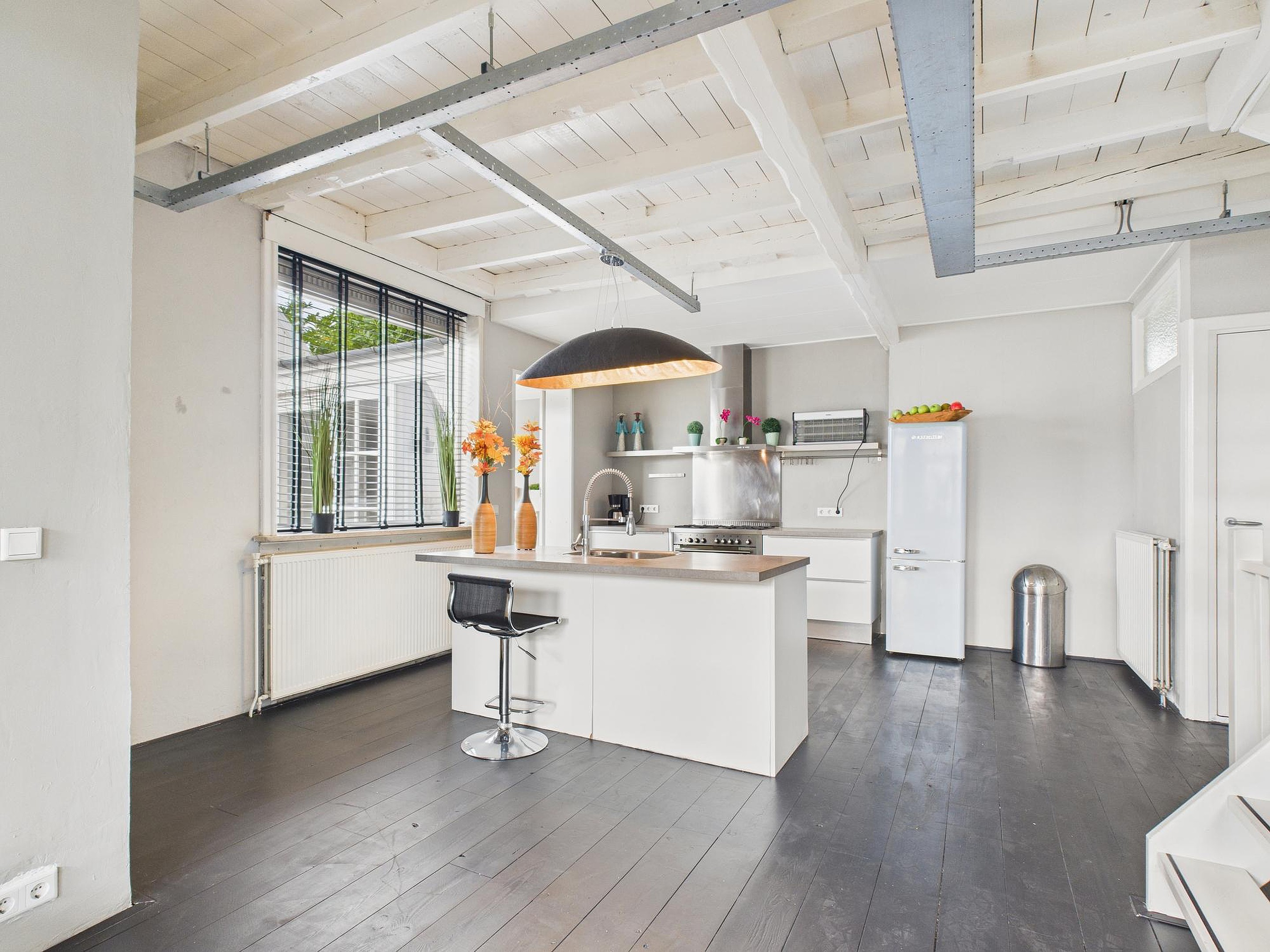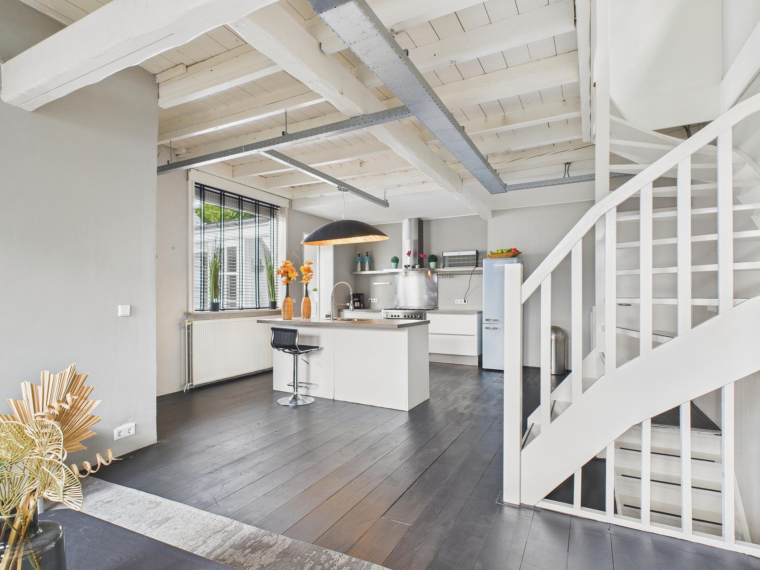Op de eerste verdieping vind je de royale woonkamer. De houten vloer, het balkenplafond en de moderne wandafwerking geven de ruimte een warme, eigentijdse uitstraling met een industrieel tintje. De open keuken sluit hier mooi op aan en is voorzien van een bar en een nette inrichting met onder andere een vaatwasser, 6-pits gaskookplaat, oven en afzuigkap.