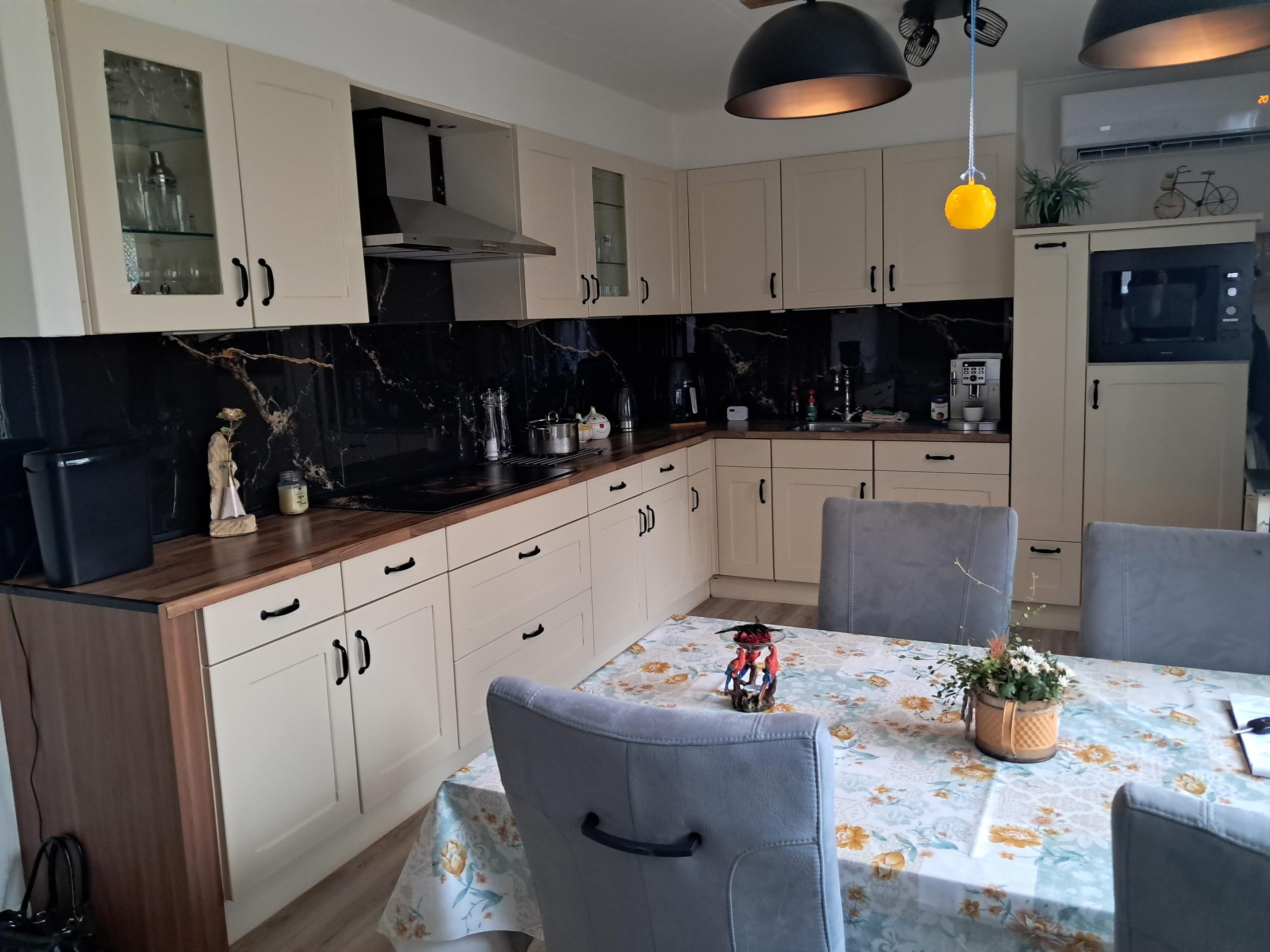 Vanuit de hal, met toilet, trapopgang en kelderkast, kom je in de L-vormige woonkamer met schuifpui. In de aangesloten woonkeuken vind je een keukeninrichting in hoekopstelling met diverse inbouwapparatuur (vernieuwd in 2024). Airco in de keuken aanwezig voor koeling en verwarming.