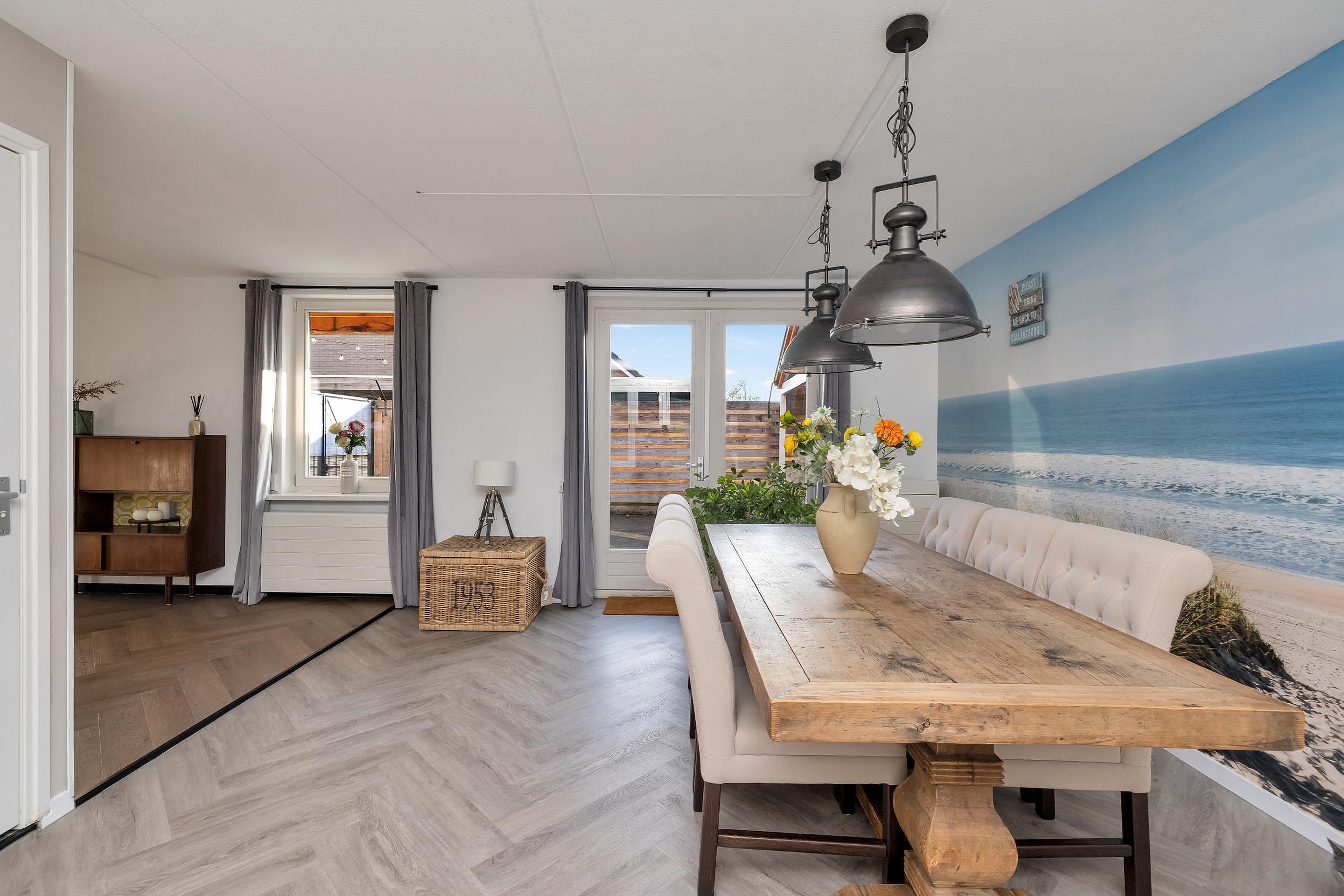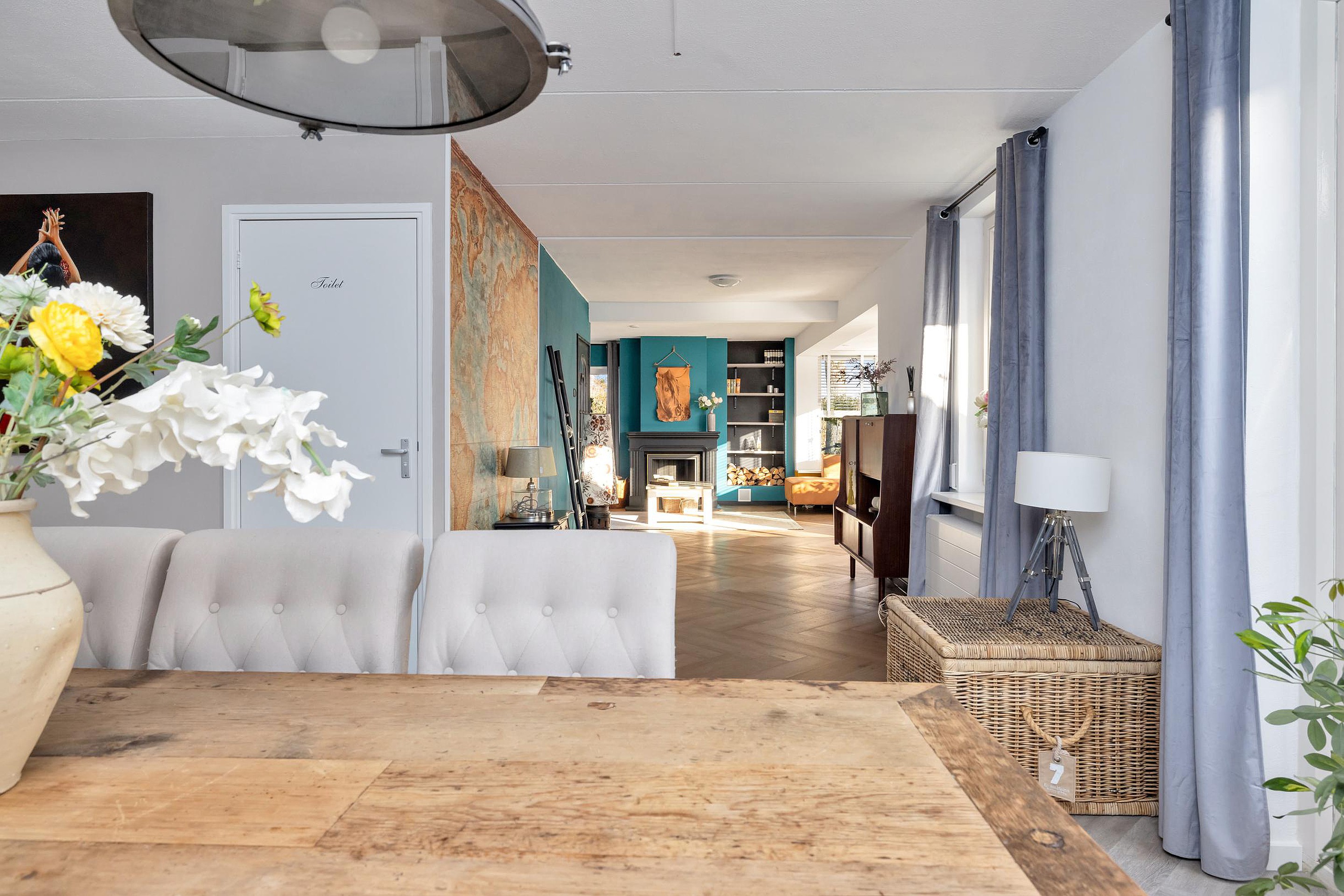 Via de entree komt u in de hal met trapopgang. Vanuit hier bereikt u de ruime woonkamer. Deze lichte leefruimte is sfeervol afgewerkt en beschikt over een gezellige gashaard, wat zorgt voor een warme en uitnodigende sfeer. De indeling biedt voldoende ruimte voor meerdere zithoeken en staat in open verbinding met de eetkamer.