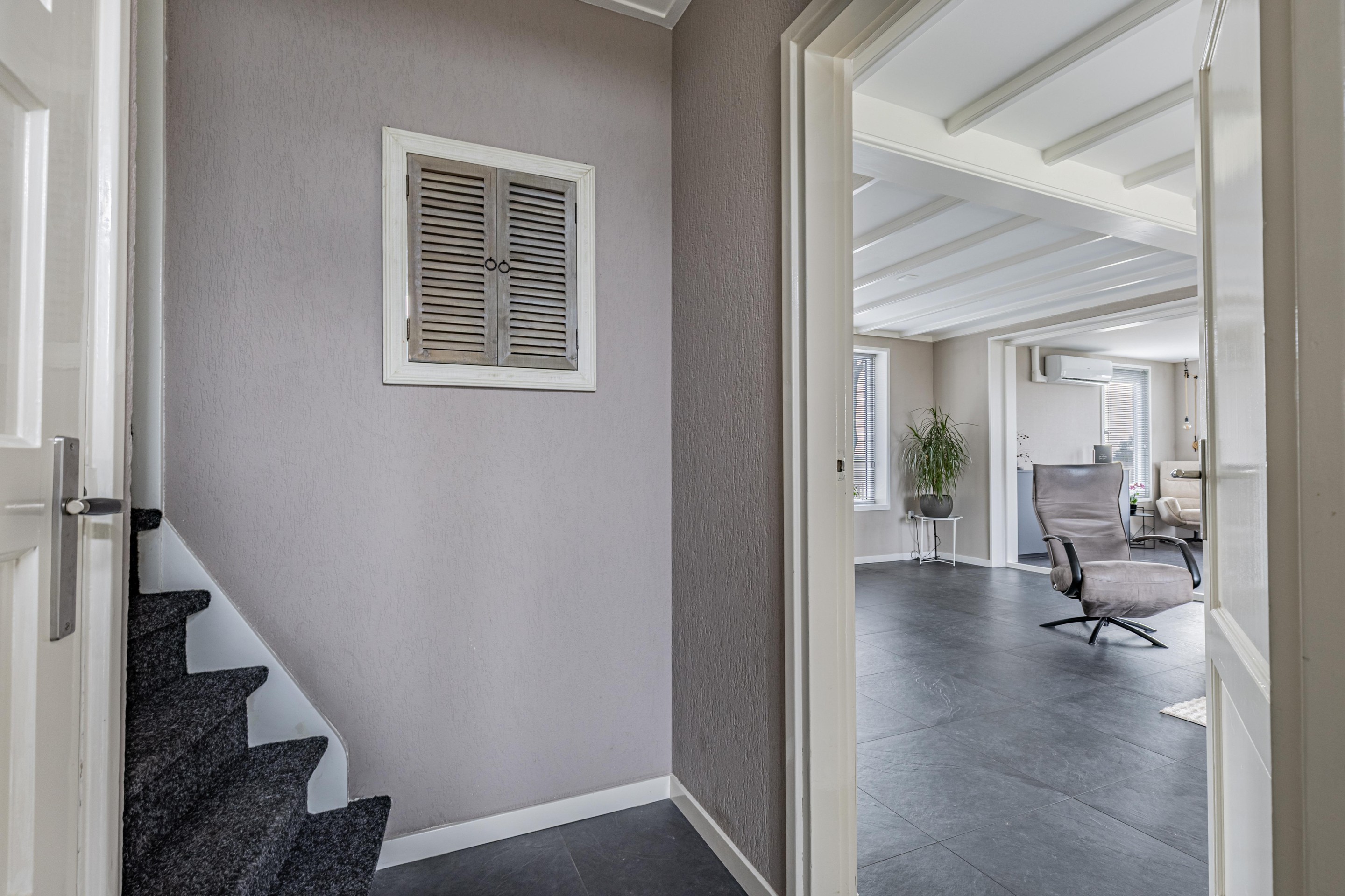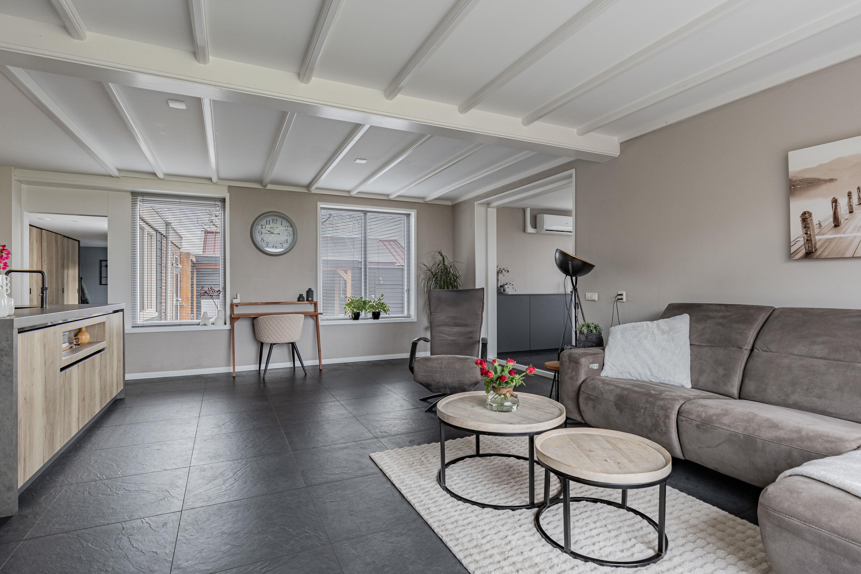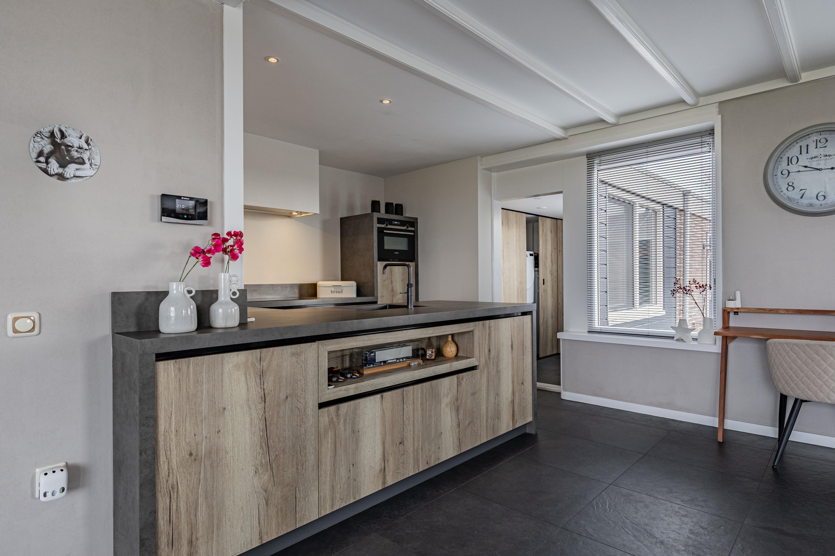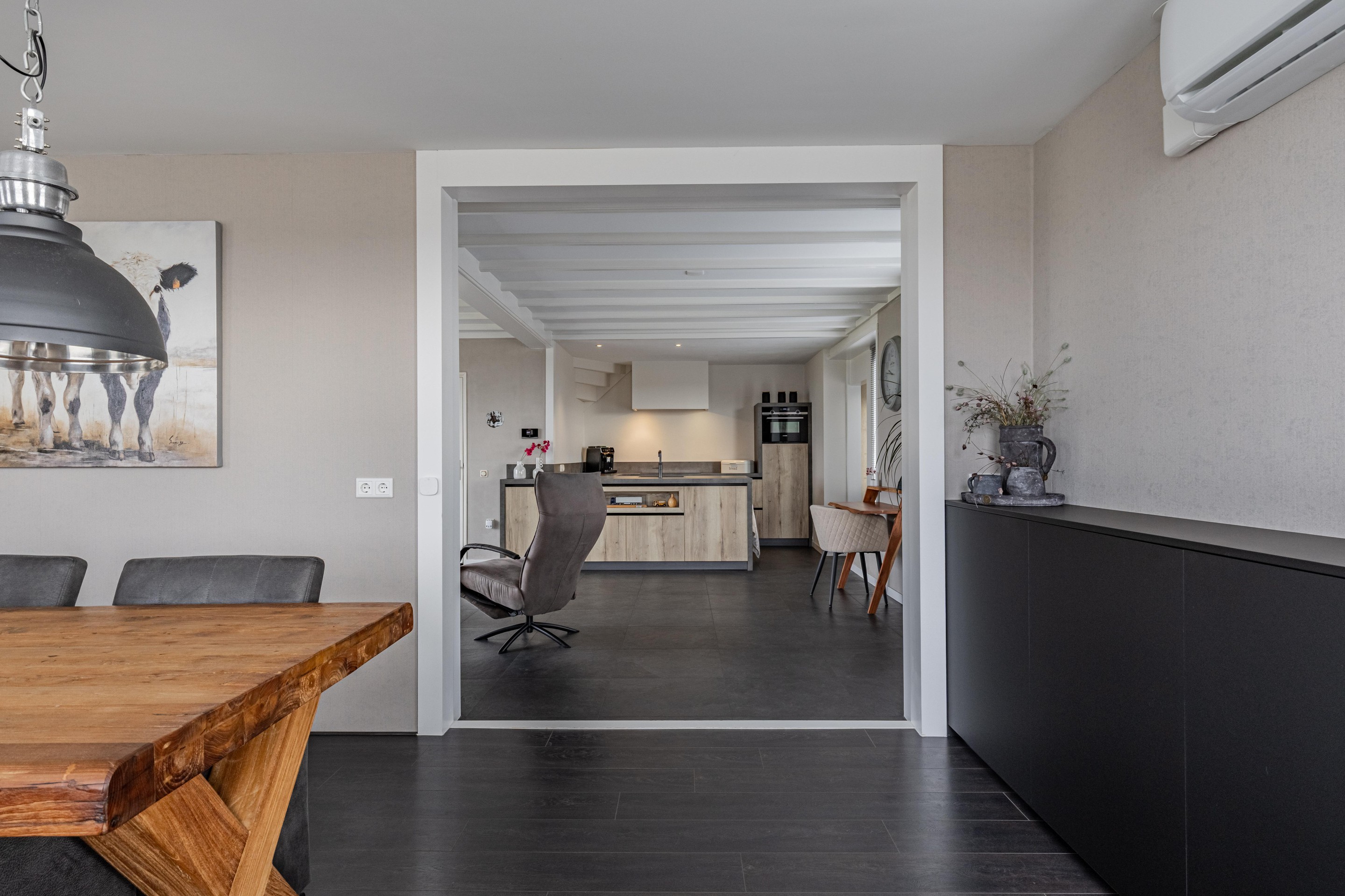 Binnen wordt u verwelkomd door een lichte en sfeervolle woonkamer met balken plafond en uitgebouwde eetkamer. De moderne keuken vormt een fijne plek om te koken en samen te komen. Aansluitend vindt u een praktische, lange bijkeuken met een kastenwand, wasmachineopstelling en volop bergruimte.