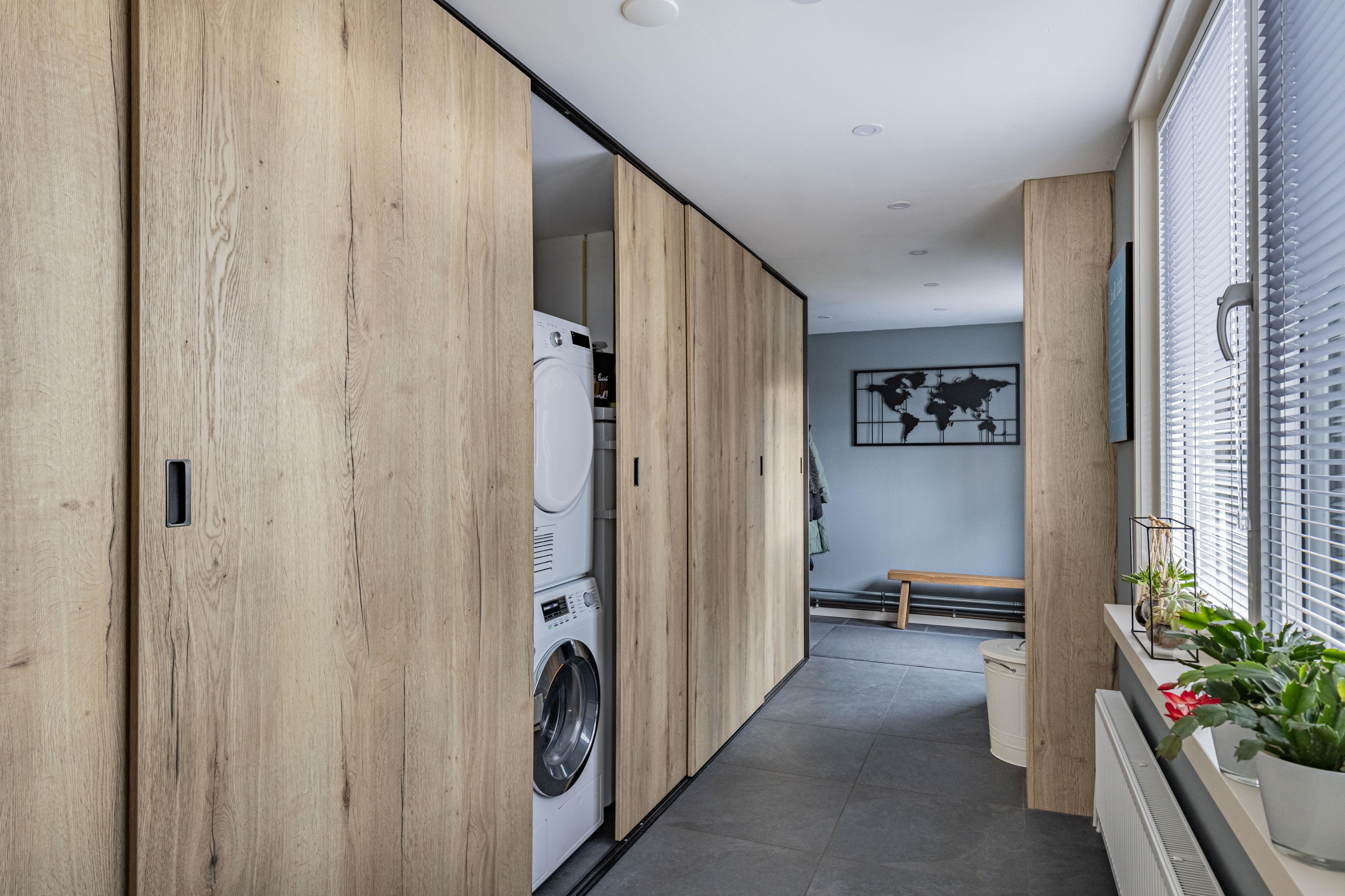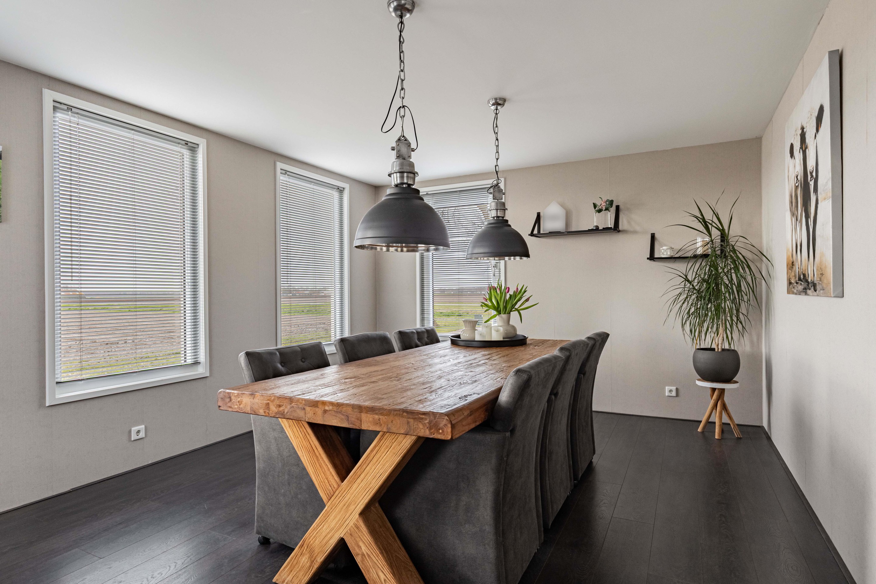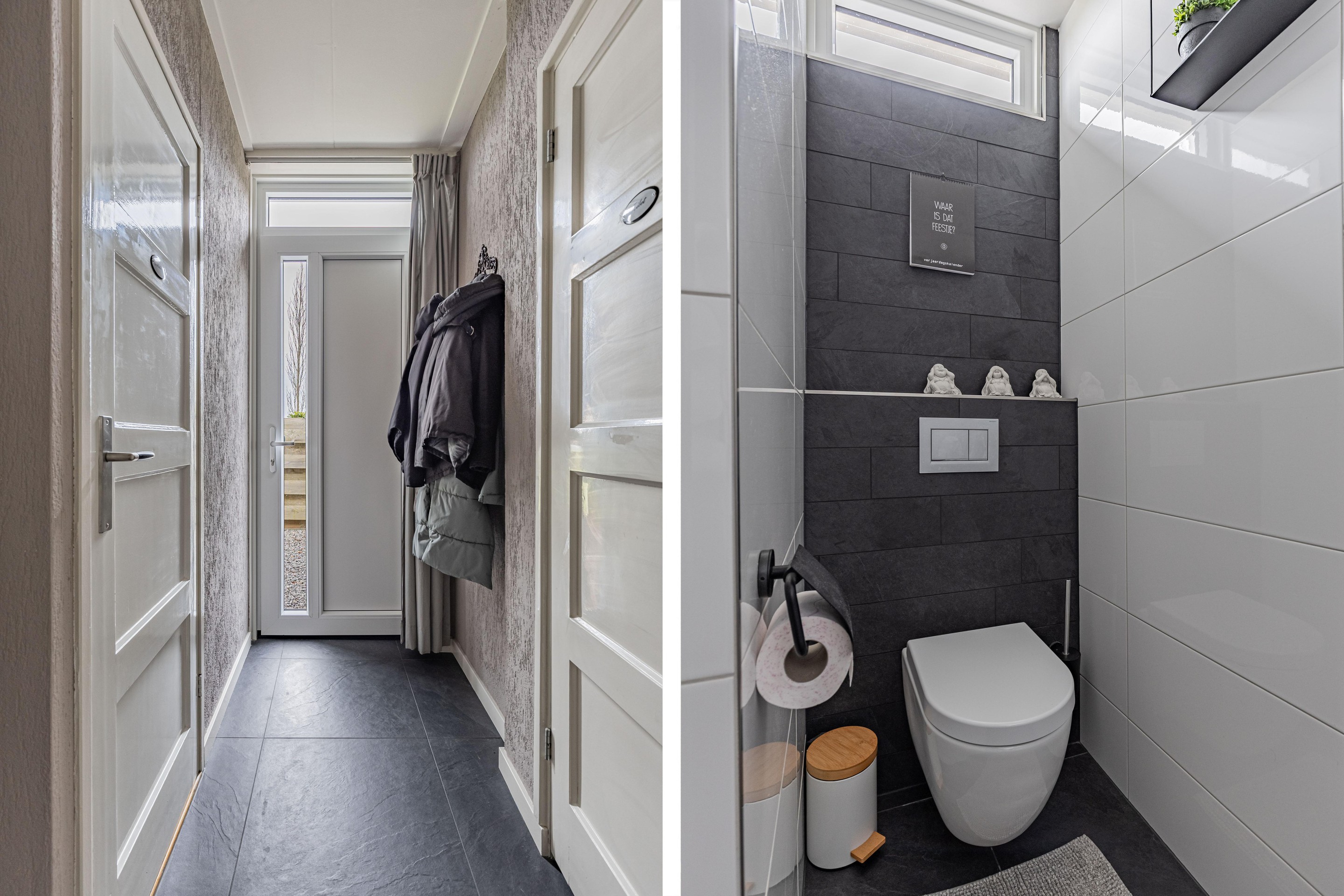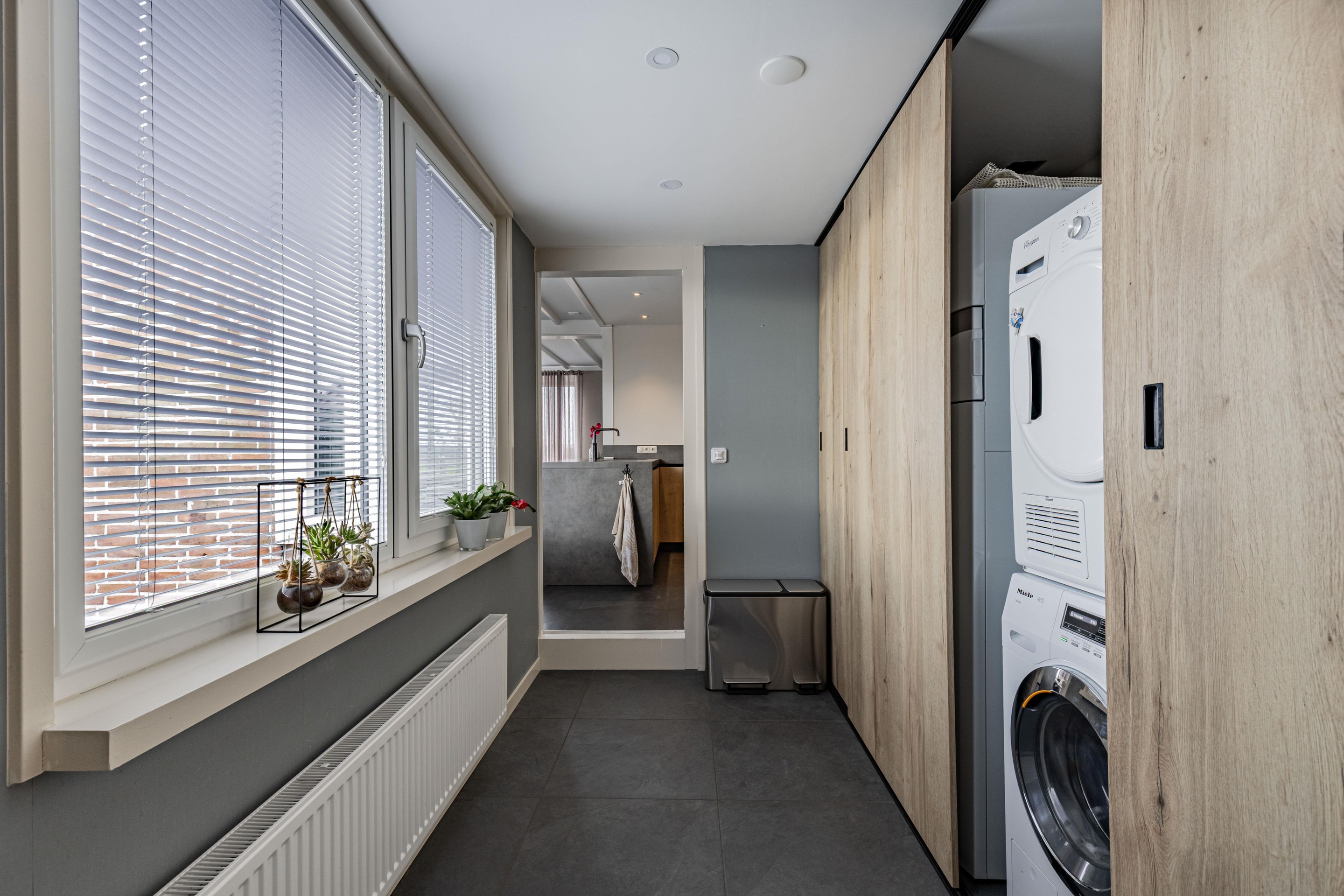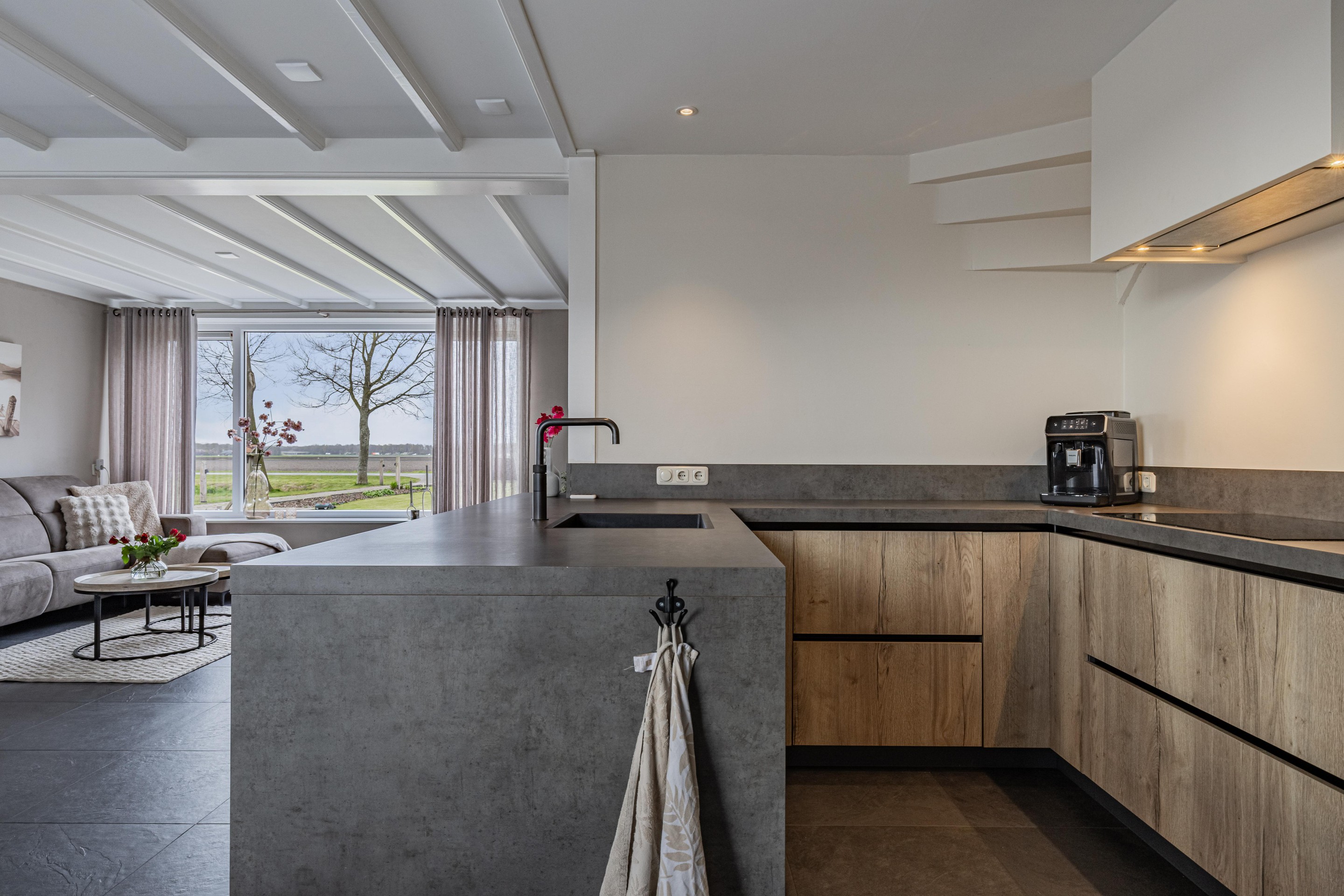 Binnen wordt u verwelkomd door een lichte en sfeervolle woonkamer met balken plafond en uitgebouwde eetkamer. De moderne keuken vormt een fijne plek om te koken en samen te komen. Aansluitend vindt u een praktische, lange bijkeuken met een kastenwand, wasmachineopstelling en volop bergruimte.