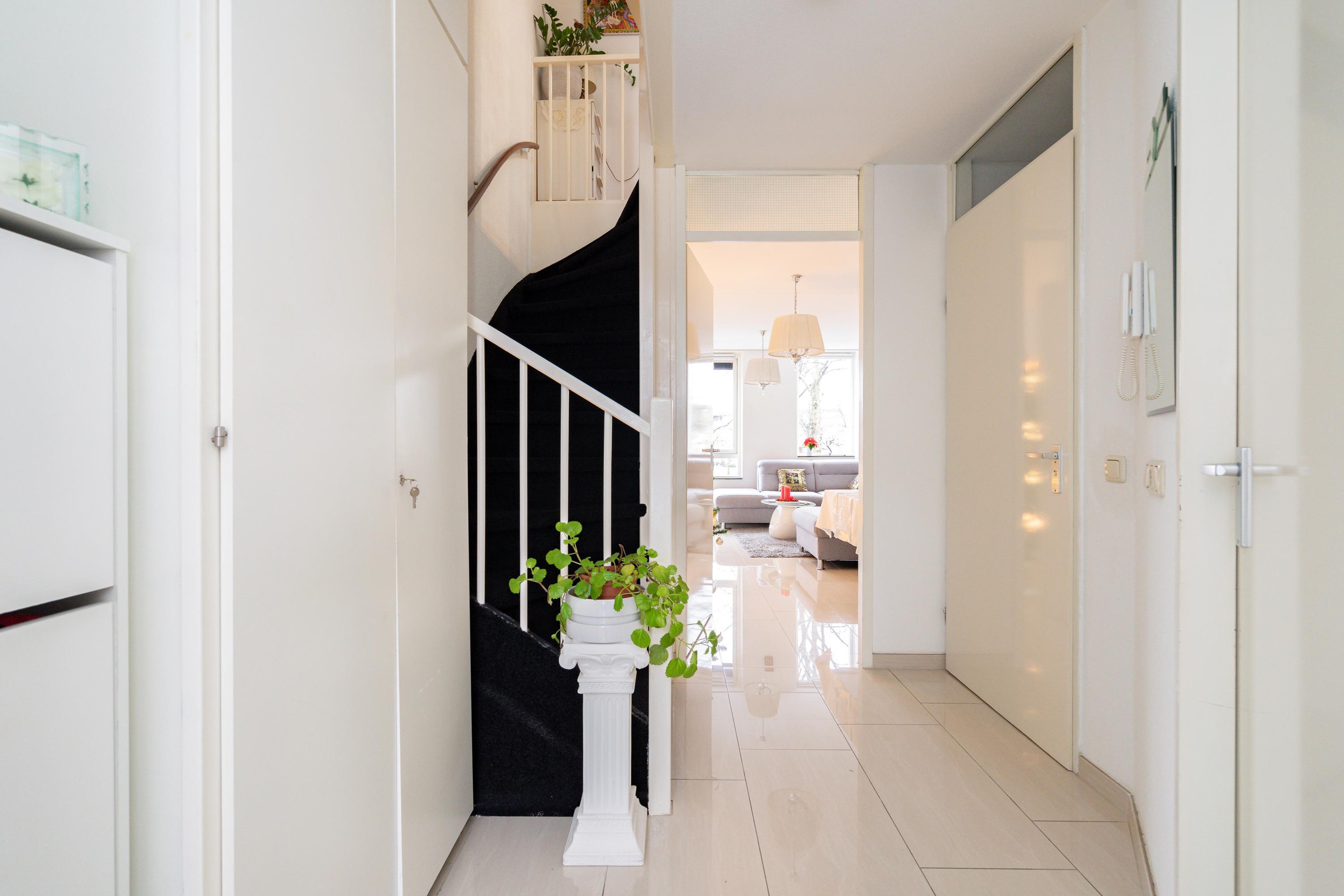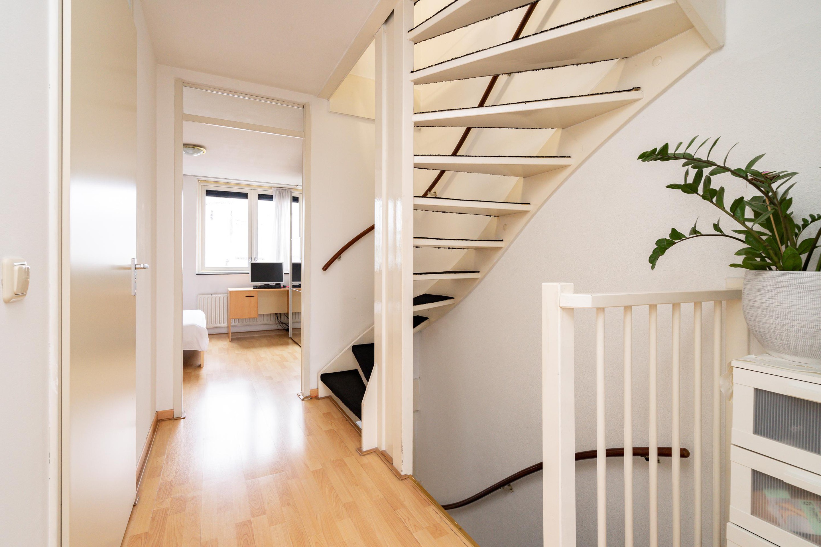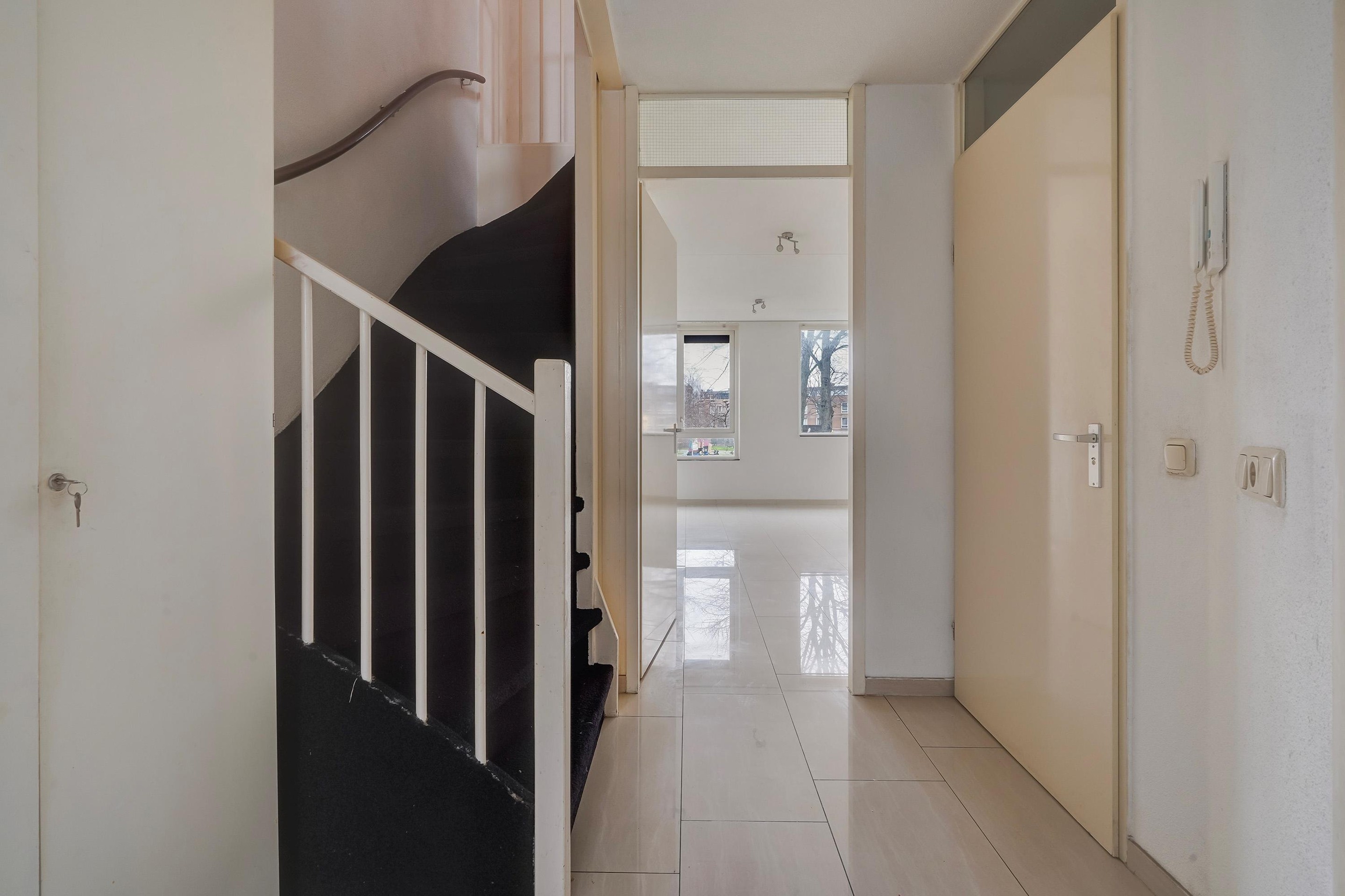 Eenmaal boven aangekomen loop je naar links en zul je de deur naar de woning aan uw rechterhand vinden (tenzij je achteruit loopt).