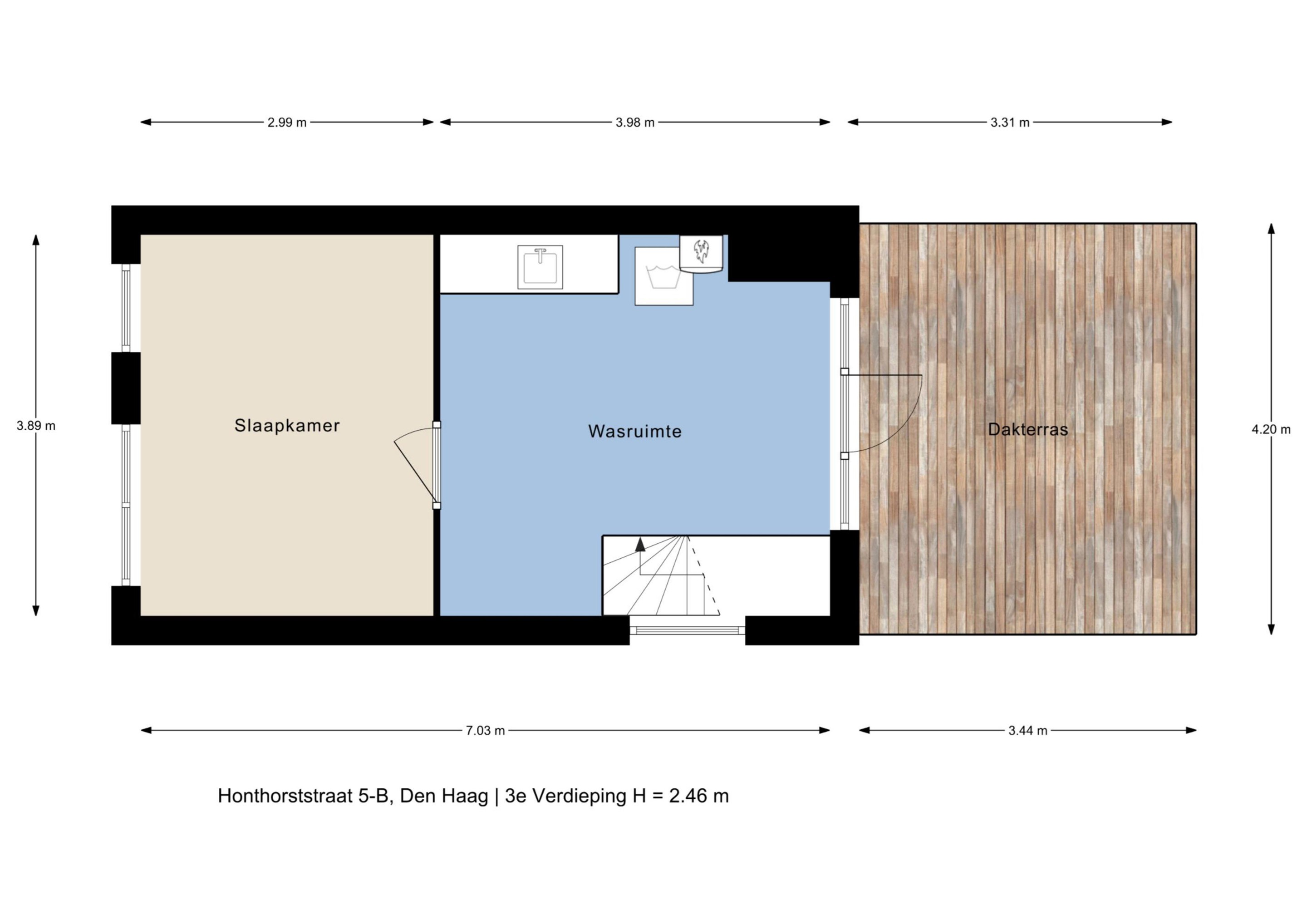 Hierna kun je nog een verdieping omhoog naar de derde verdieping en zul je de derde slaapkamer, wasruimte en het dakterras met vrij uitzicht vinden.