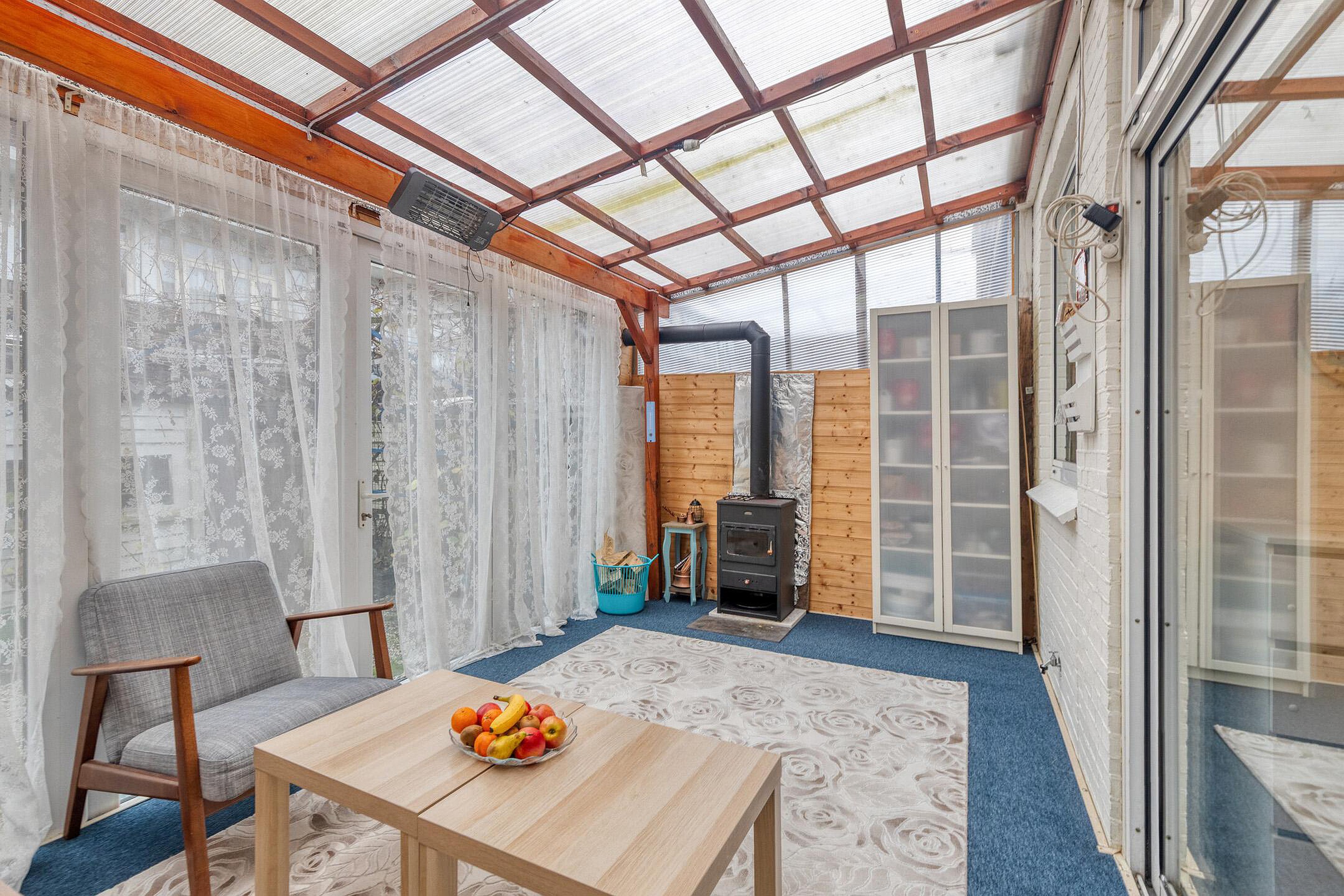 Aan de achterzijde van de woning is een aangebouwde serre, een heerlijke plek om te ontspannen. De serre beschikt over een houtkachel en een werkende heater, waardoor je hier het hele jaar door comfortabel kunt vertoeven, genietend van de gunstige lichtinval.