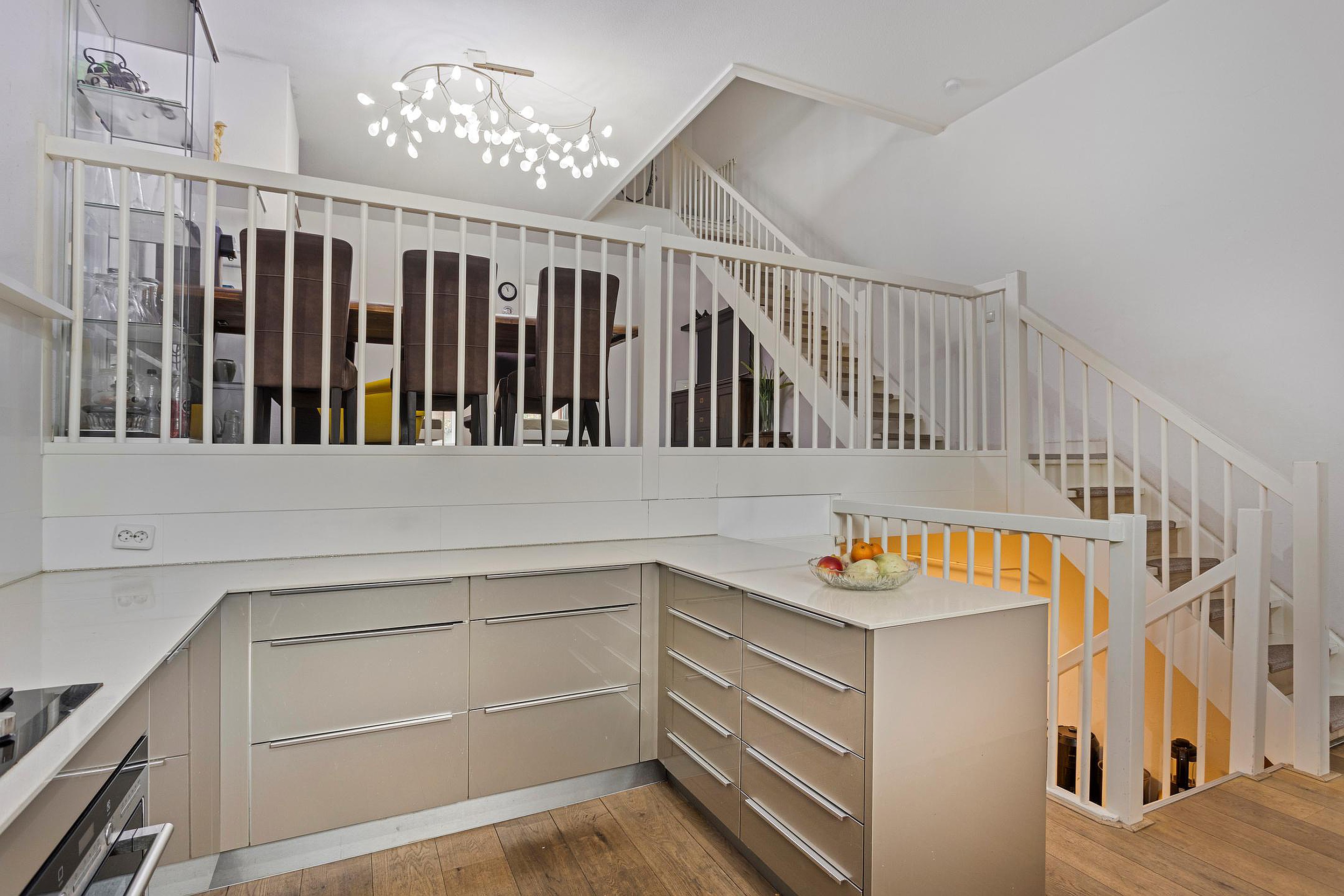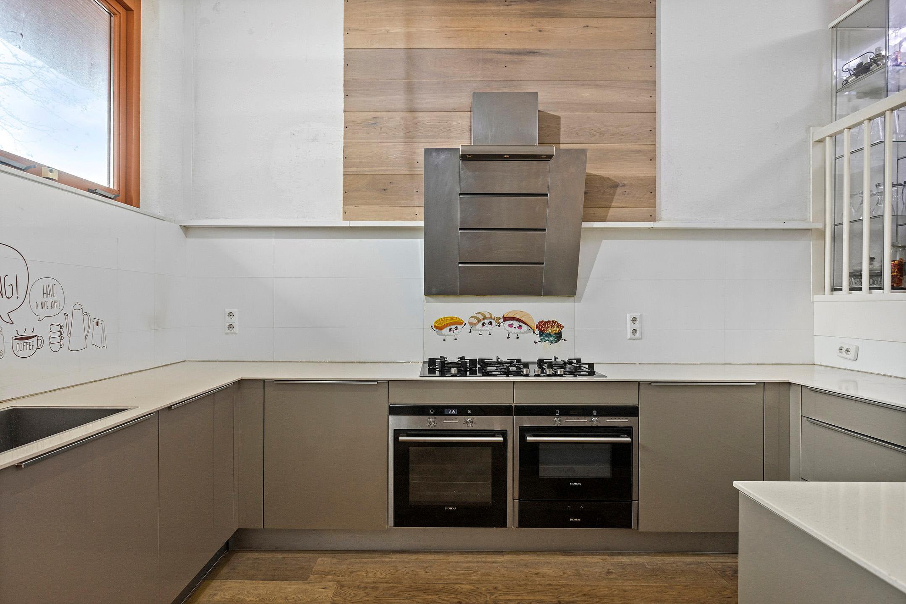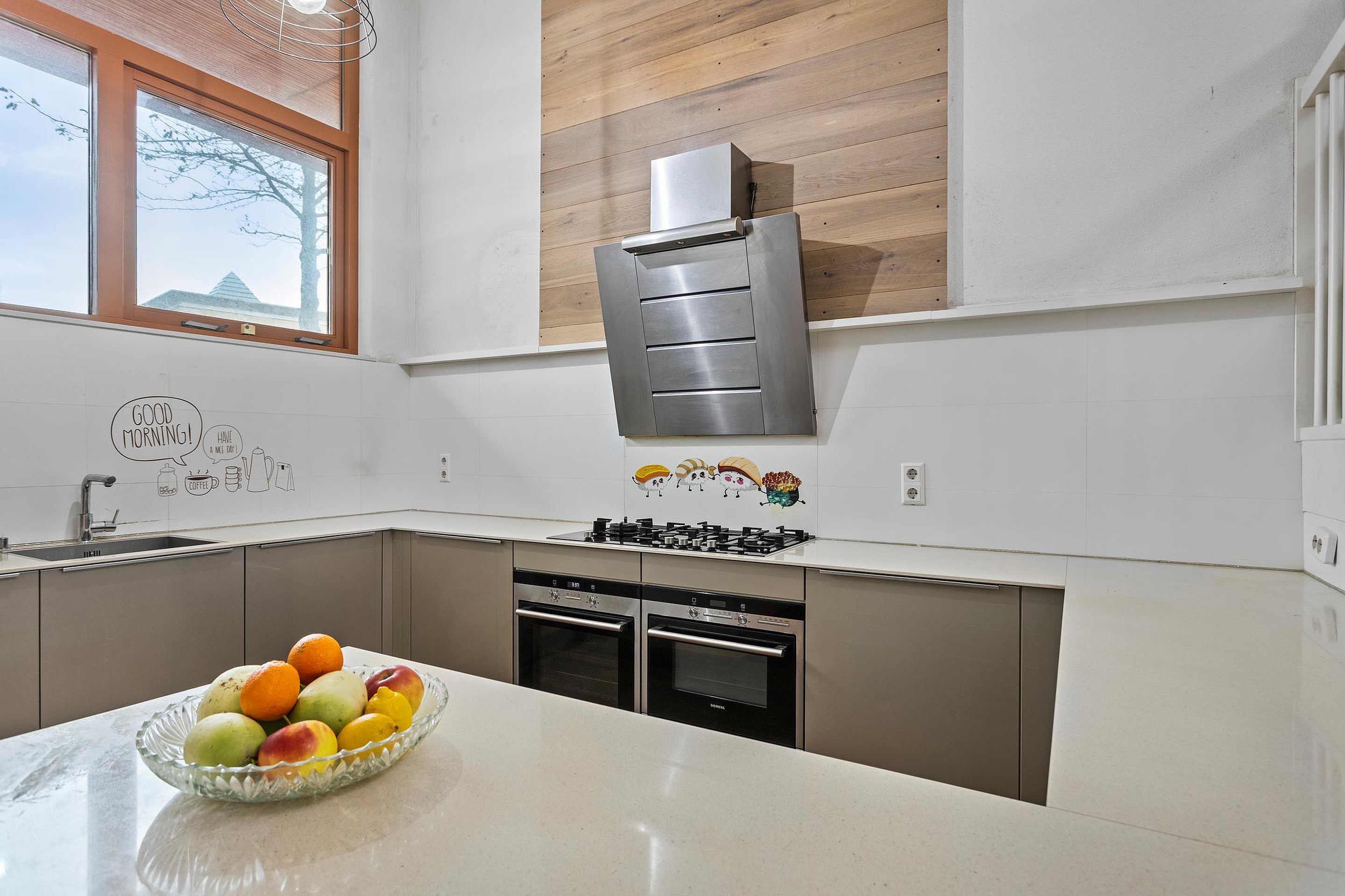 De open keuken is gelegen op het eerste splitlevel (begane grond) en is compleet uitgerust met twee ovens, een luxe gasfornuis, afzuigkap, vaatwasser, koelkast en vriezer. Daarnaast beschikt de keuken over ruime opbergmogelijkheden en een praktische indeling, waardoor koken hier zowel comfortabel als gezellig is.