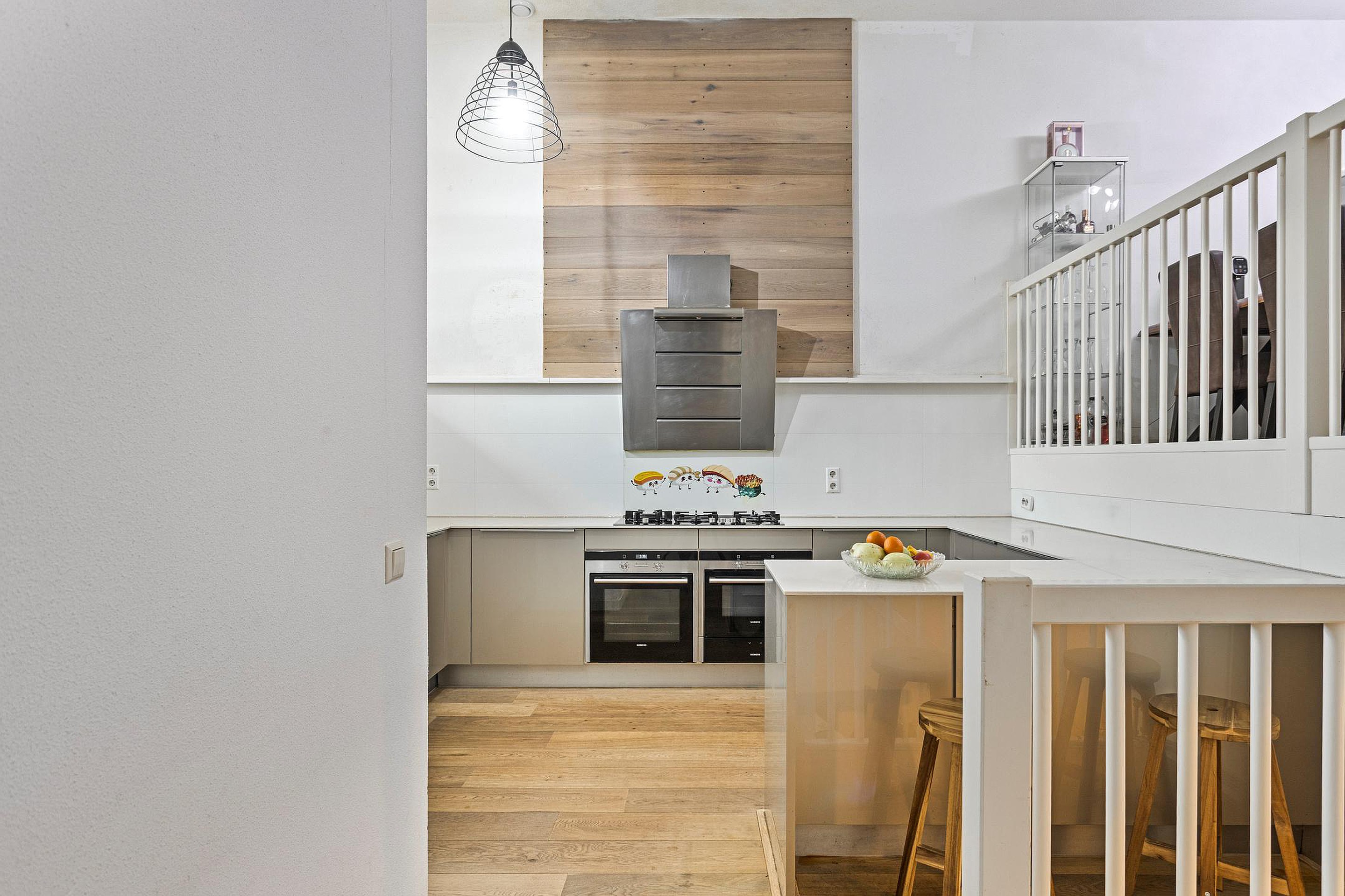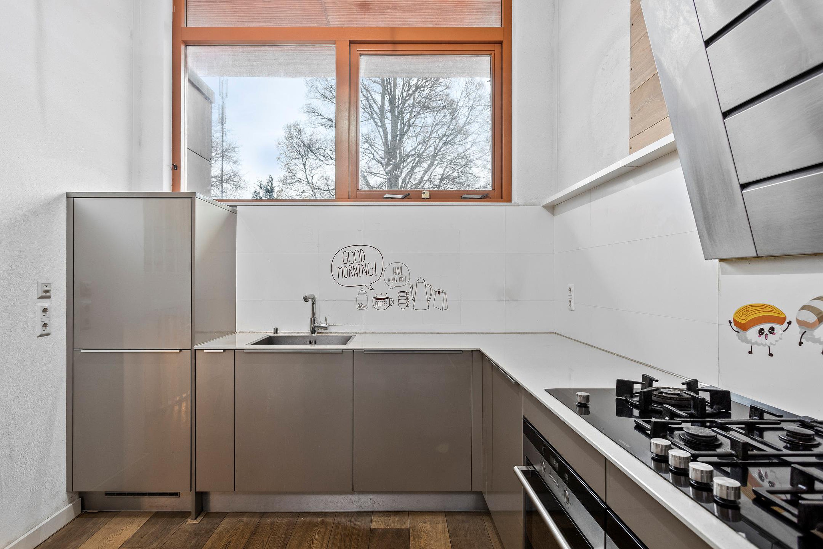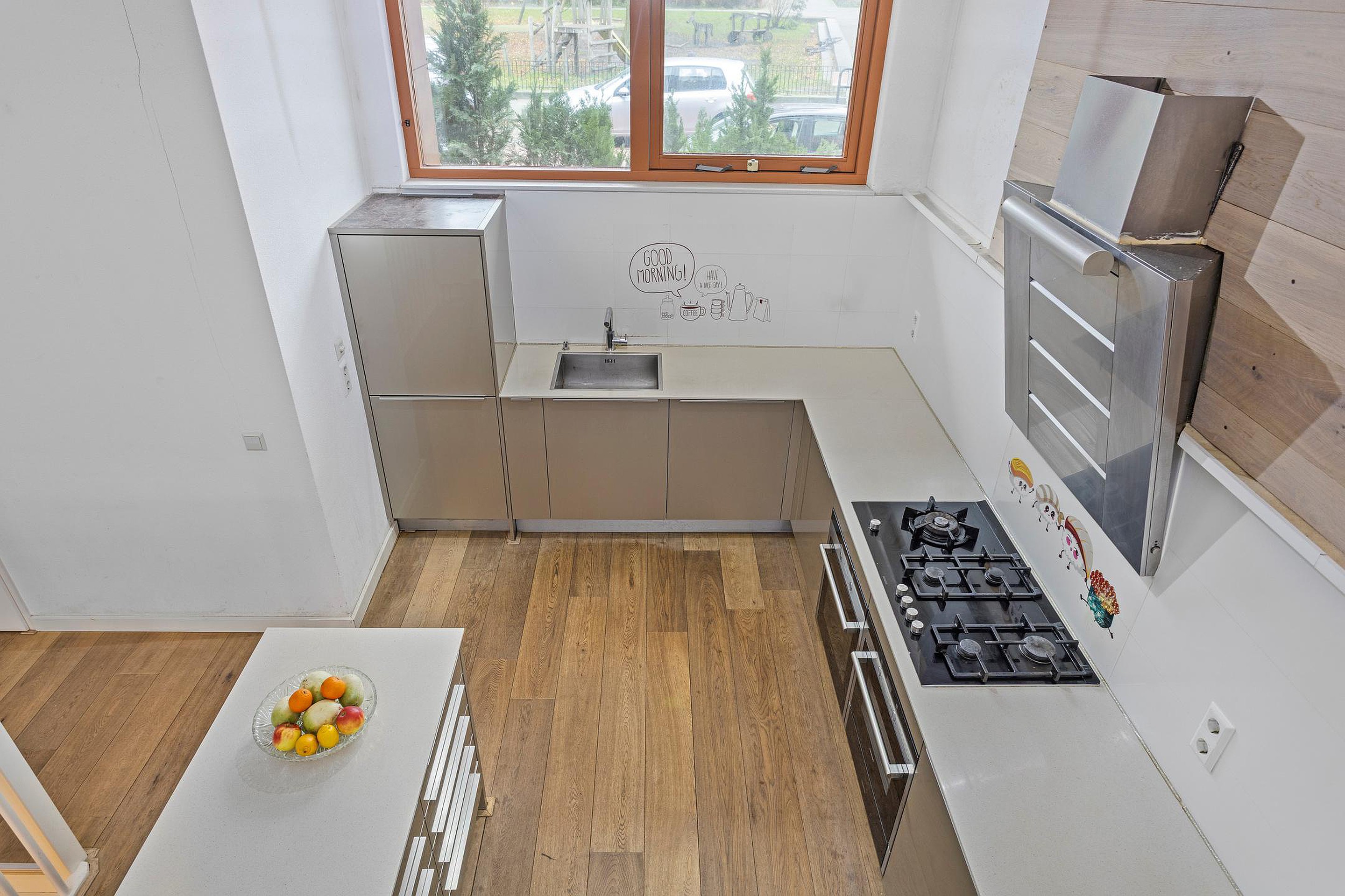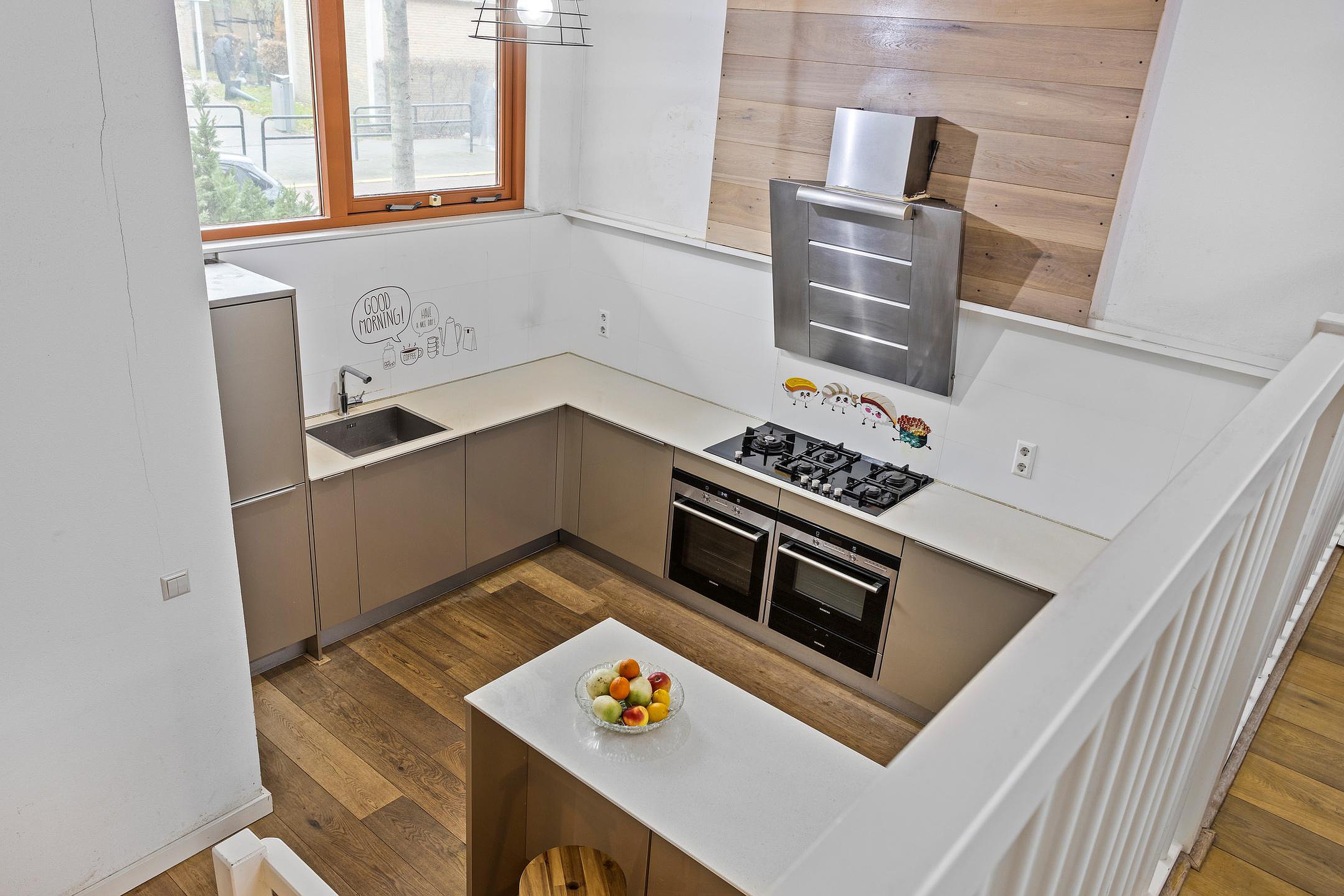 De open keuken is gelegen op het eerste splitlevel (begane grond) en is compleet uitgerust met twee ovens, een luxe gasfornuis, afzuigkap, vaatwasser, koelkast en vriezer. Daarnaast beschikt de keuken over ruime opbergmogelijkheden en een praktische indeling, waardoor koken hier zowel comfortabel als gezellig is.