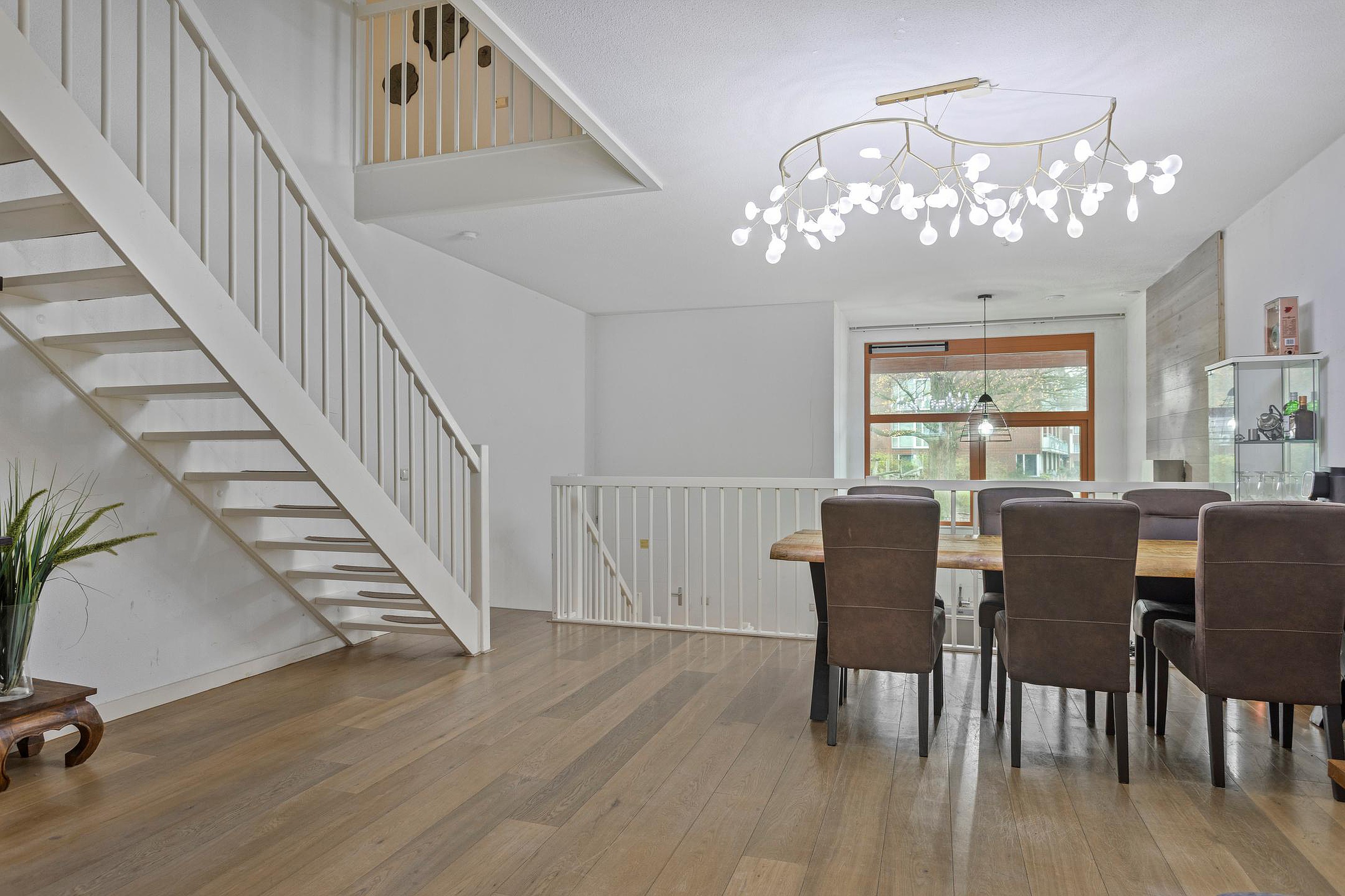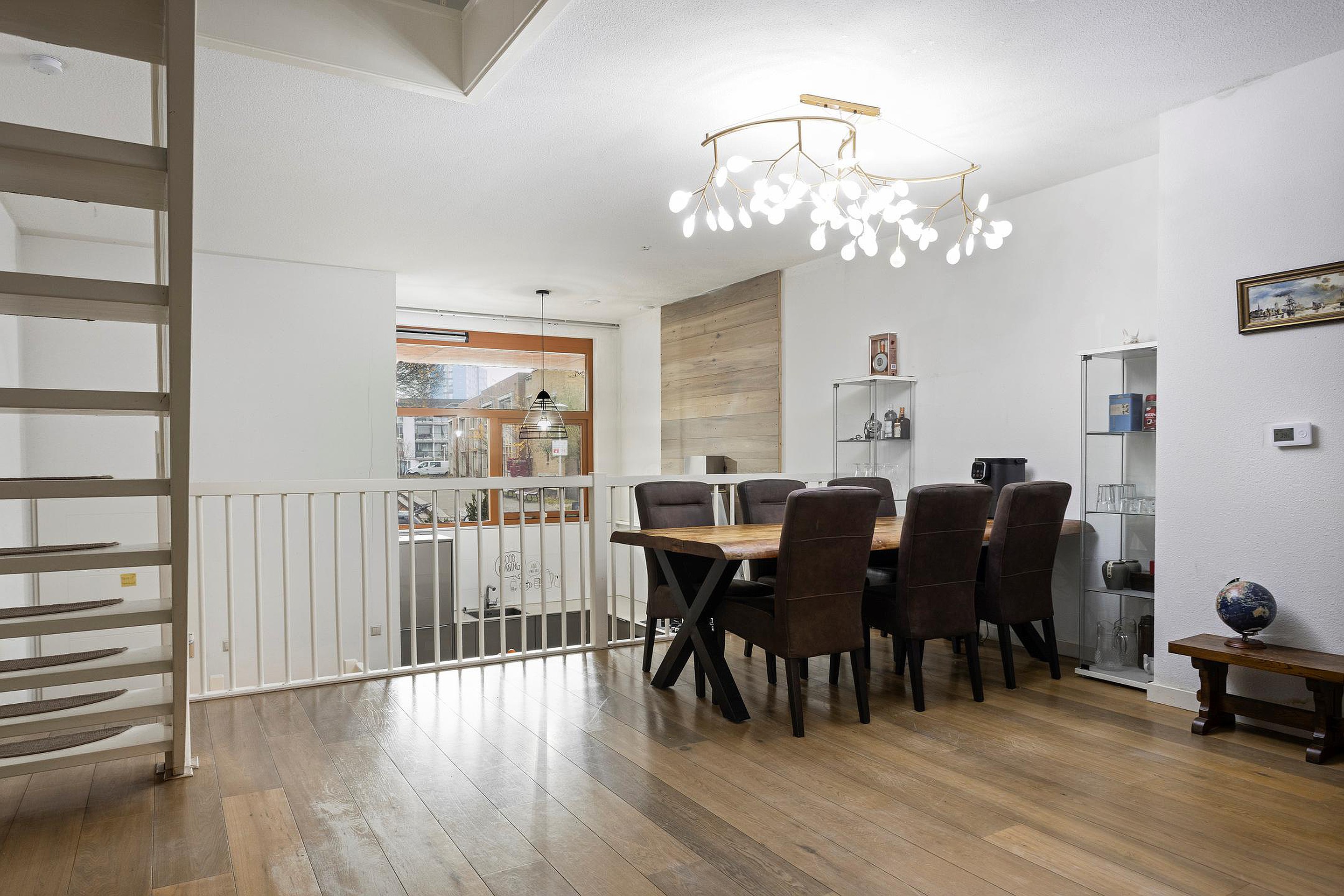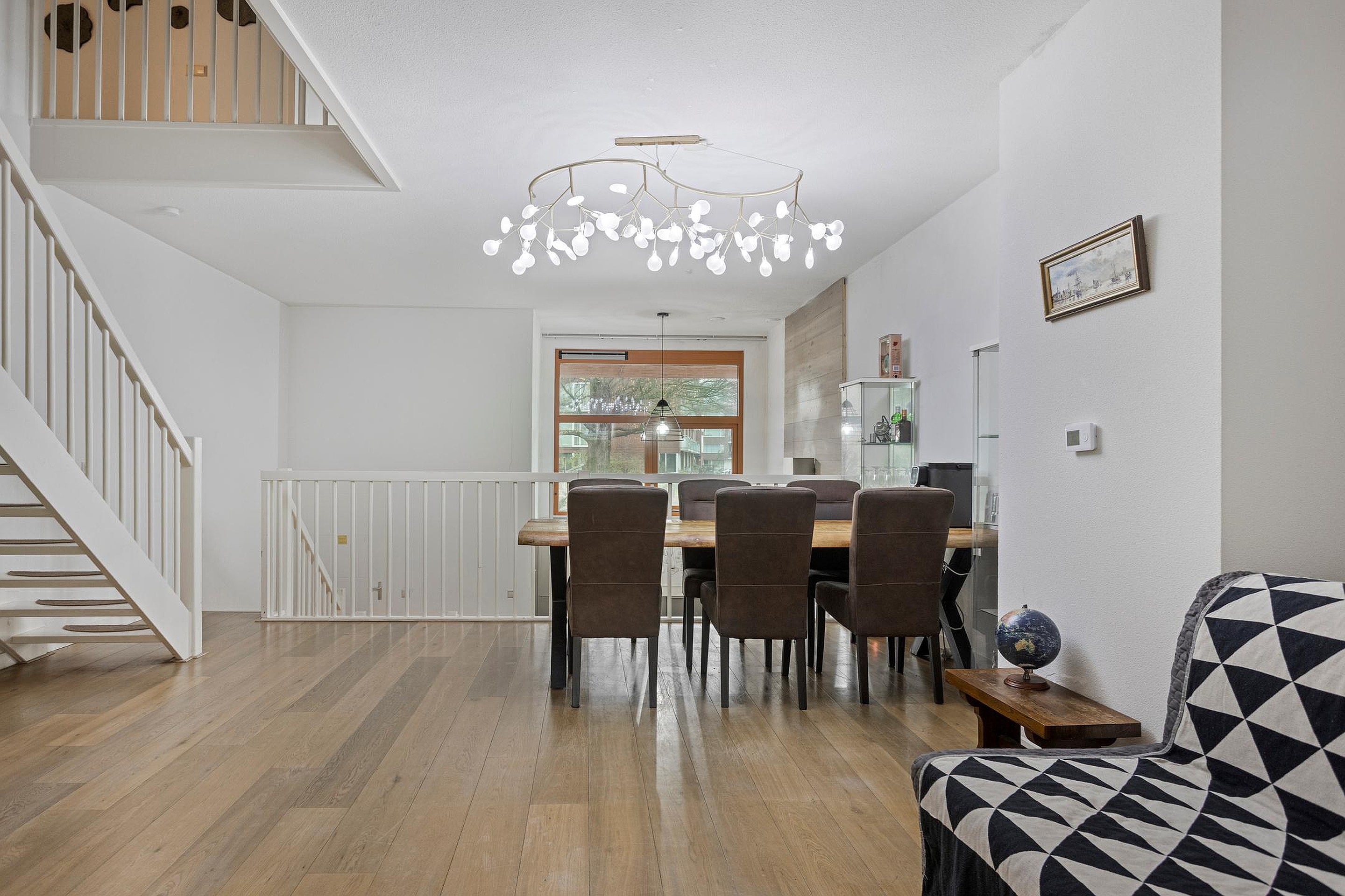 De woonkamer bevindt zich op het tweede splitlevel, bereikbaar via een klein trappetje, en vormt een indrukwekkende leefruimte met een open, moderne uitstraling. Grote raampartijen zorgen voor een uitstekende lichtinval en een prettig ruimtelijk gevoel. Dankzij de splitlevel-indeling is er mooi overzicht richting de keuken op het lagere niveau.