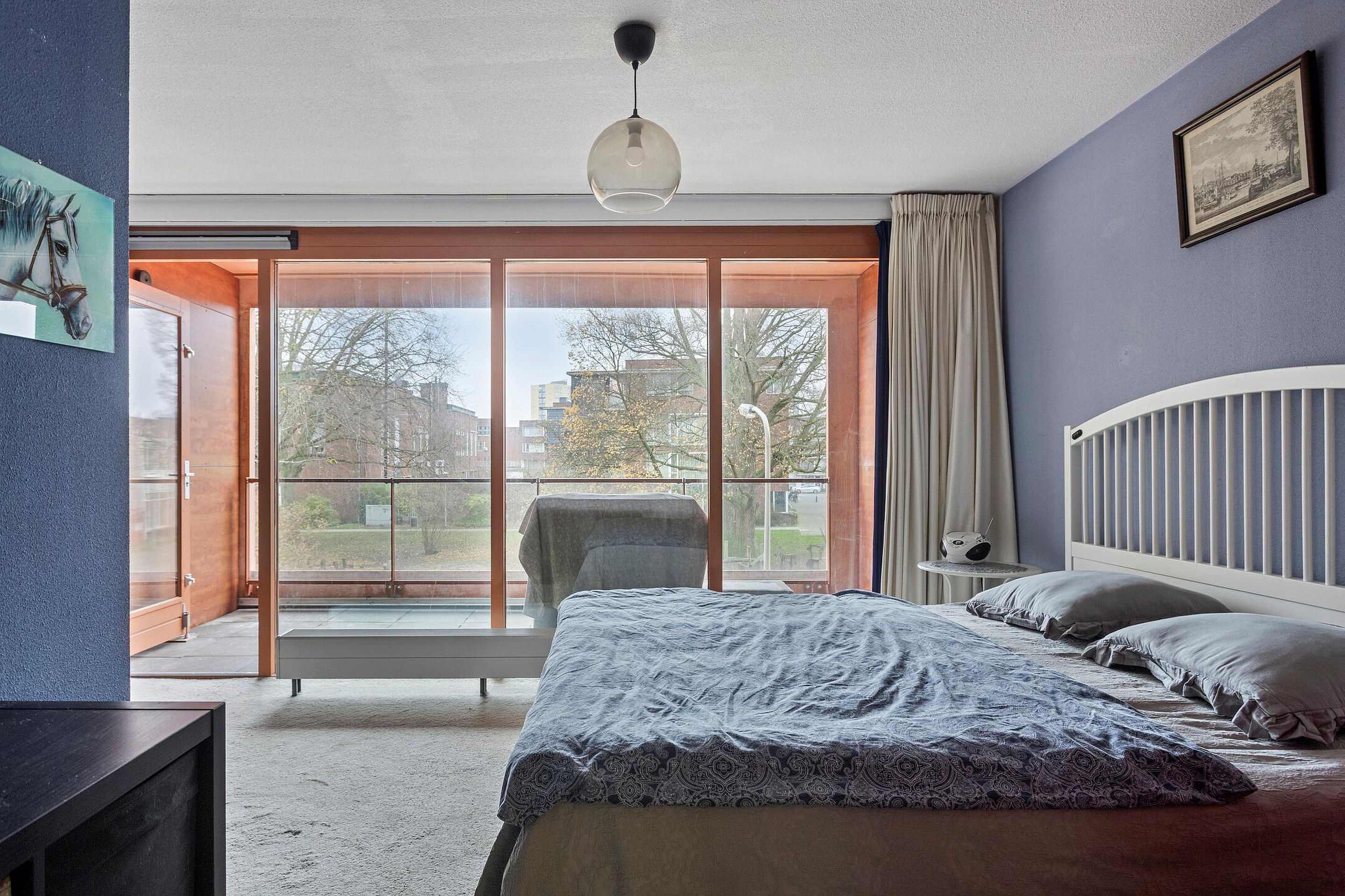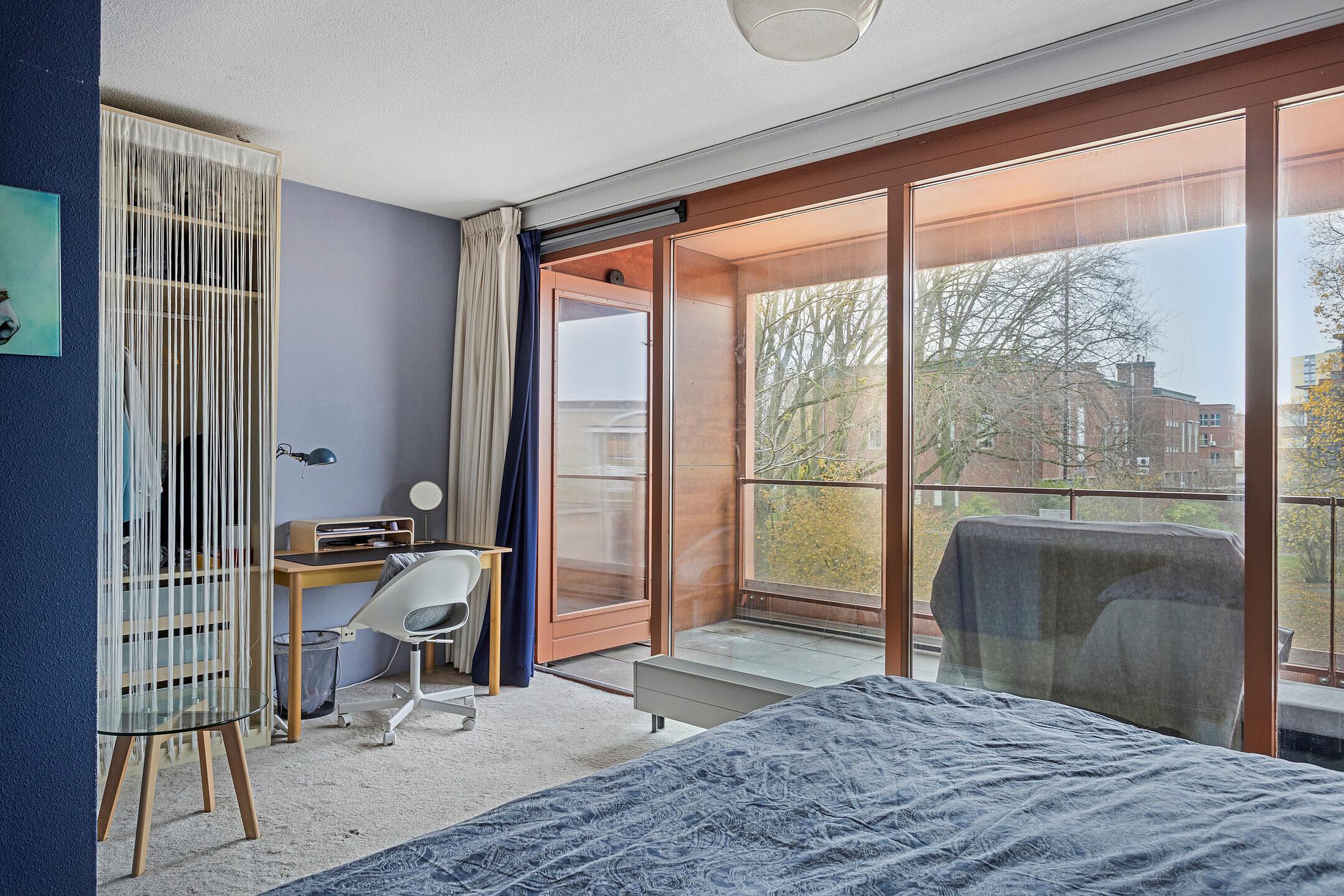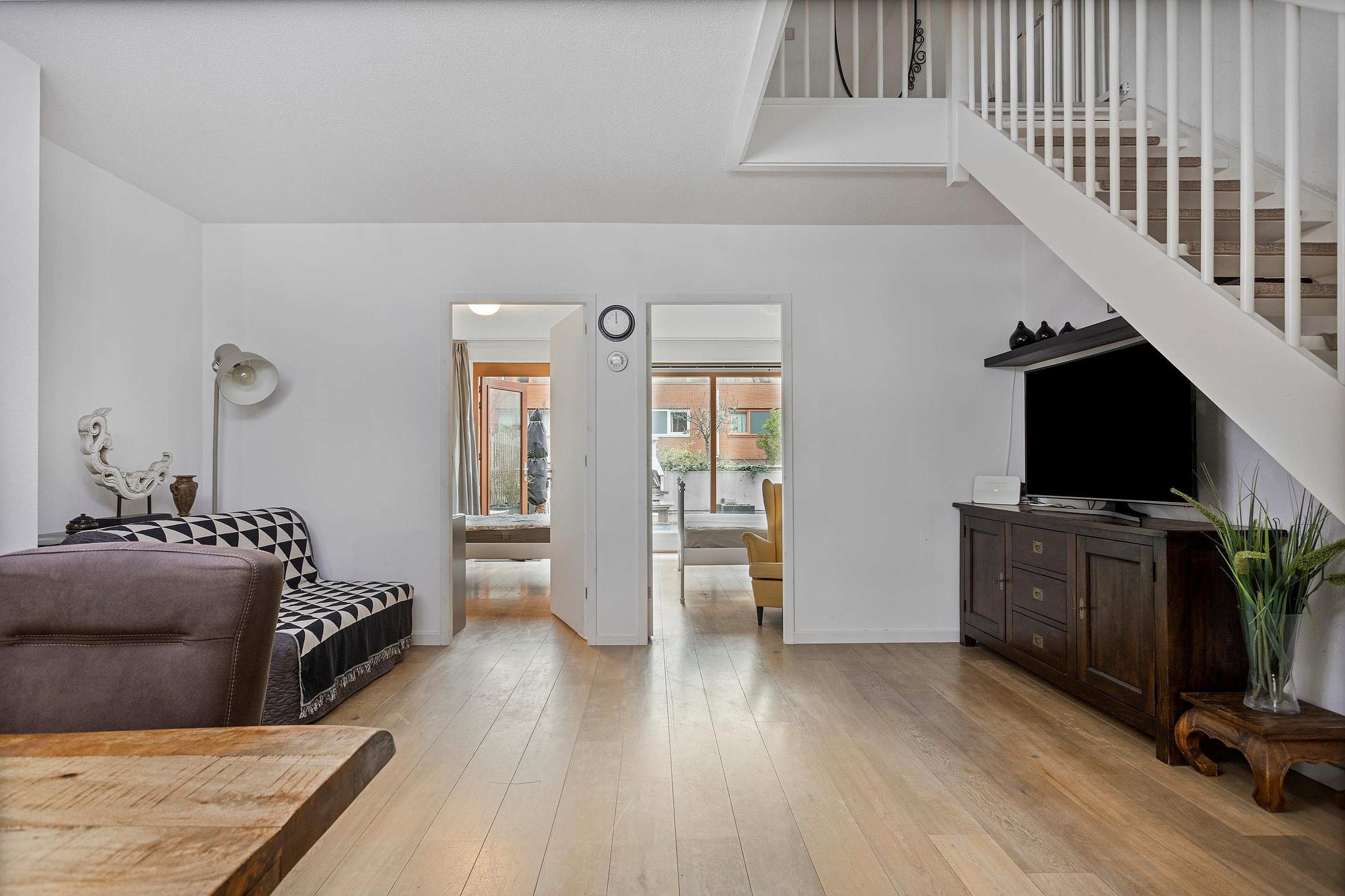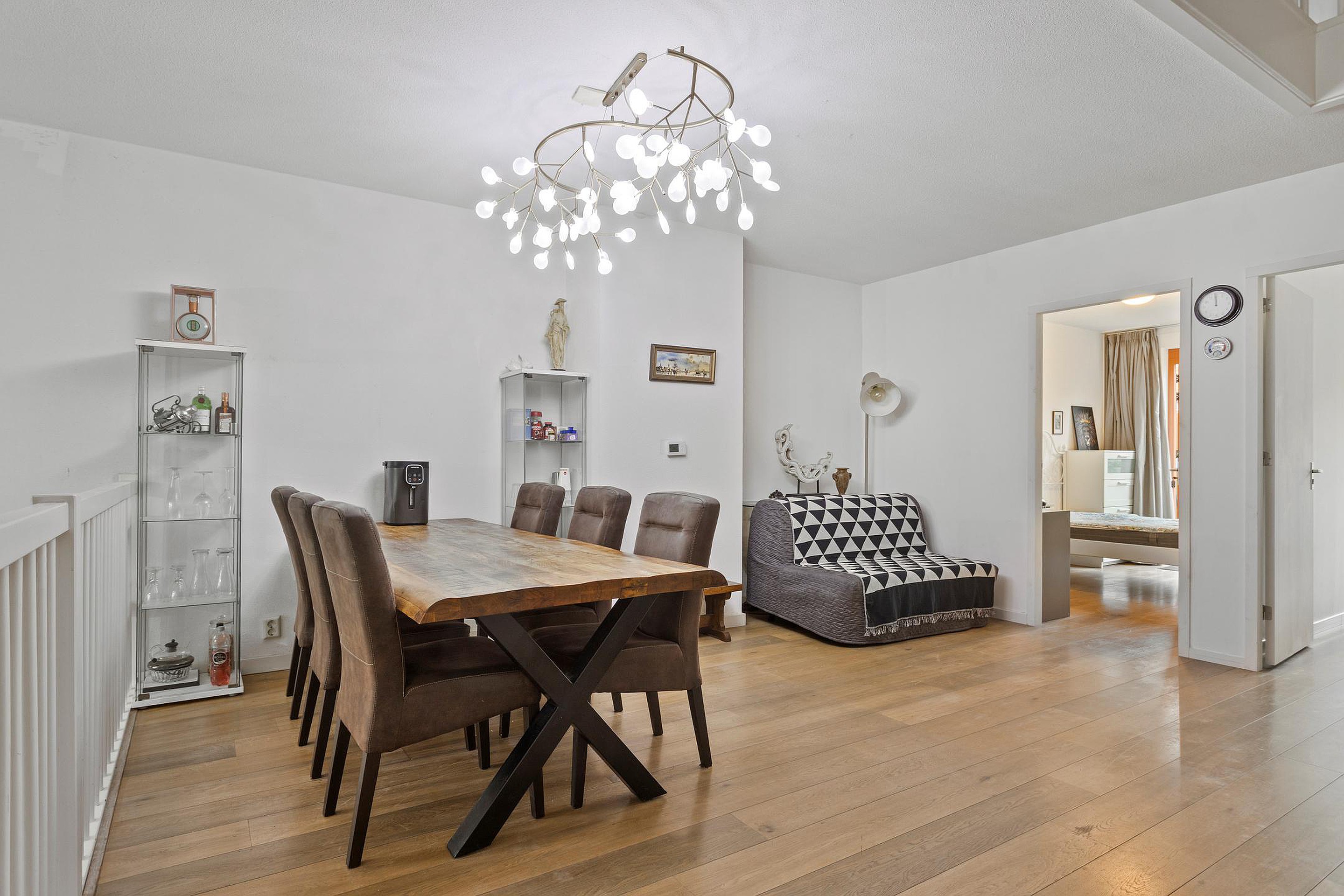 De woonkamer bevindt zich op het tweede splitlevel, bereikbaar via een klein trappetje, en vormt een indrukwekkende leefruimte met een open, moderne uitstraling. Grote raampartijen zorgen voor een uitstekende lichtinval en een prettig ruimtelijk gevoel. Dankzij de splitlevel-indeling is er mooi overzicht richting de keuken op het lagere niveau.