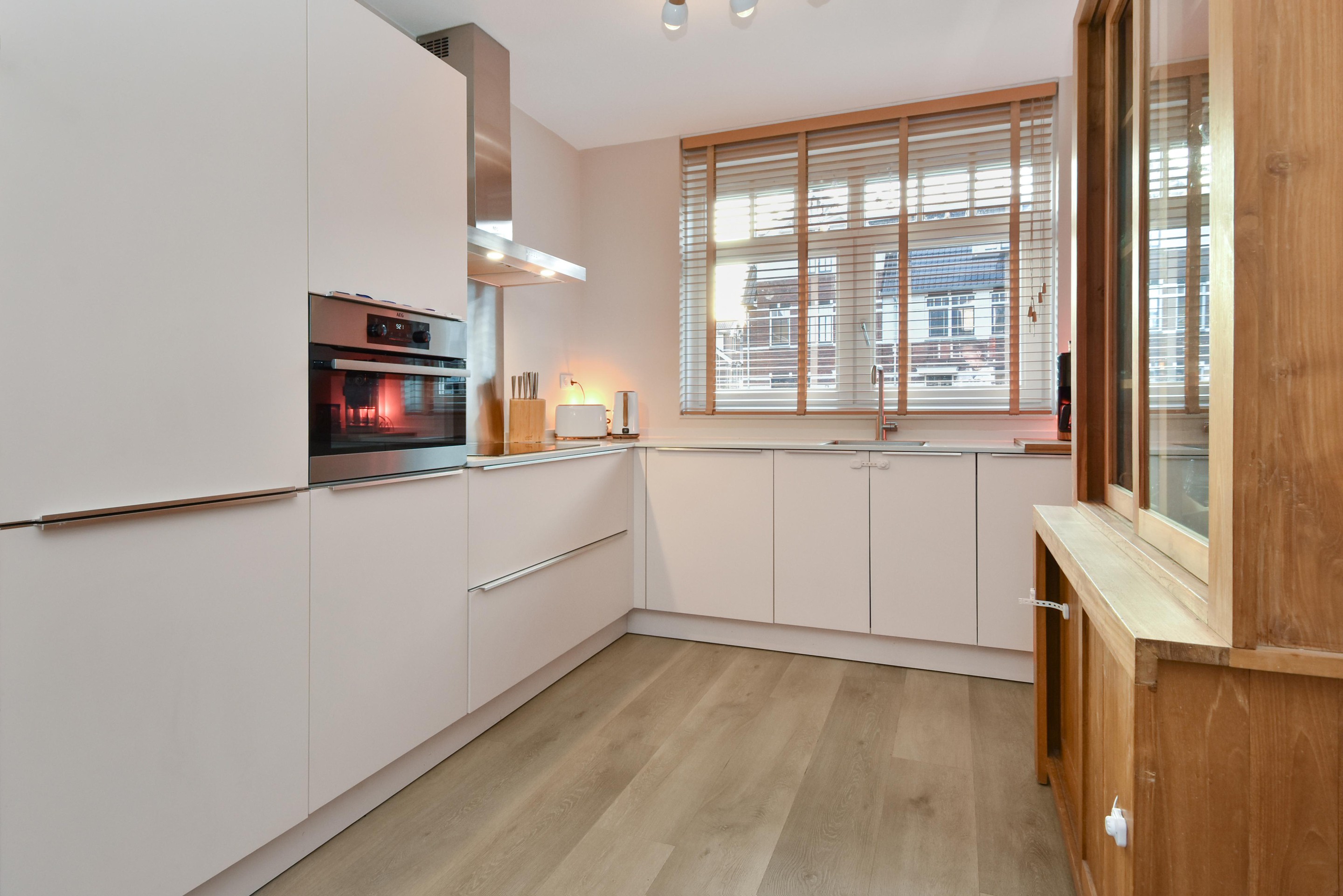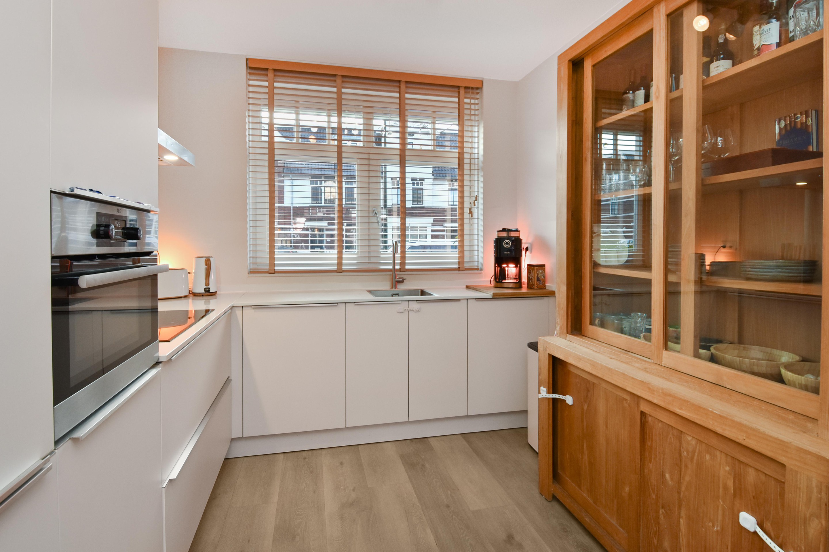 De moderne keuken aan de voorzijde heeft een neutrale kleurstelling en is voorzien van alle gemakken: inductiekookplaat met afzuigkap, combi-oven, inbouwkoel-/vrieskast en vaatwasser.