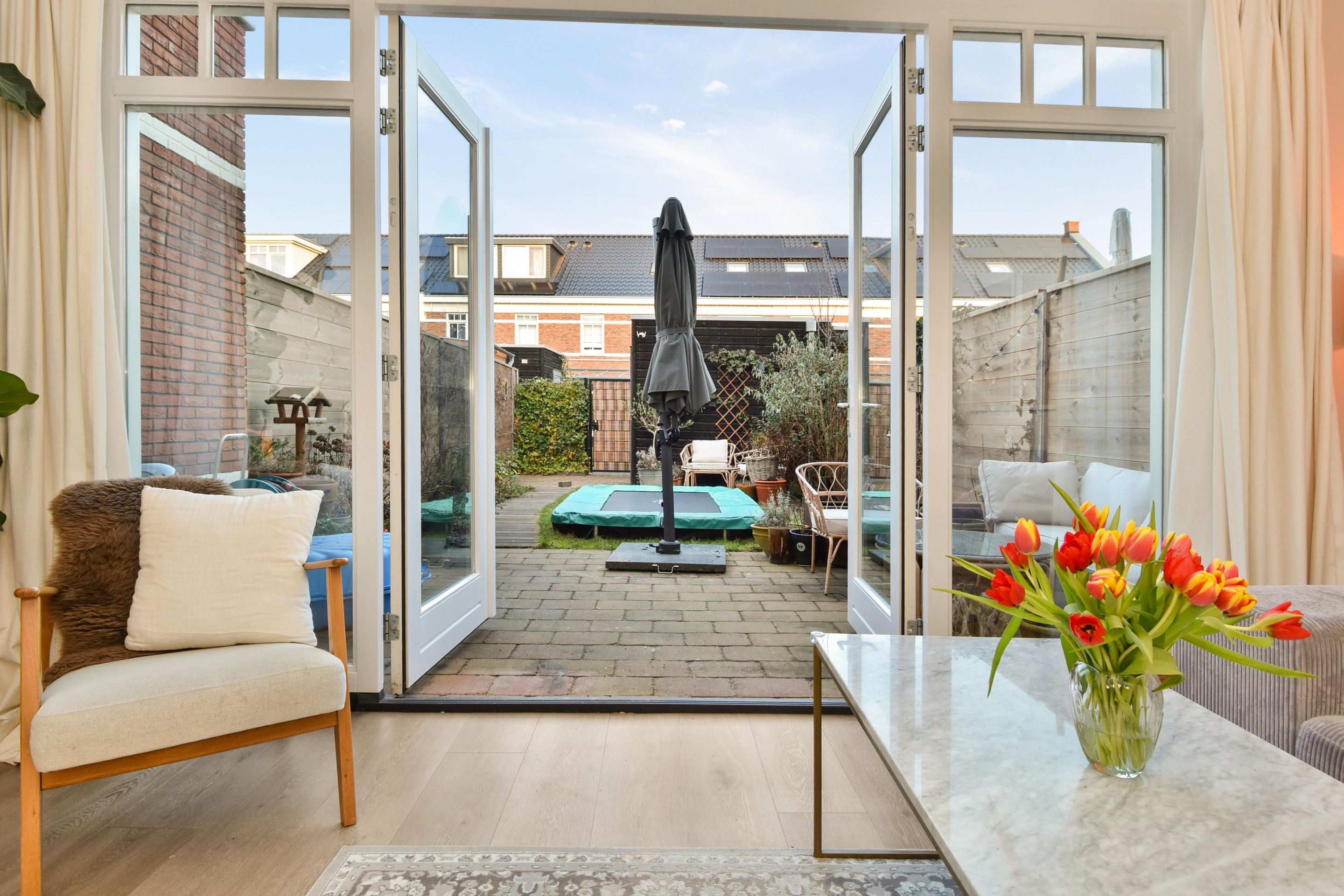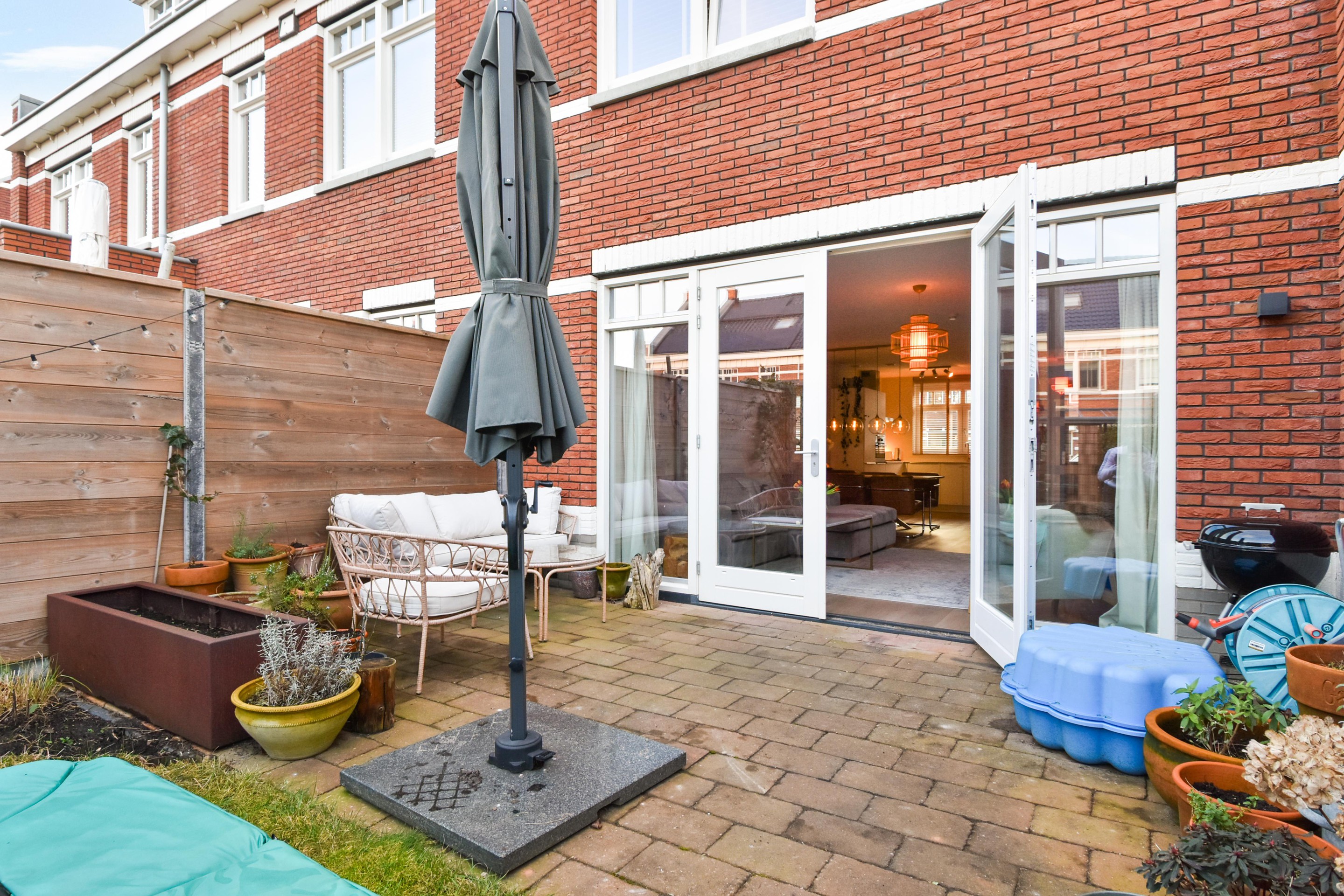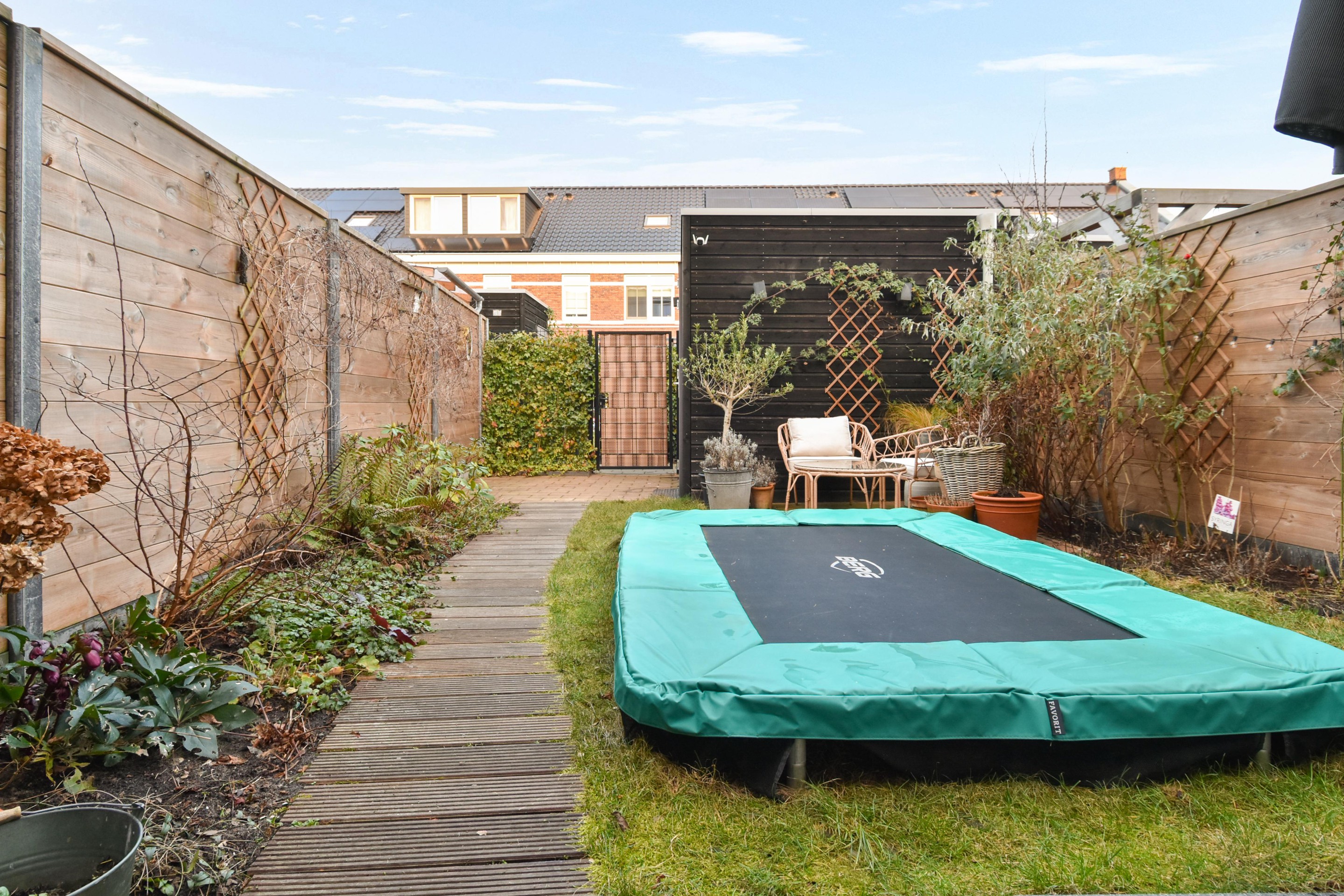 De fraai aangelegde achtertuin is diep, groen en zonnig. Met een vrijstaande berging en achterom – ideaal voor fietsen, speelgoed of tuingereedschap.