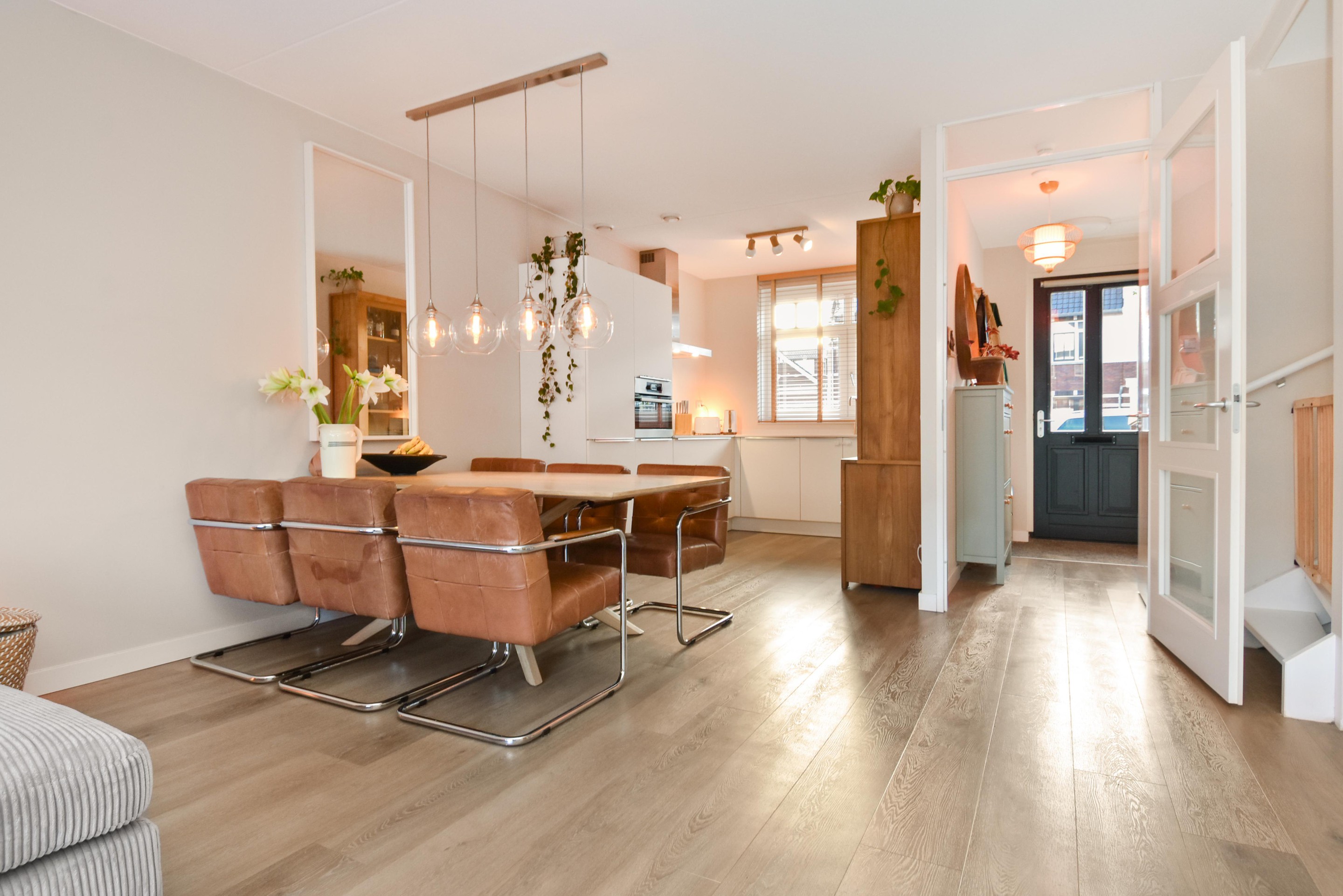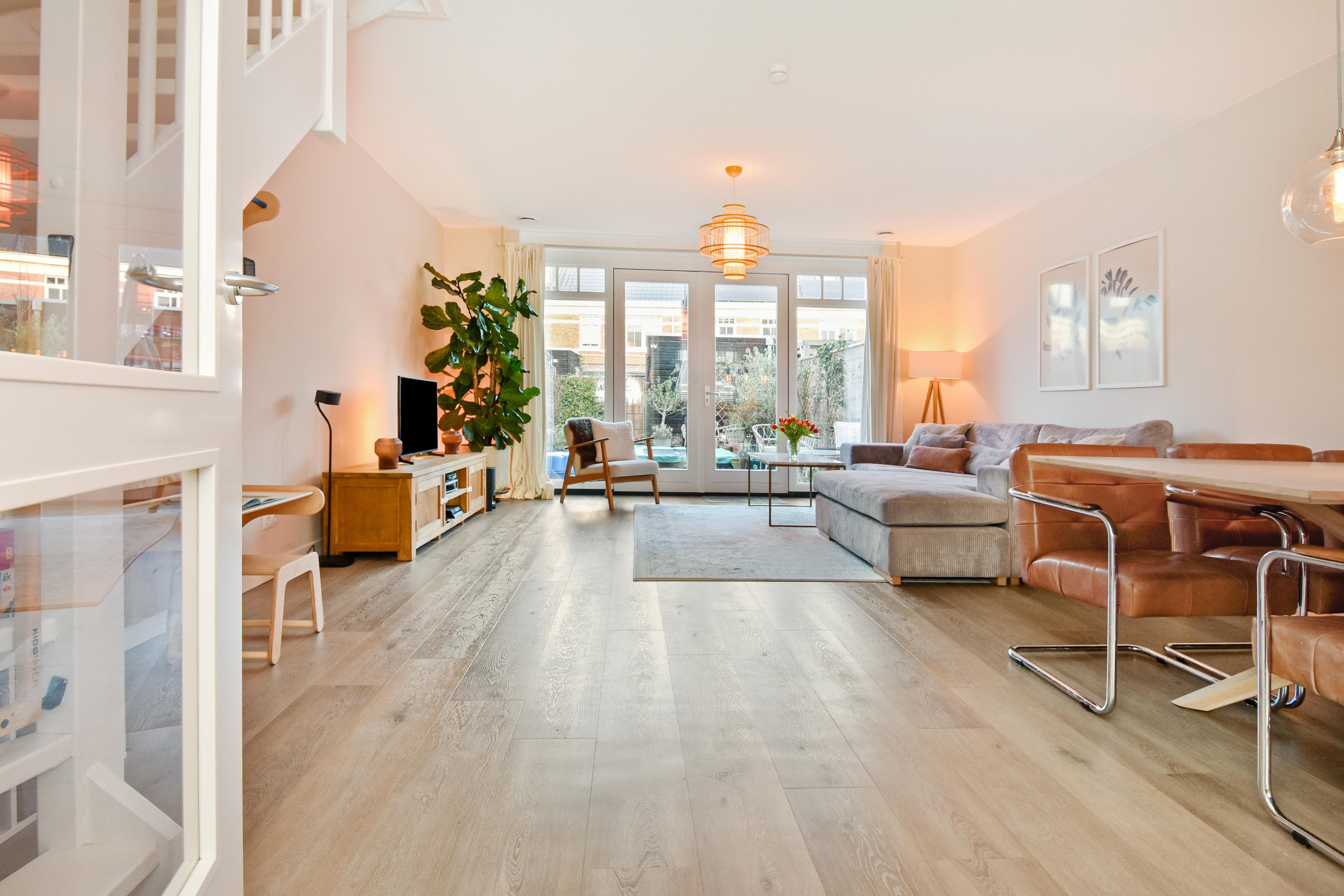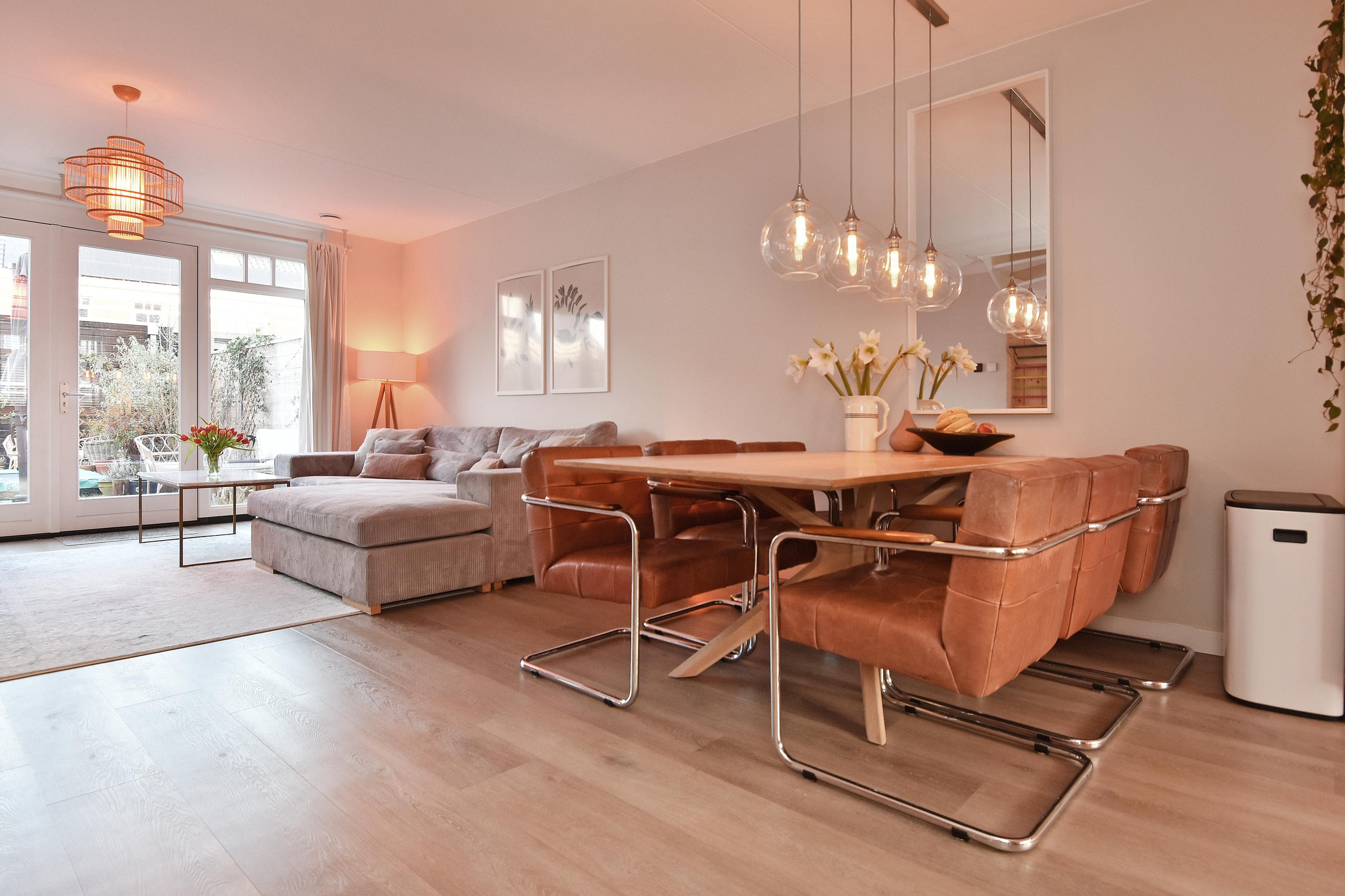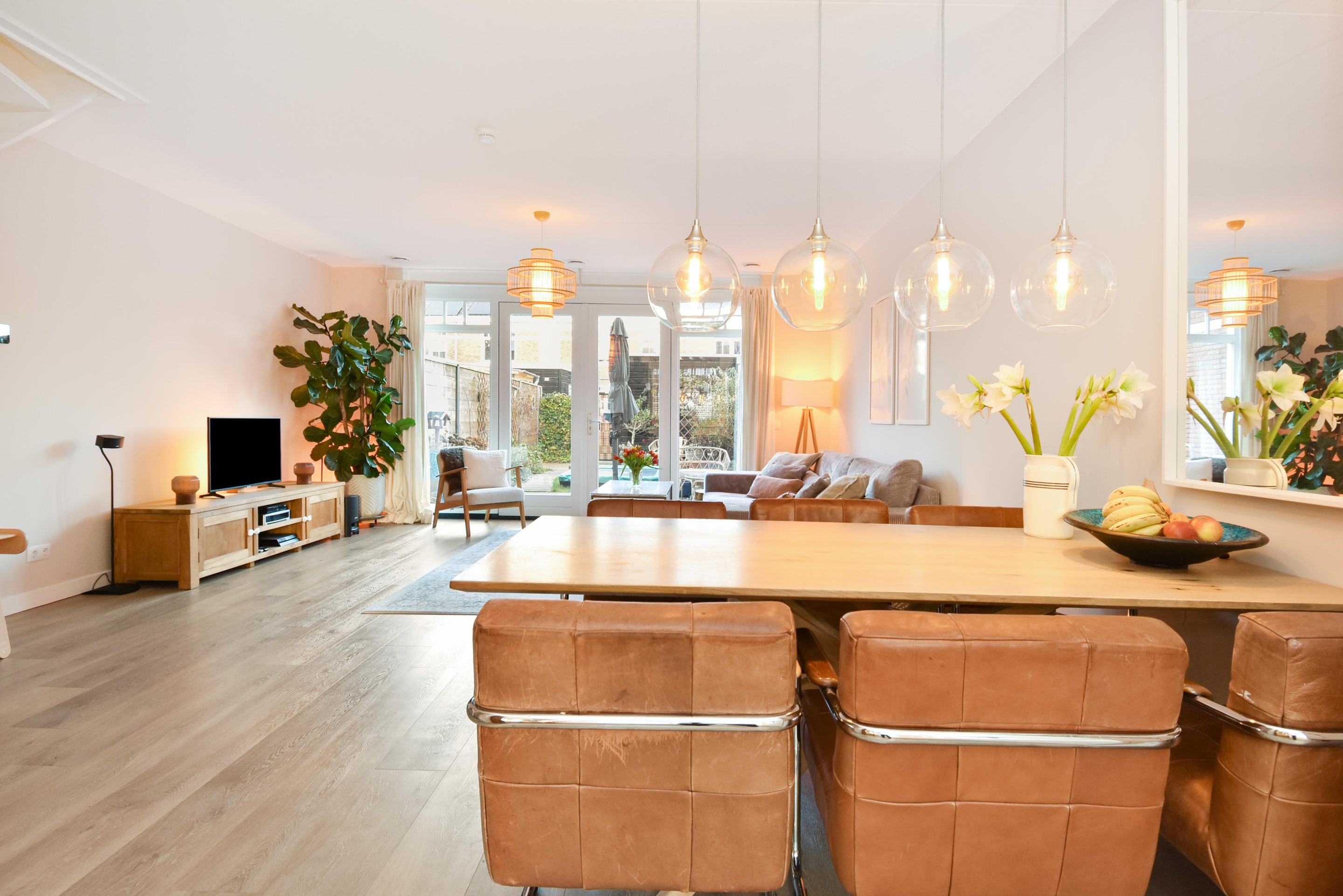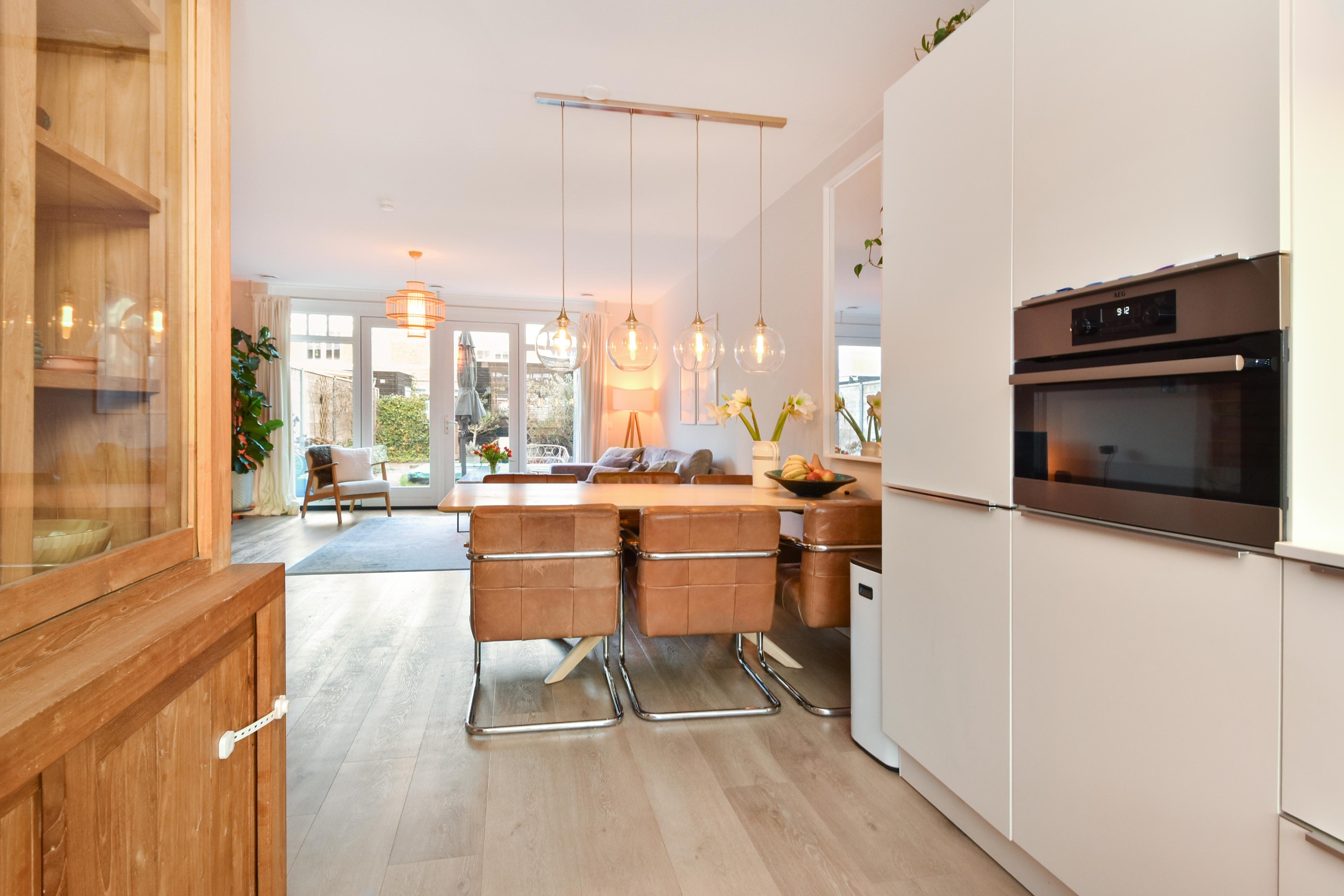 De ruime woon-/eetkamer is een fijne plek voor het hele gezin, met een rustige uitstraling, glad afgewerkte wanden en plafond, en openslaande deuren naar de tuin.