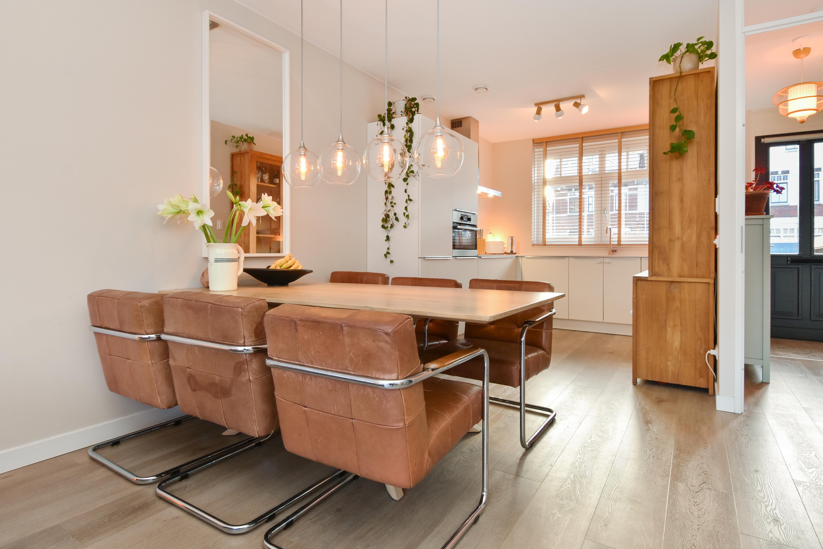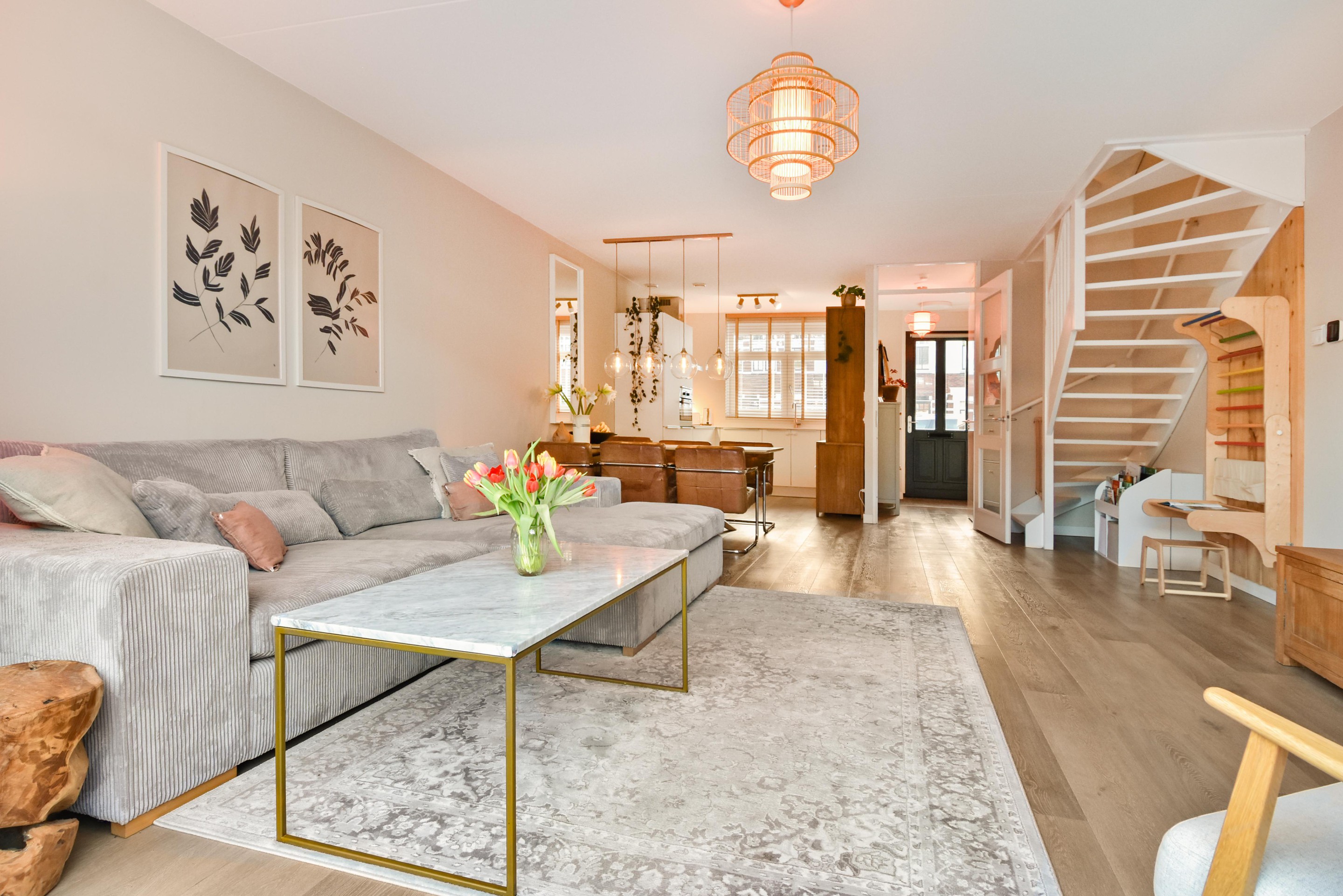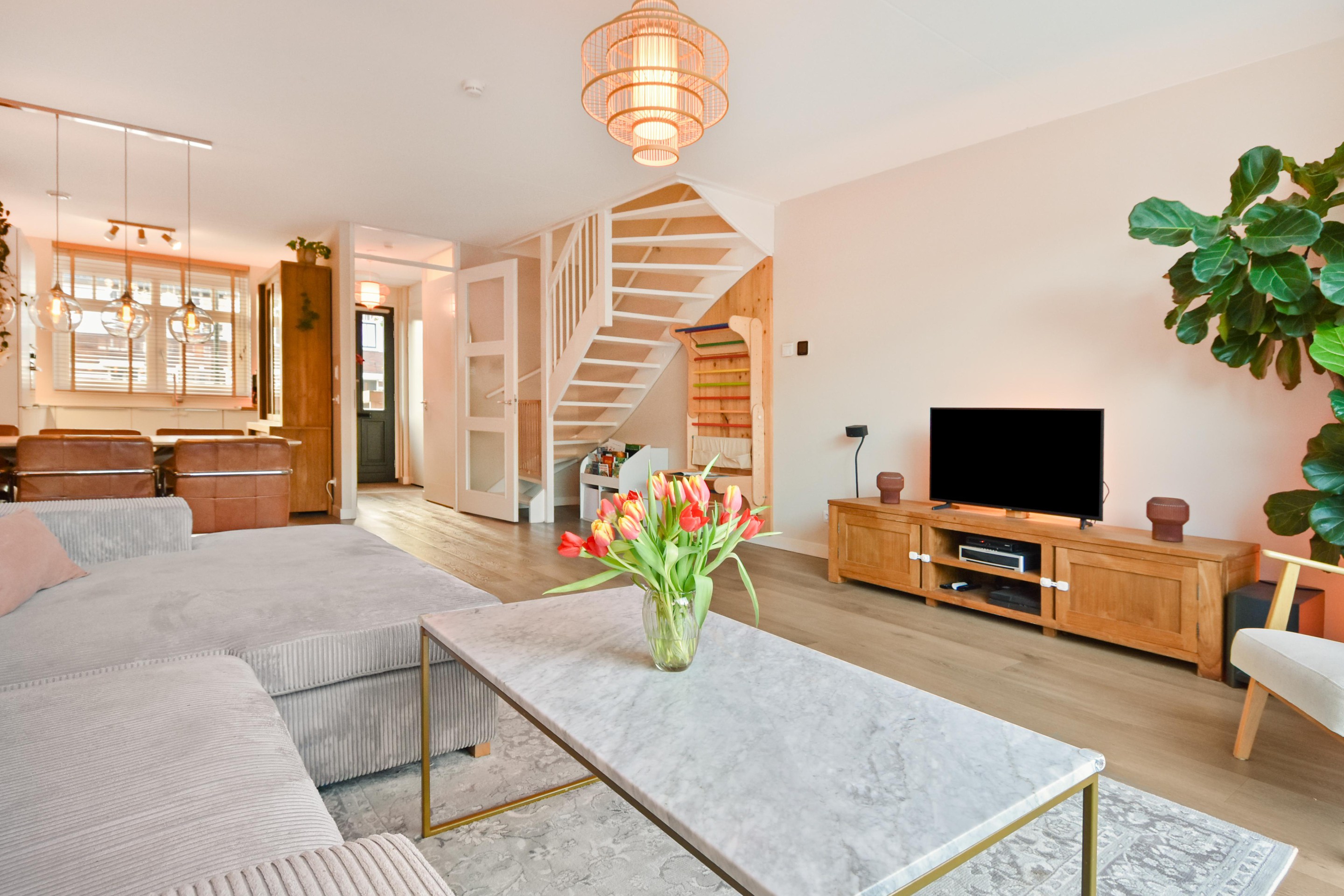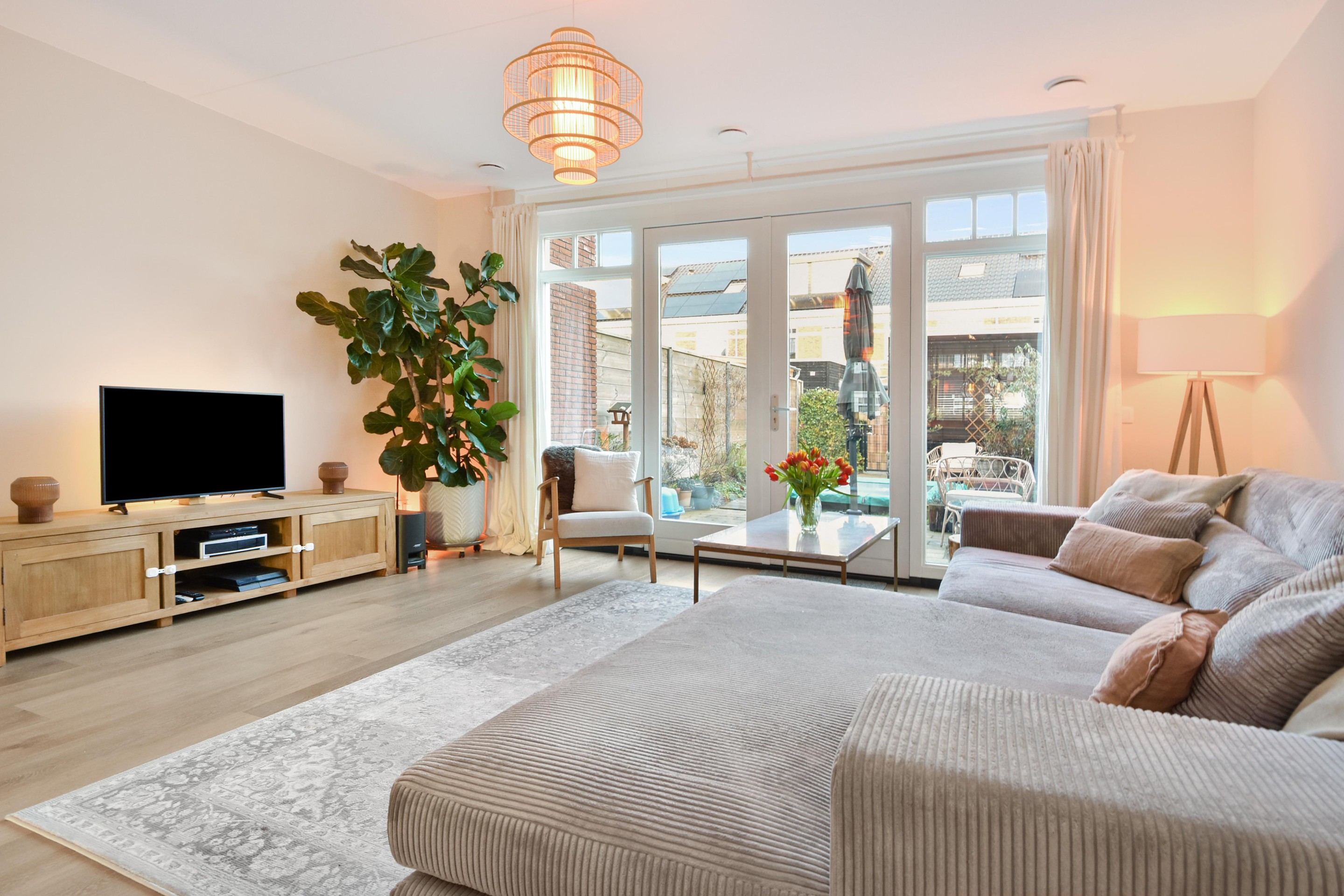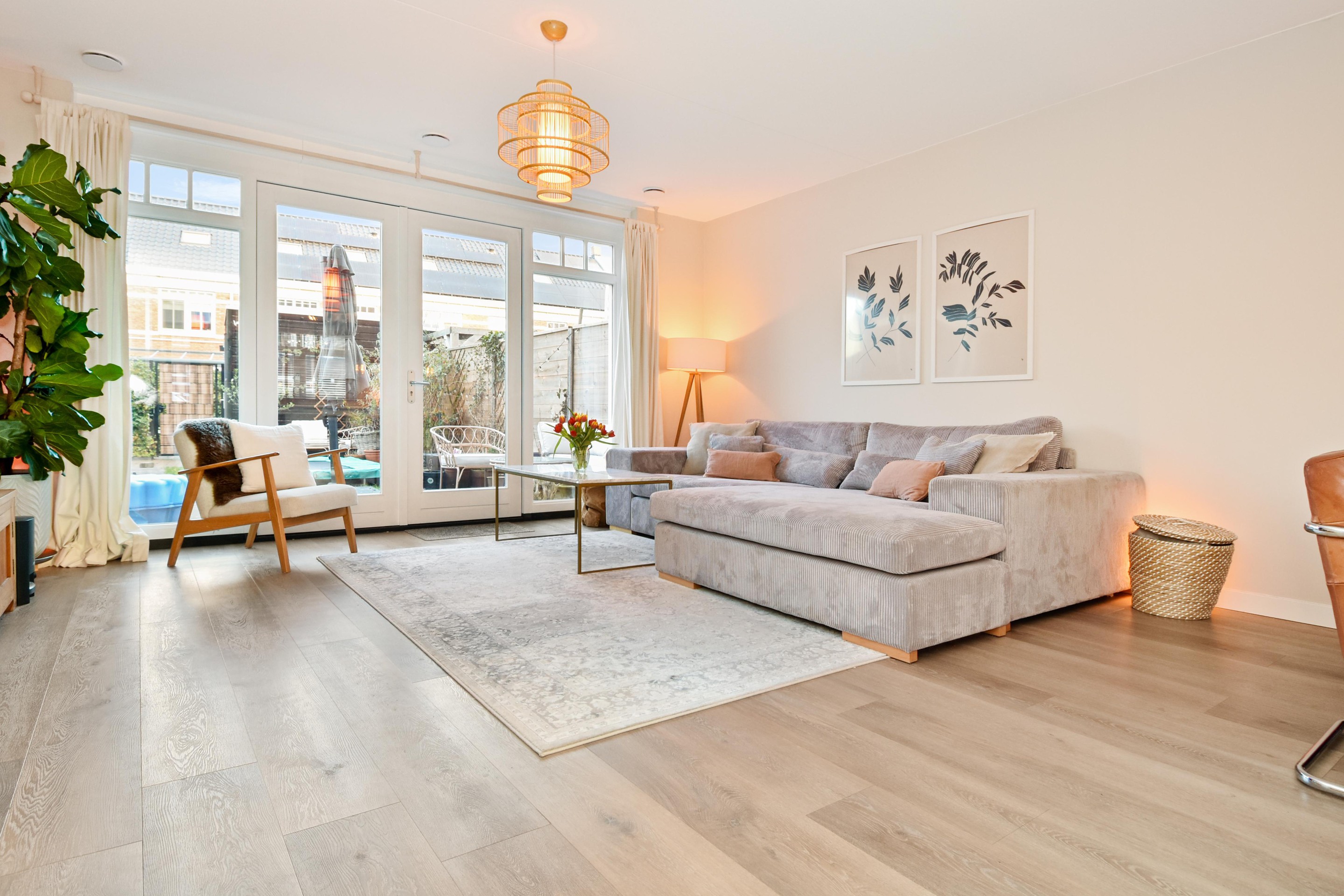 De ruime woon-/eetkamer is een fijne plek voor het hele gezin, met een rustige uitstraling, glad afgewerkte wanden en plafond, en openslaande deuren naar de tuin.
