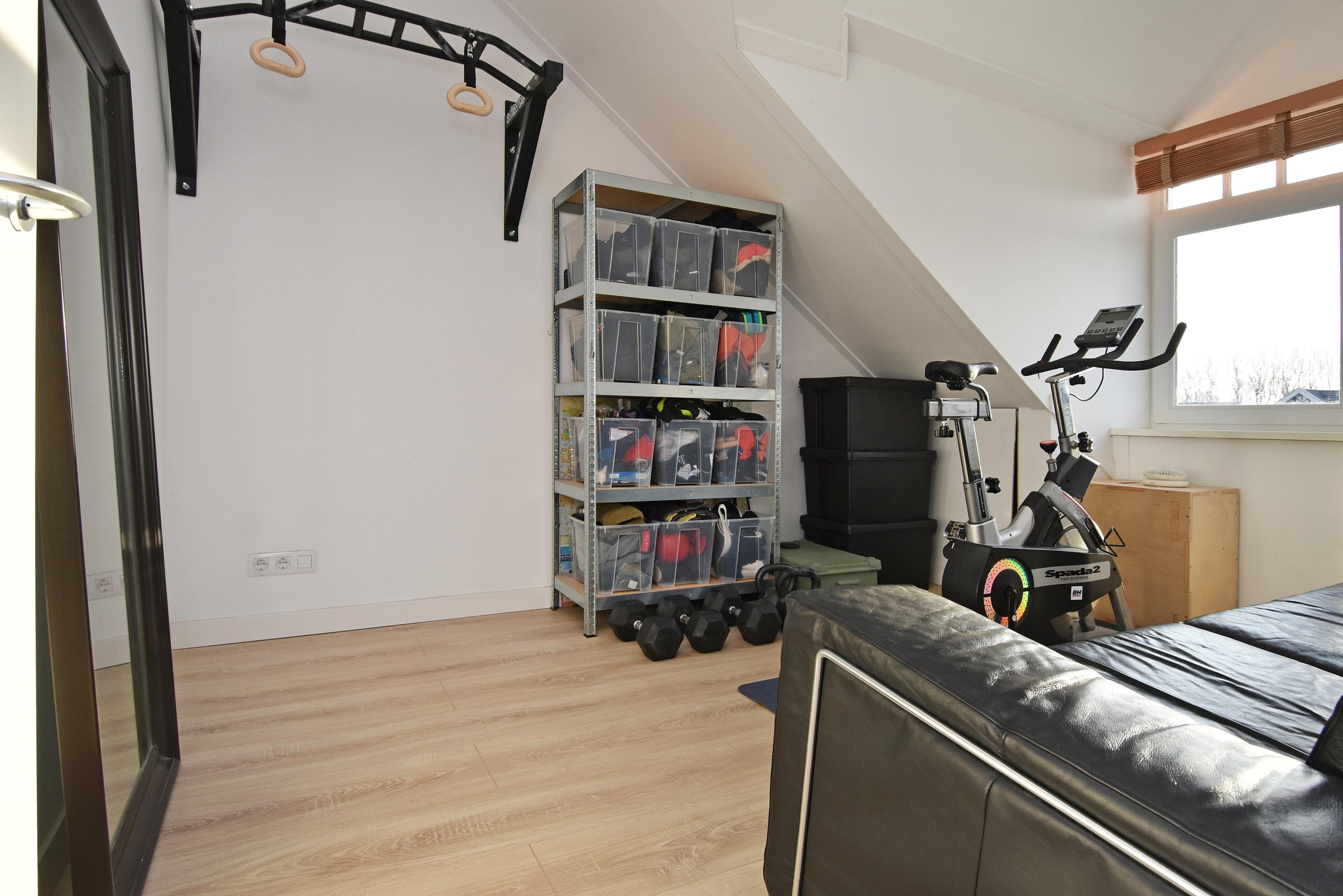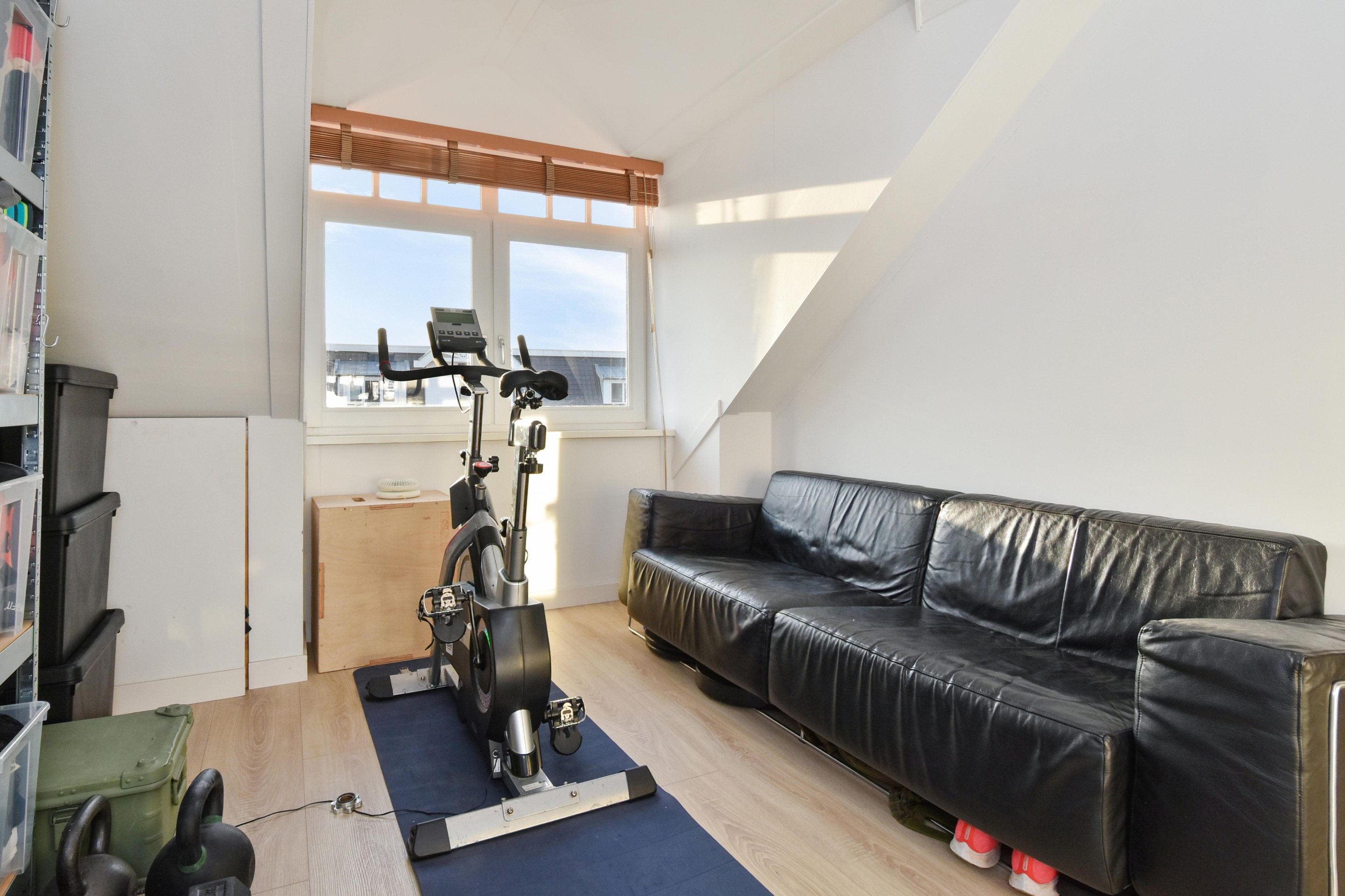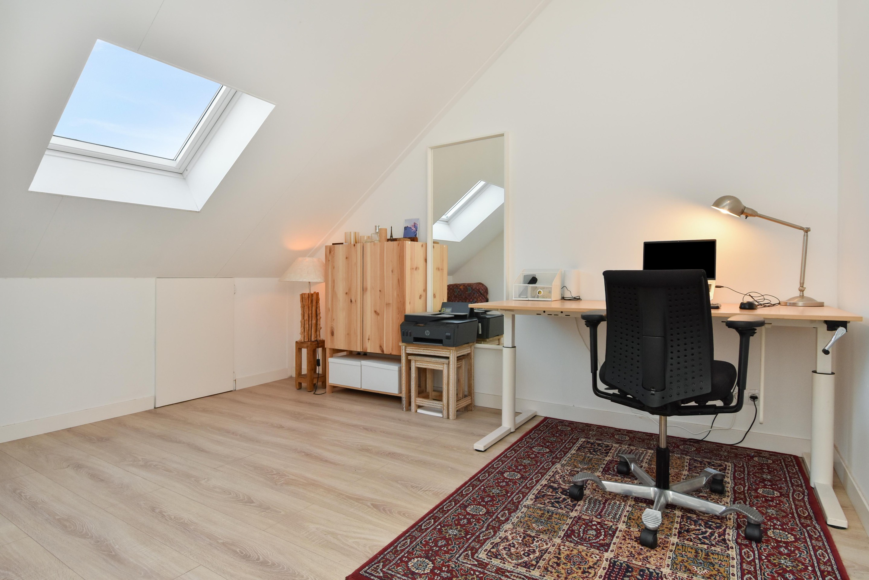 Een verrassend ruim ingedeelde zolderverdieping met aan de achterzijde een slaap-/werkkamer voorzien van dakraam, knieschotten en toegang tot de inloopkast (eveneens met dakraam).