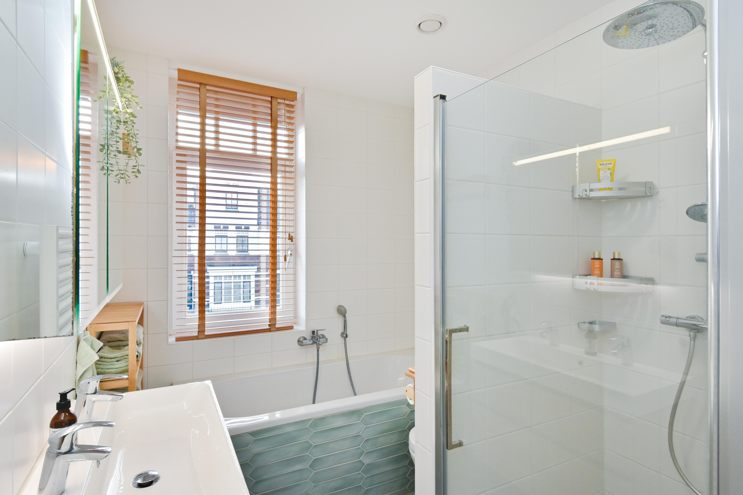 De moderne badkamer is smaakvol ingericht met een inloopdouche, zwevend toilet, ligbad, wastafelmeubel en verlichte spiegel.