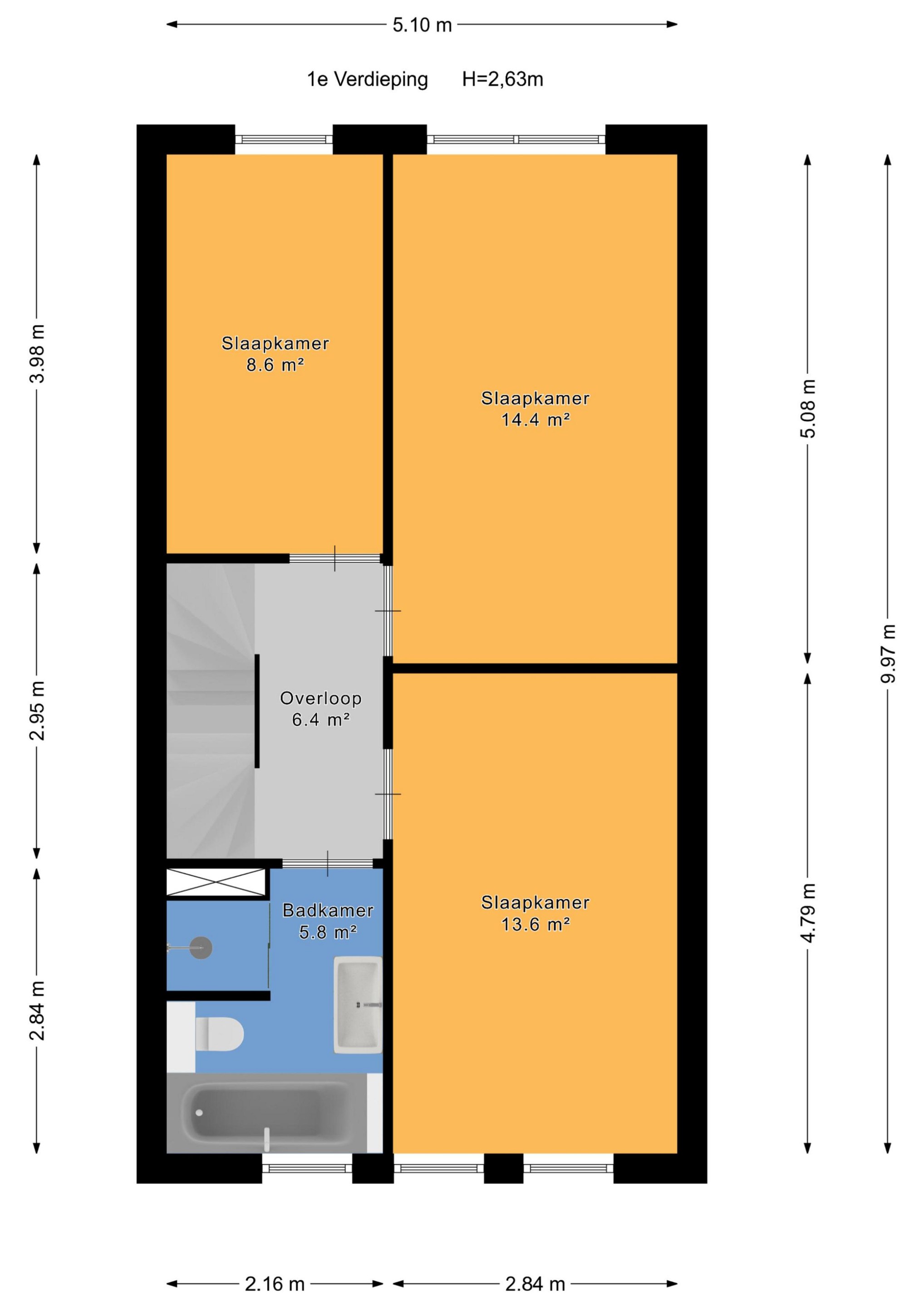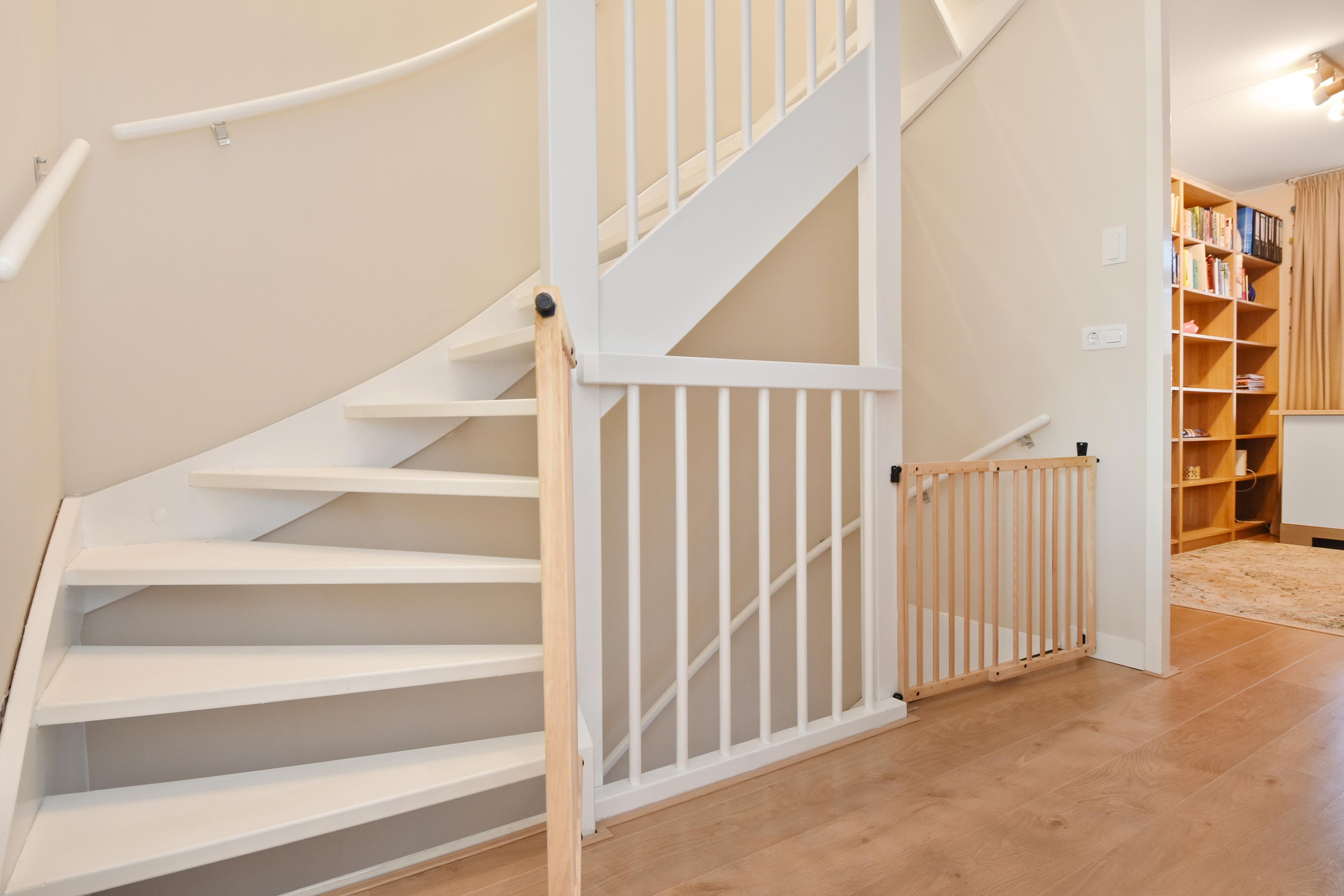 Overloop met toegang tot drie slaapkamers: twee royale kamers en een compacte kinderkamer of werkkamer.