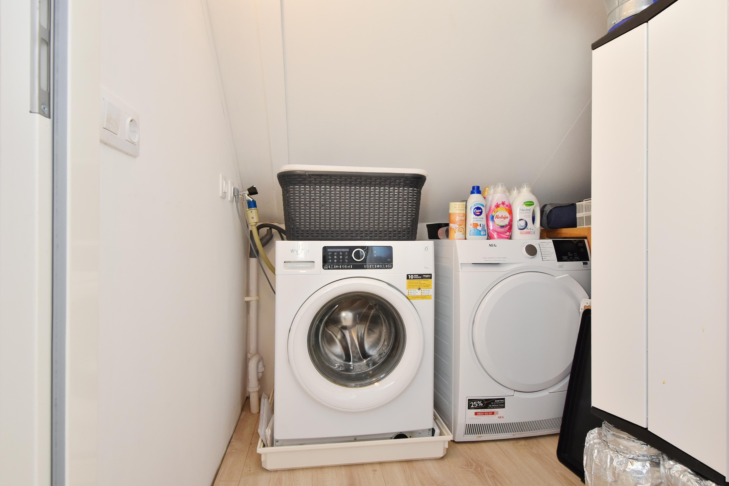 Aan de voorzijde bevindt zich de vijfde slaapkamer met dakkapel, en daarnaast een aparte wasruimte met aansluitingen voor wasmachine, droger en de WTW-installatie.