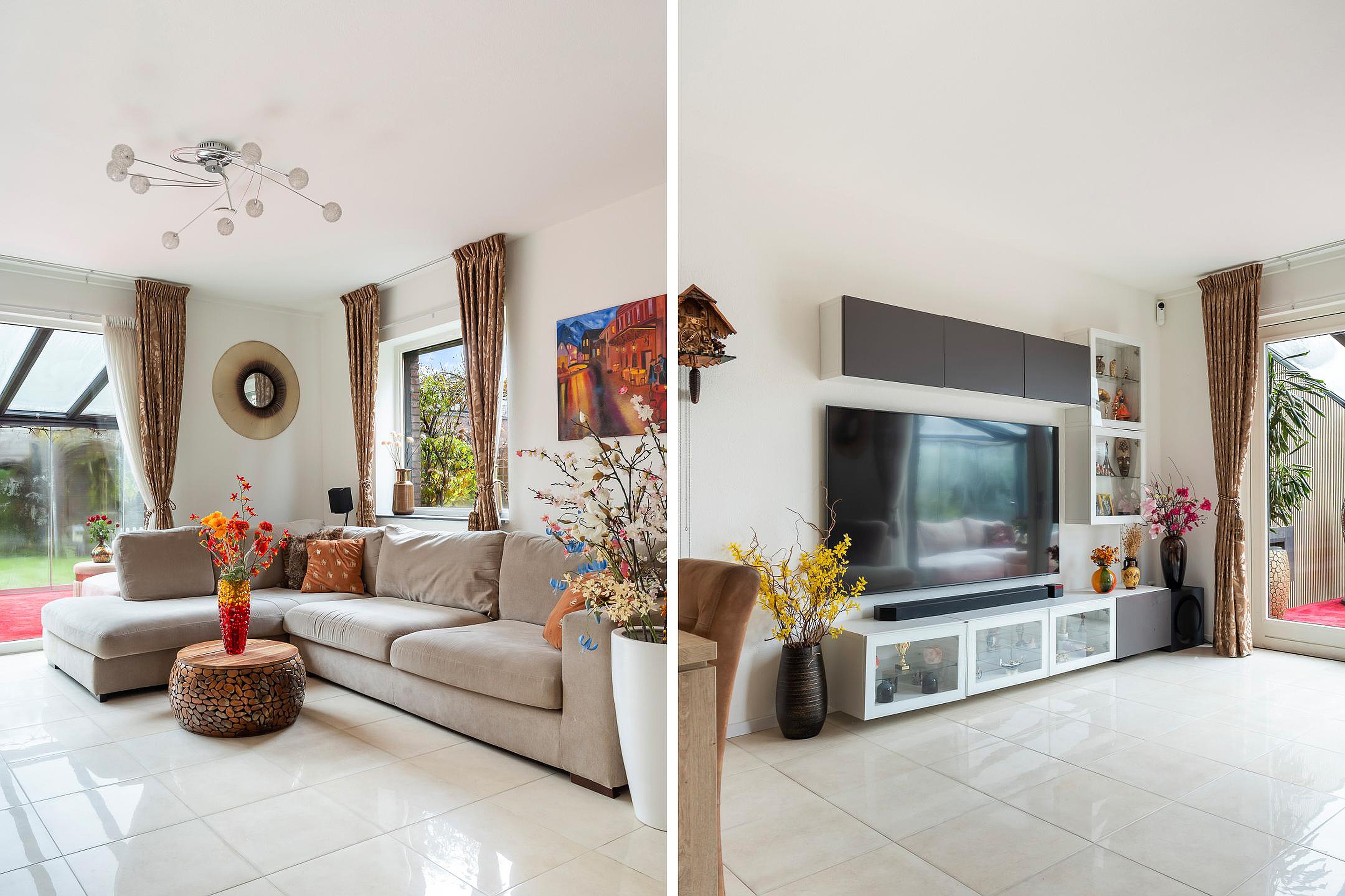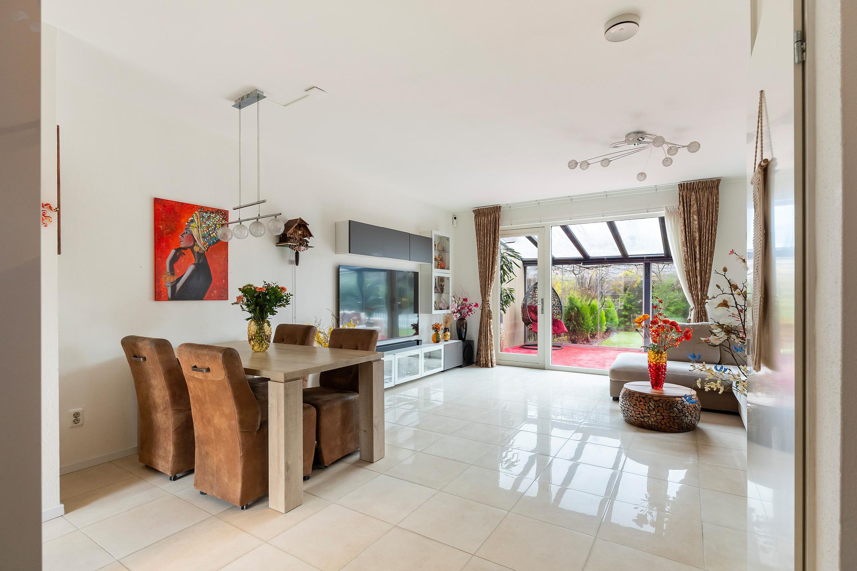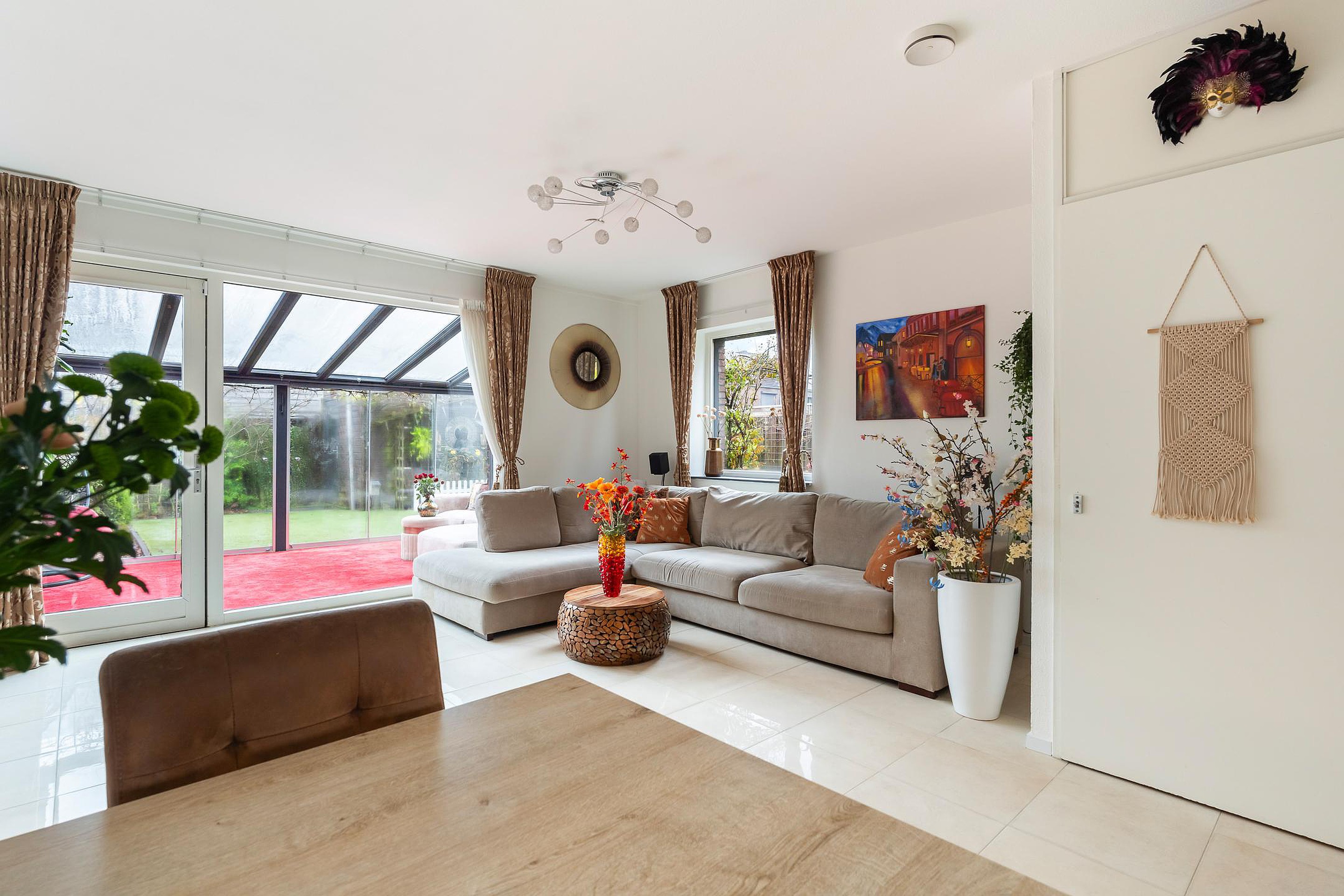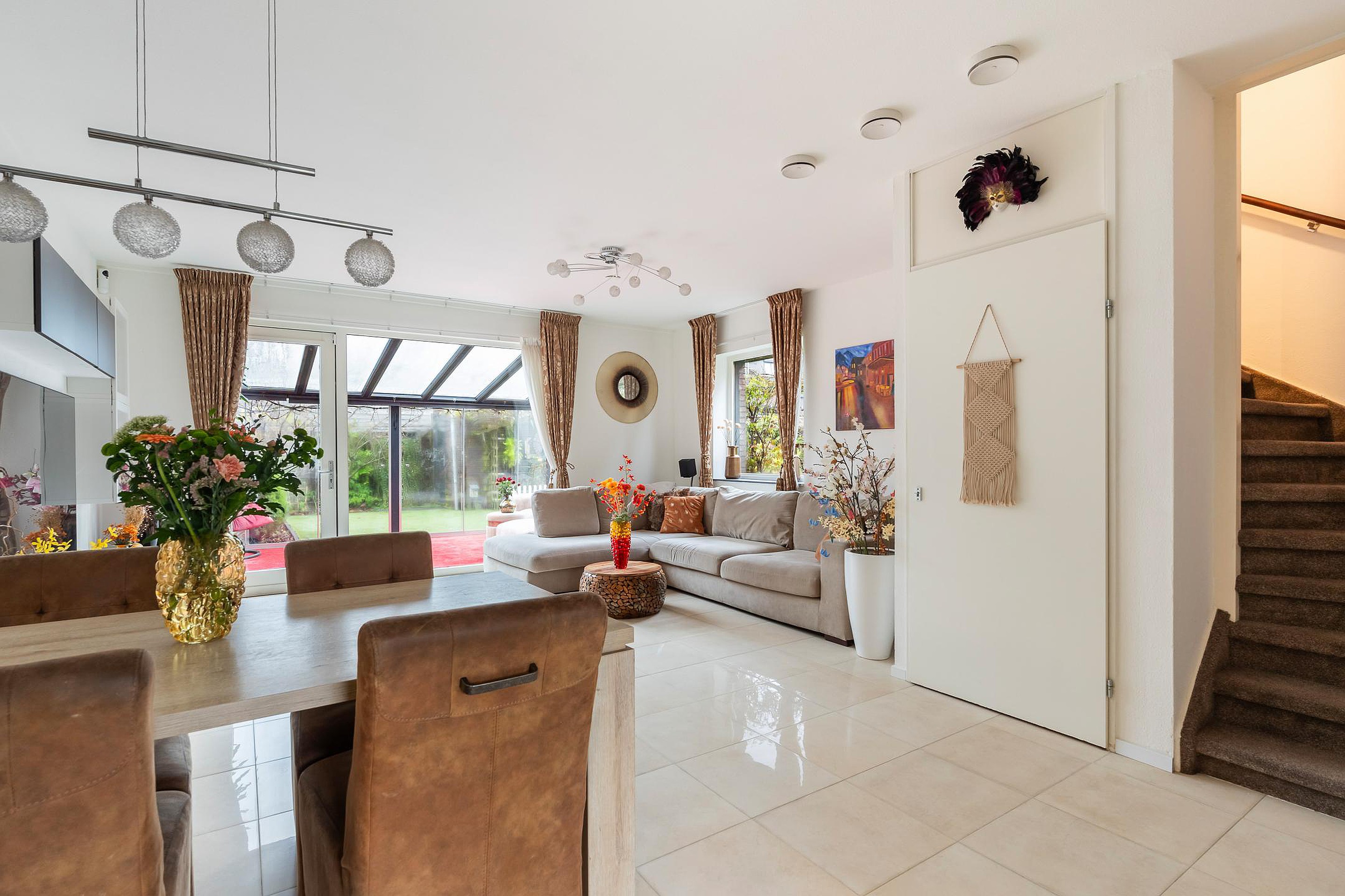 De woonkamer is tuingericht en extra licht door het zijraam, met een prachtige tegelvloer, vloerverwarming en openslaande deuren naar de ruime serre van maar liefst 19 m2. In de serre kun je het hele jaar door genieten dankzij de schuifdeuren, een bio-ethanol open haard, een infraroodpaneel en een zonnescherm – ideaal voor alle seizoenen.