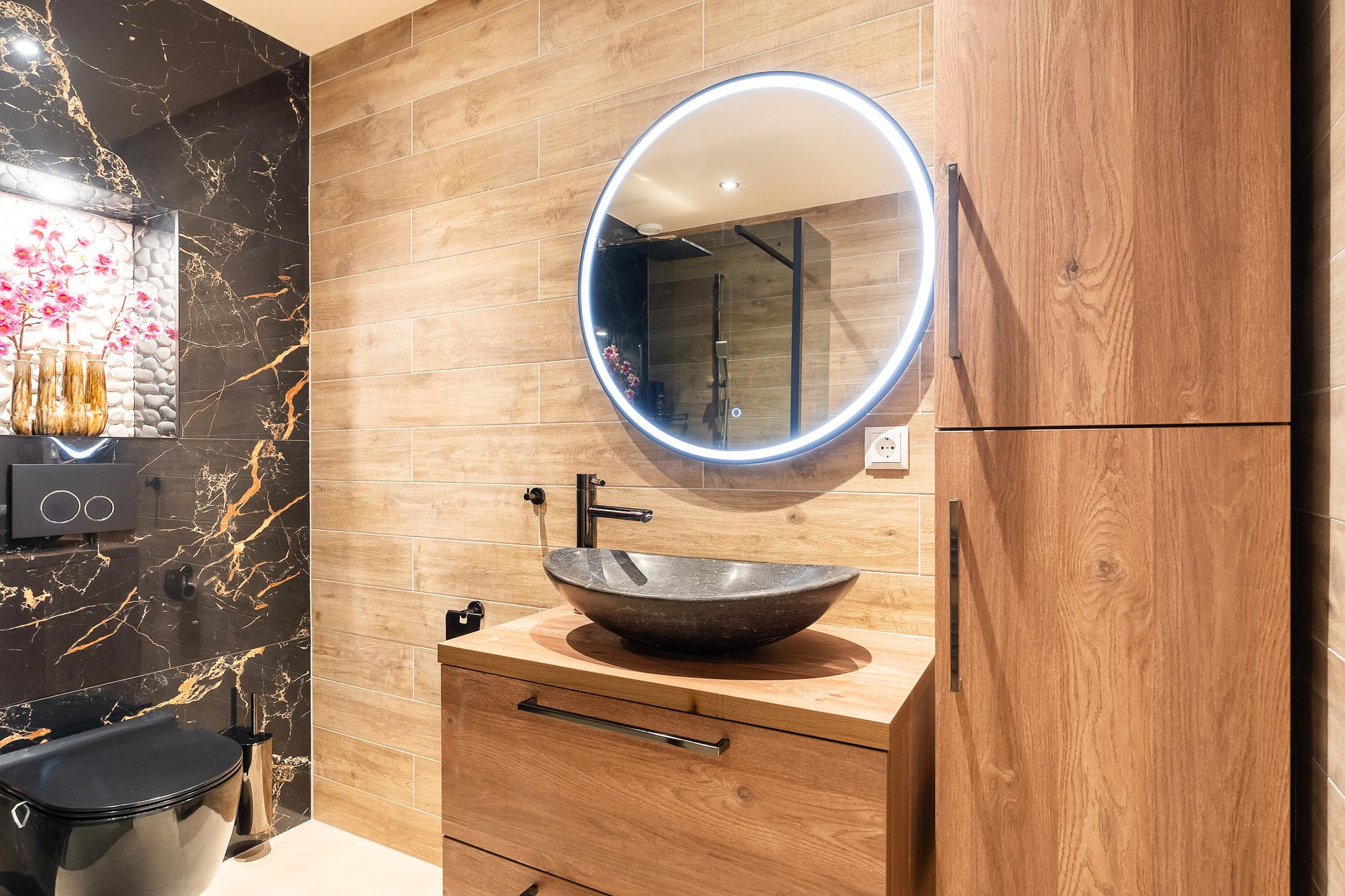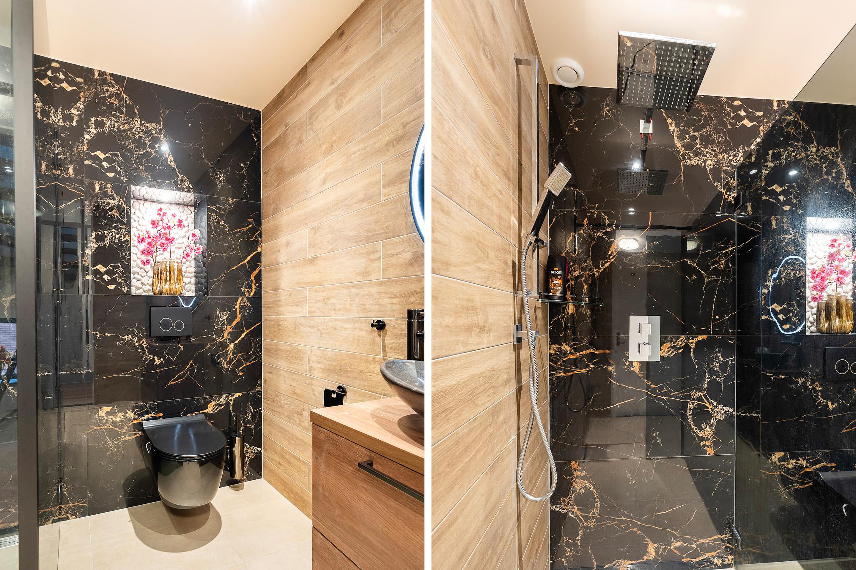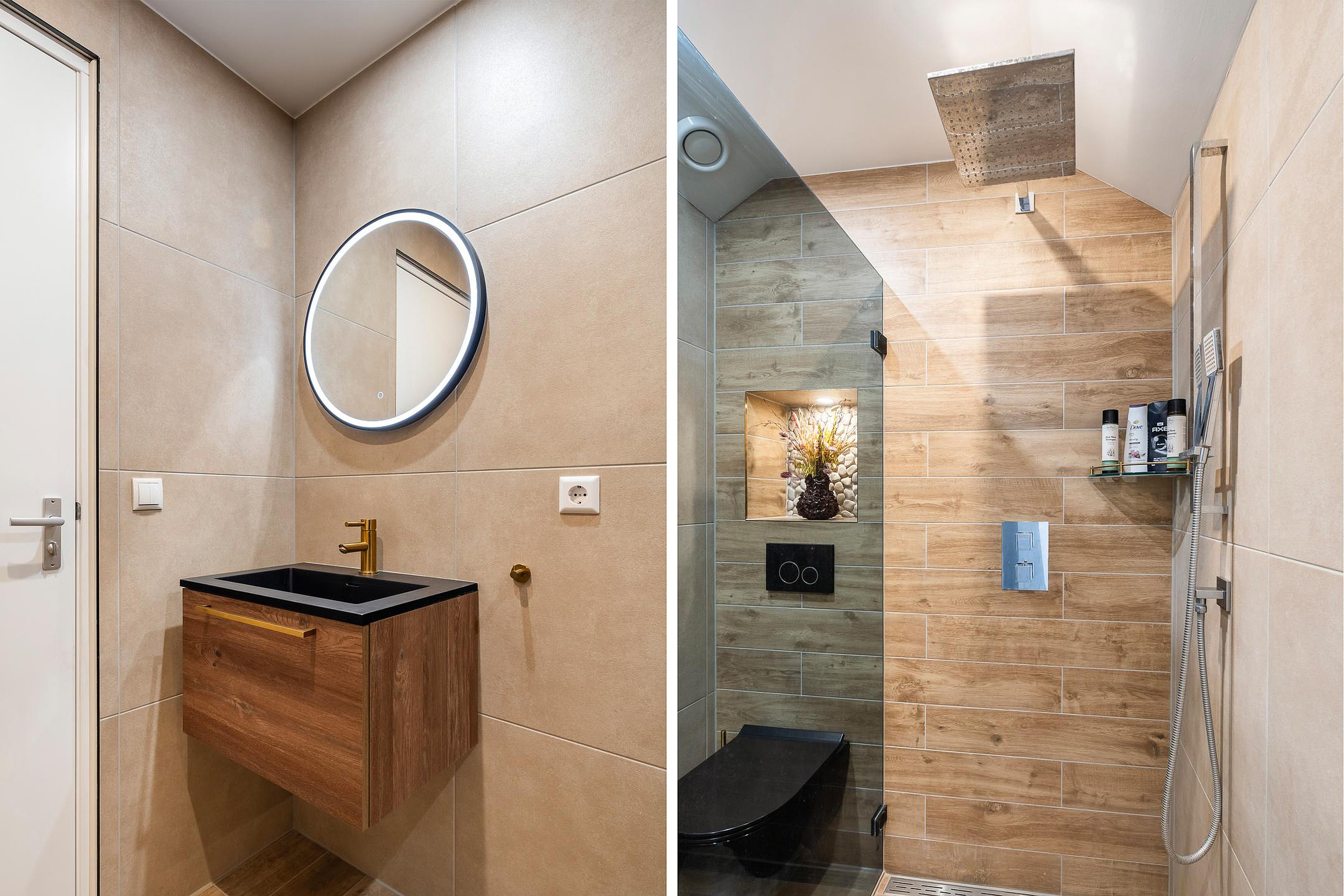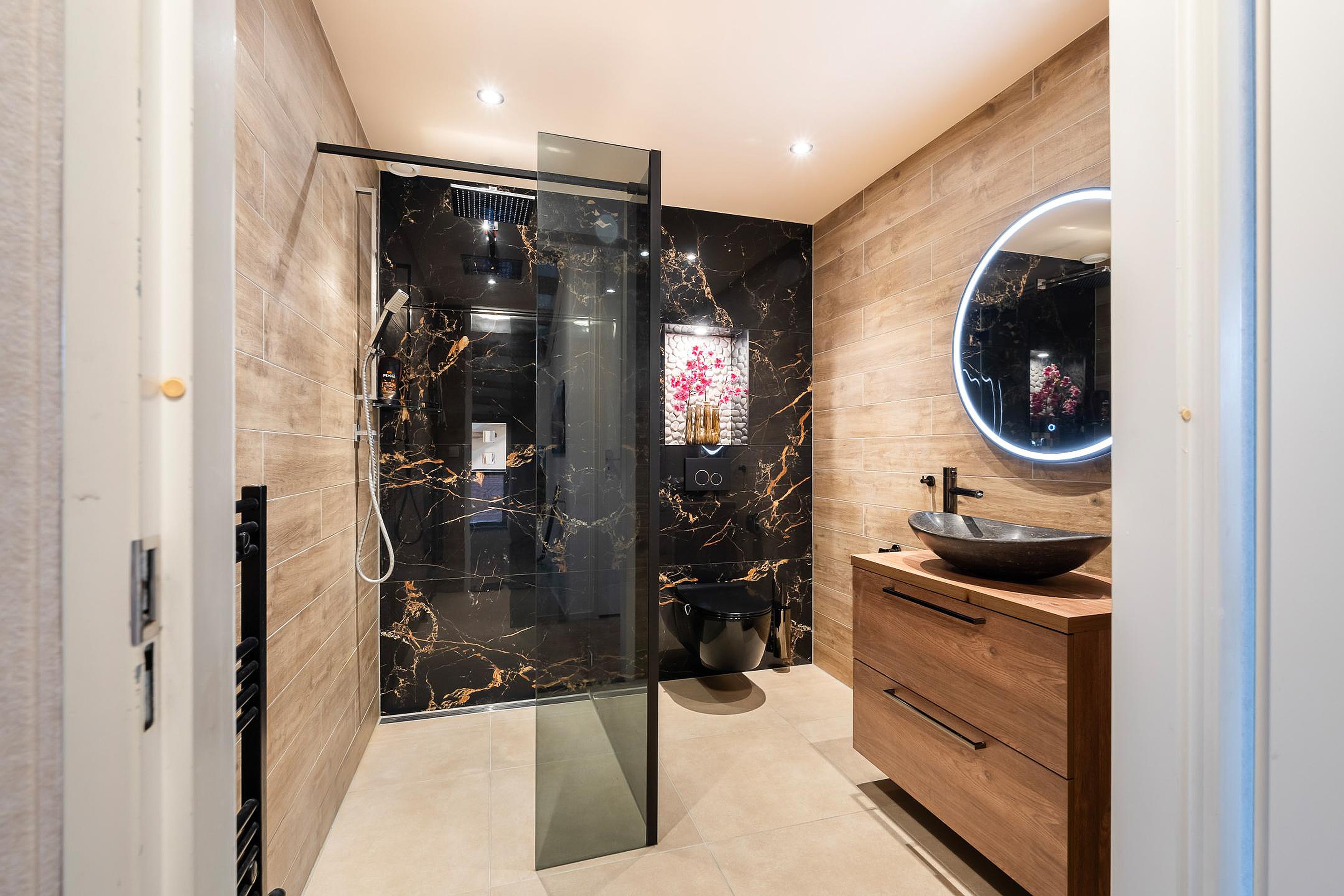 De badkamer is een echte eyecatcher met een riante inloopdouche, zwevend toilet, handdoekradiator en stijlvol wastafelmeubel met ledverlichting.