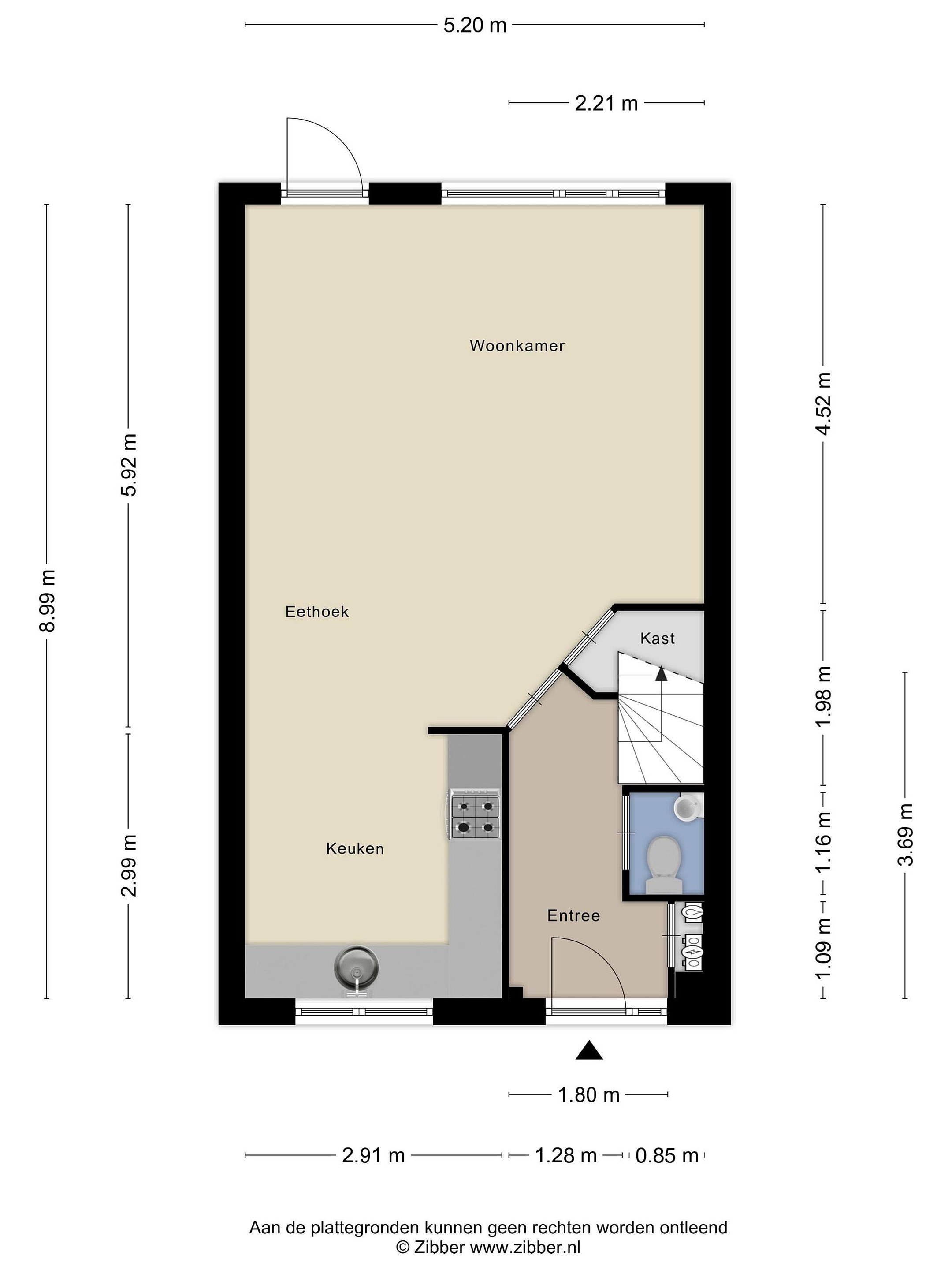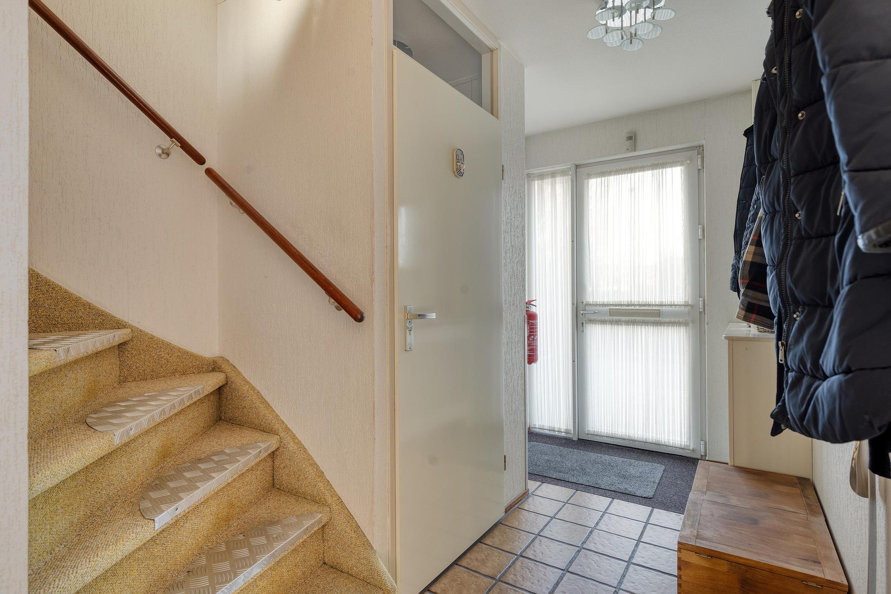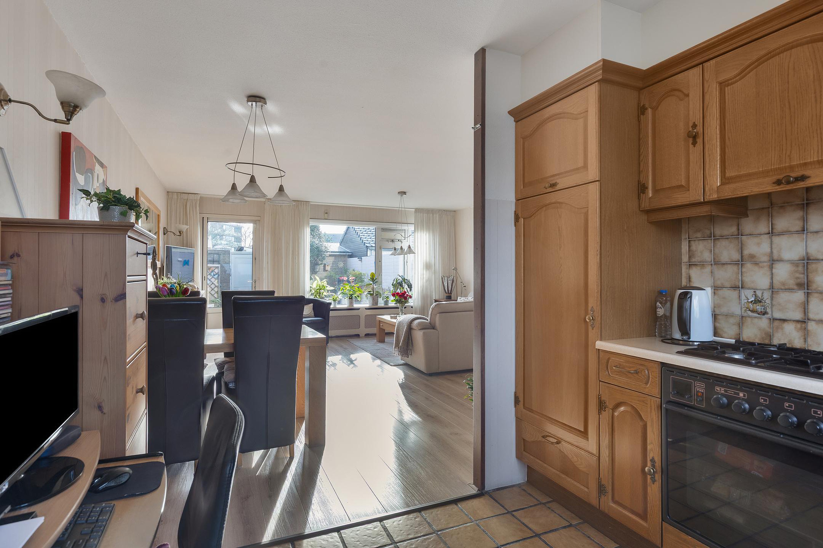 Begane grond: entree, hal met meterkast, bergruimte in de trapkast, toilet met een fonteintje, ruime en lichte doorzonwoonkamer, keuken met enkele inbouwapparaten en een loopdeur naar de diepe achtertuin (Z) met stenen berging en achterom.