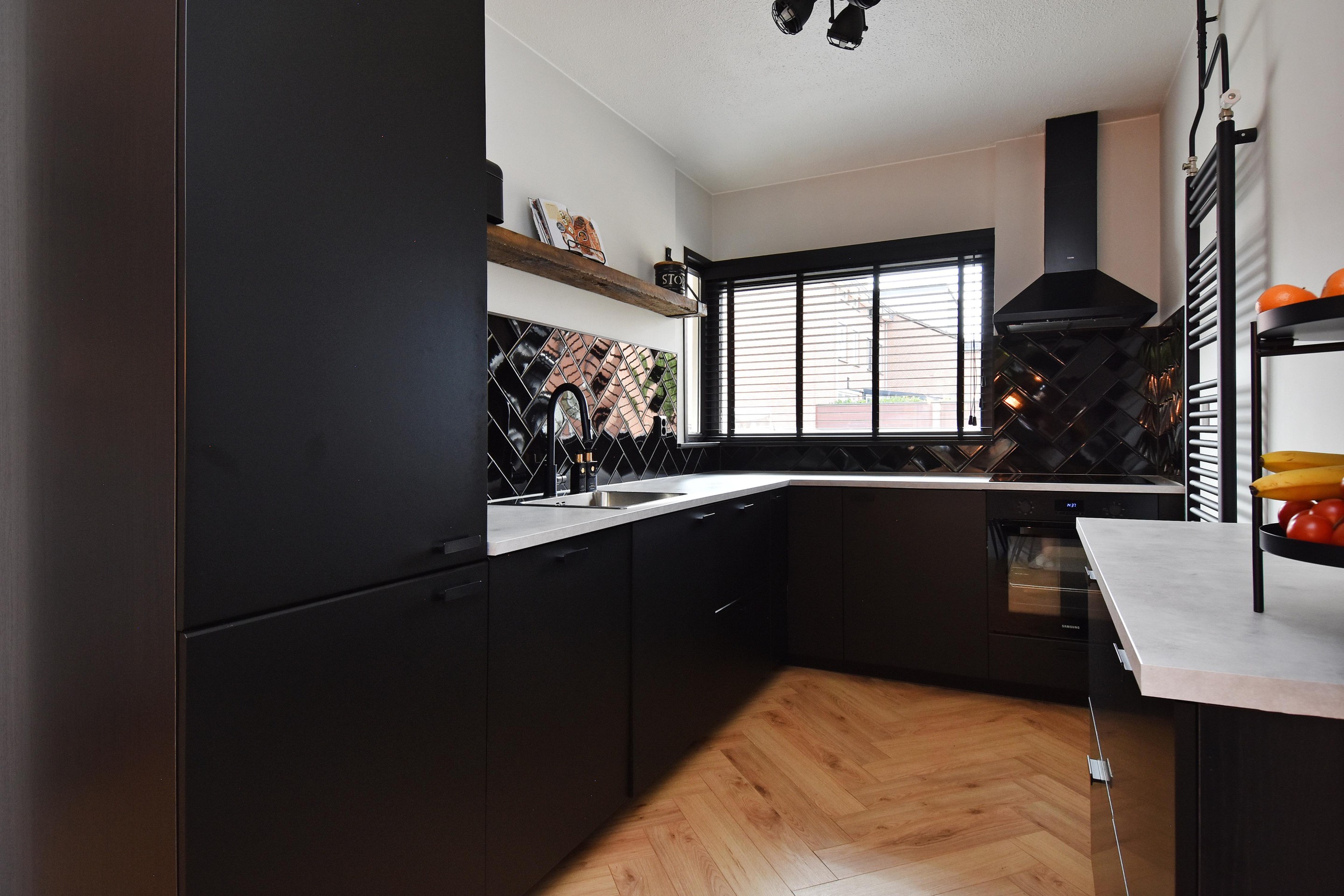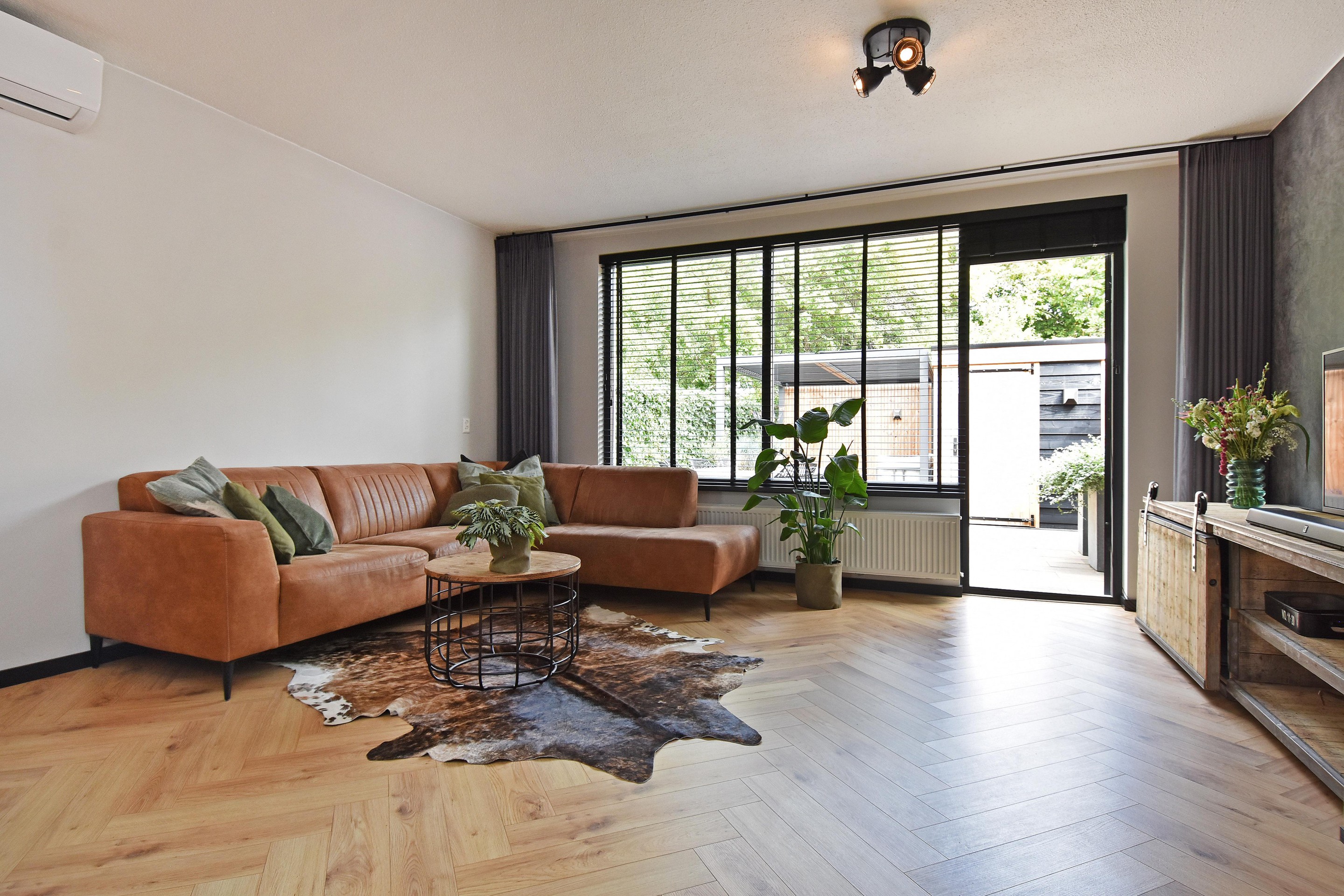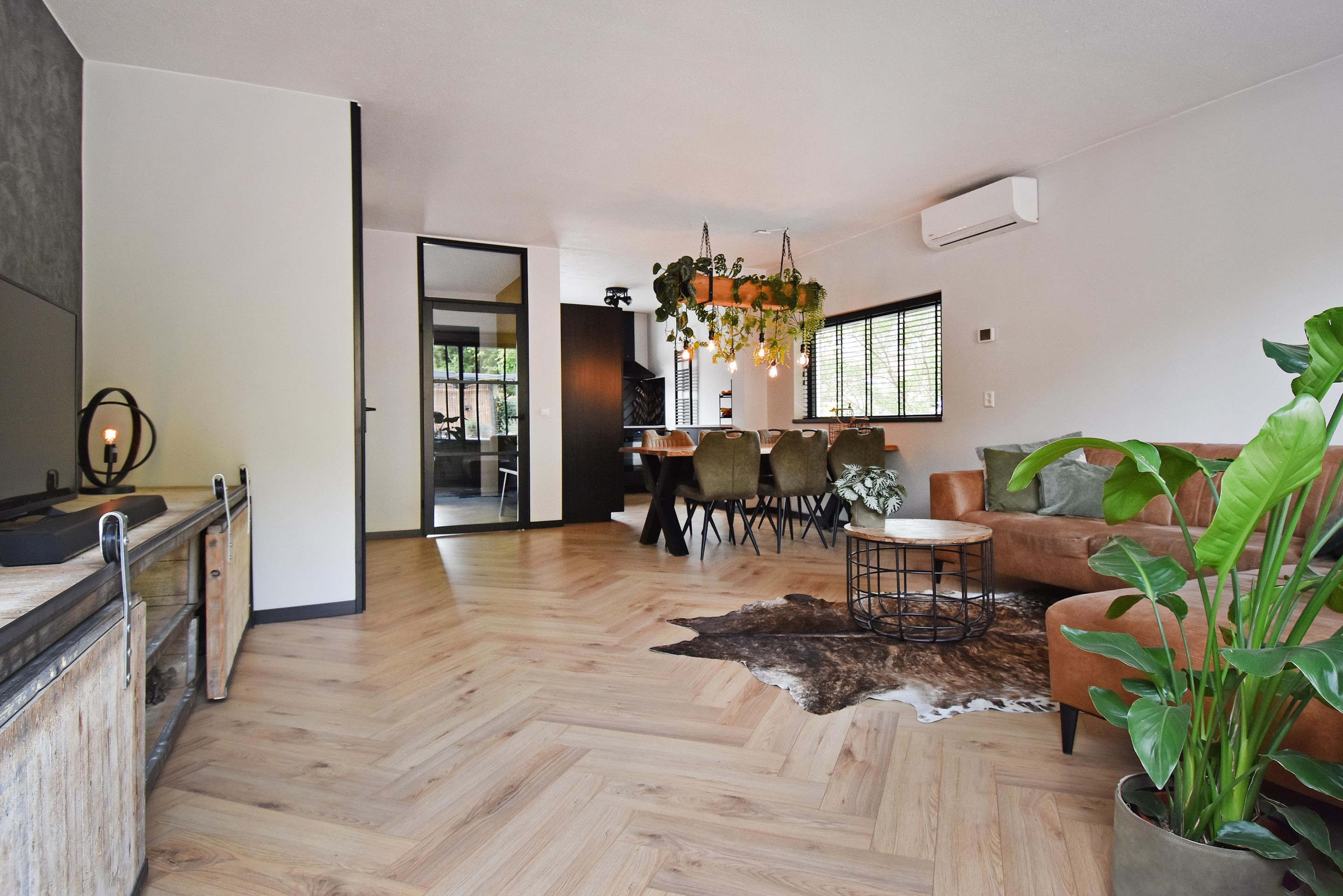 De woonkamer is royaal opgezet en voorzien van een stijlvolle visgraatvloer, goed afgewerkte wanden, een vaste trapkast en airconditioning die zowel kan koelen als verwarmen. Aan de voorzijde bevindt zich de moderne keuken (gerenoveerd in 2021), uitgerust met een inductiekookplaat met oven, vaatwasser, koel-/vriescombinatie en spoelbak met mengkraan. De vele kastjes en lades bieden volop bergruimte.
