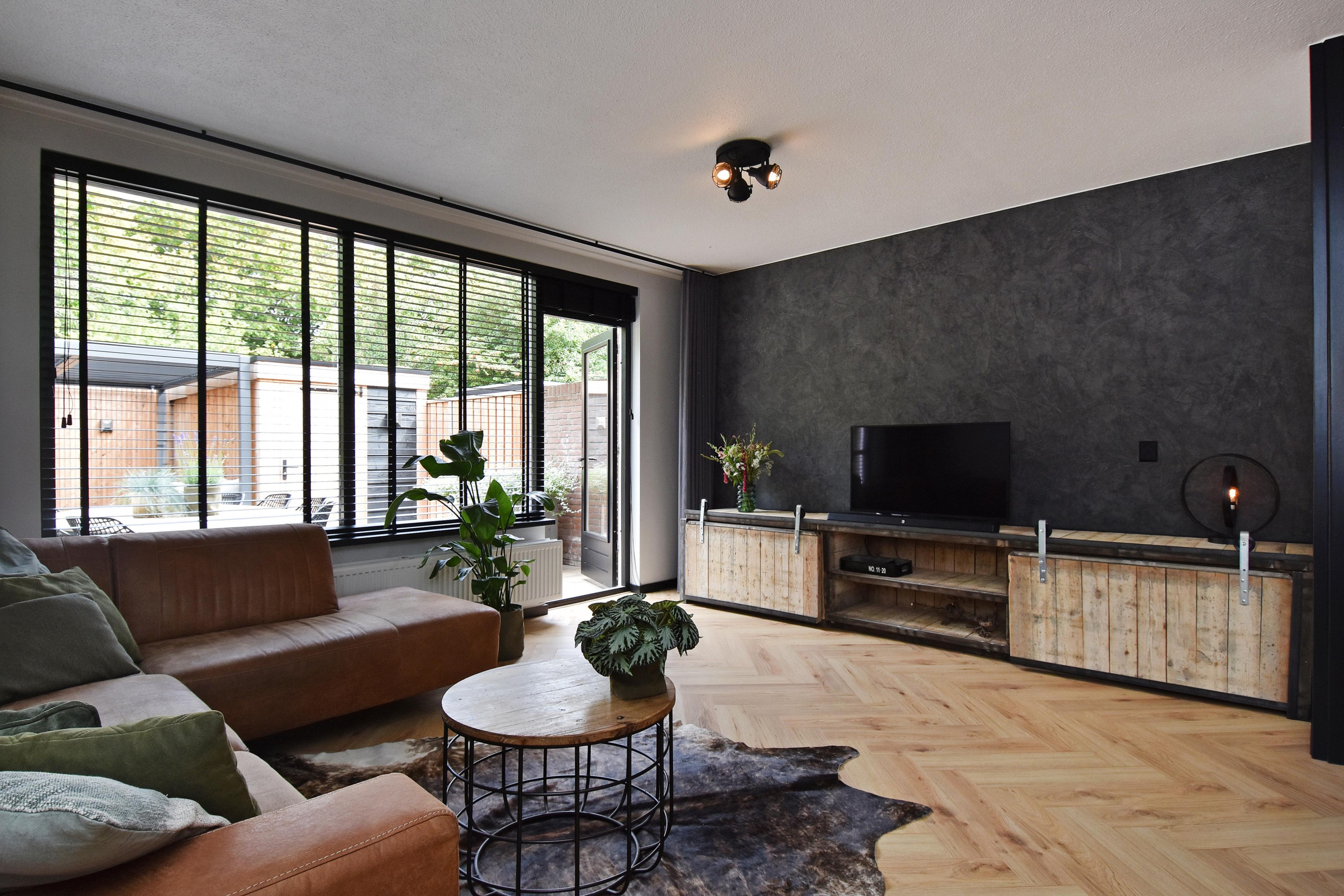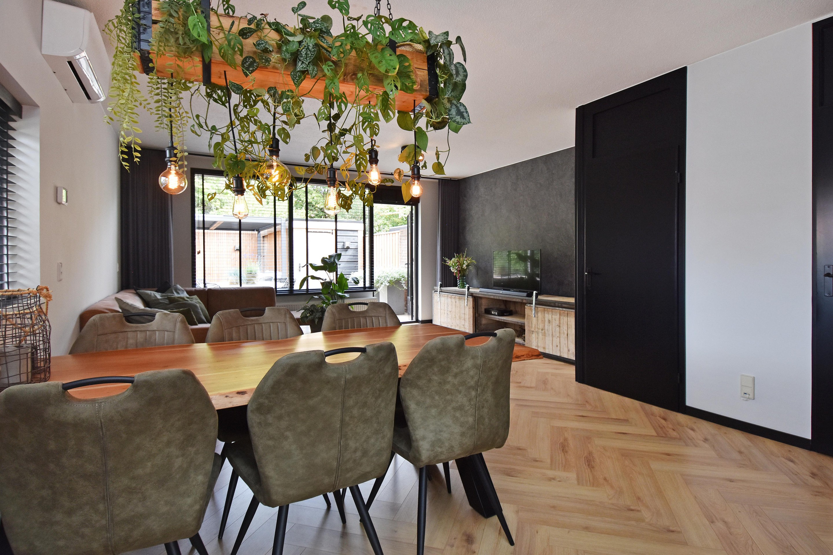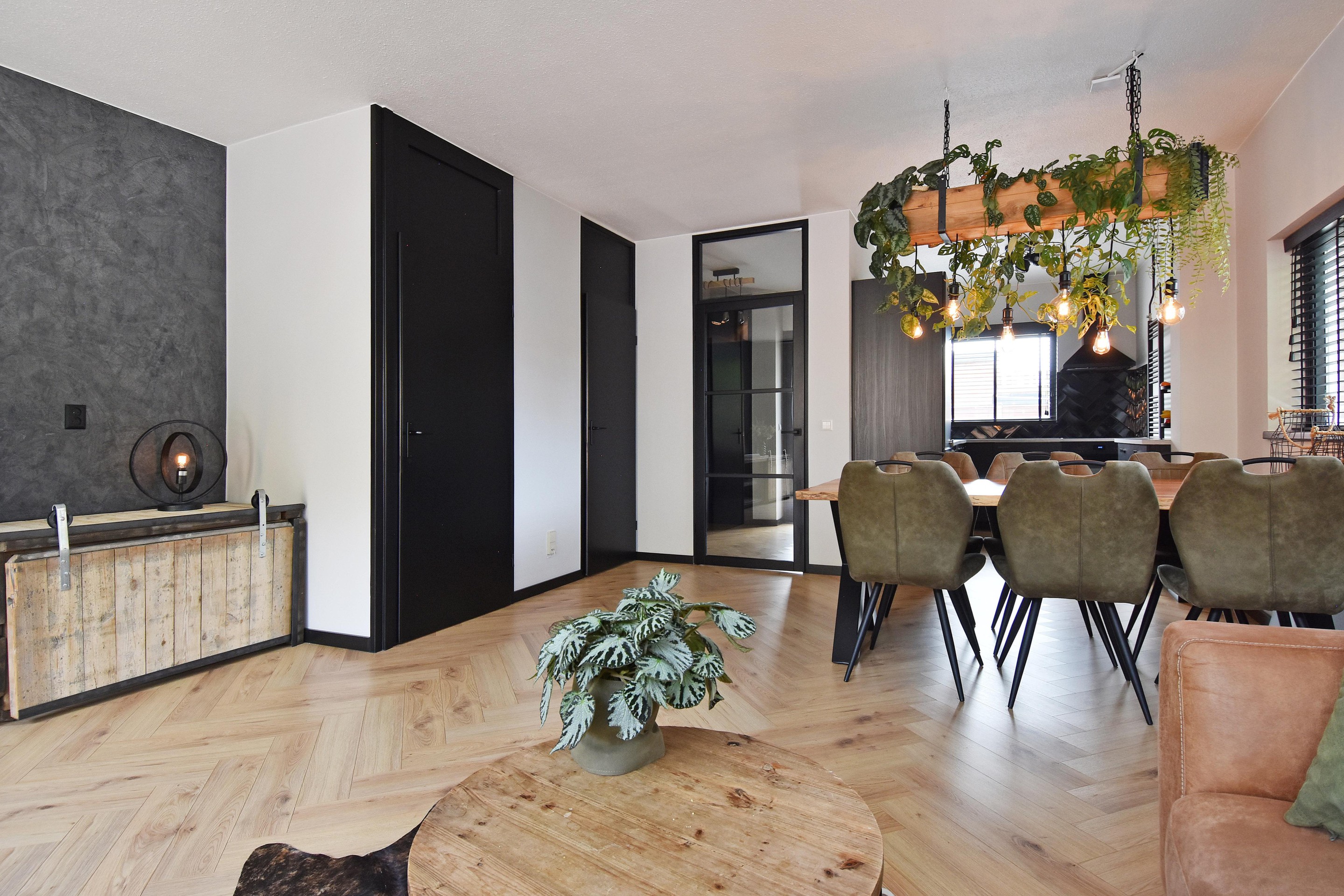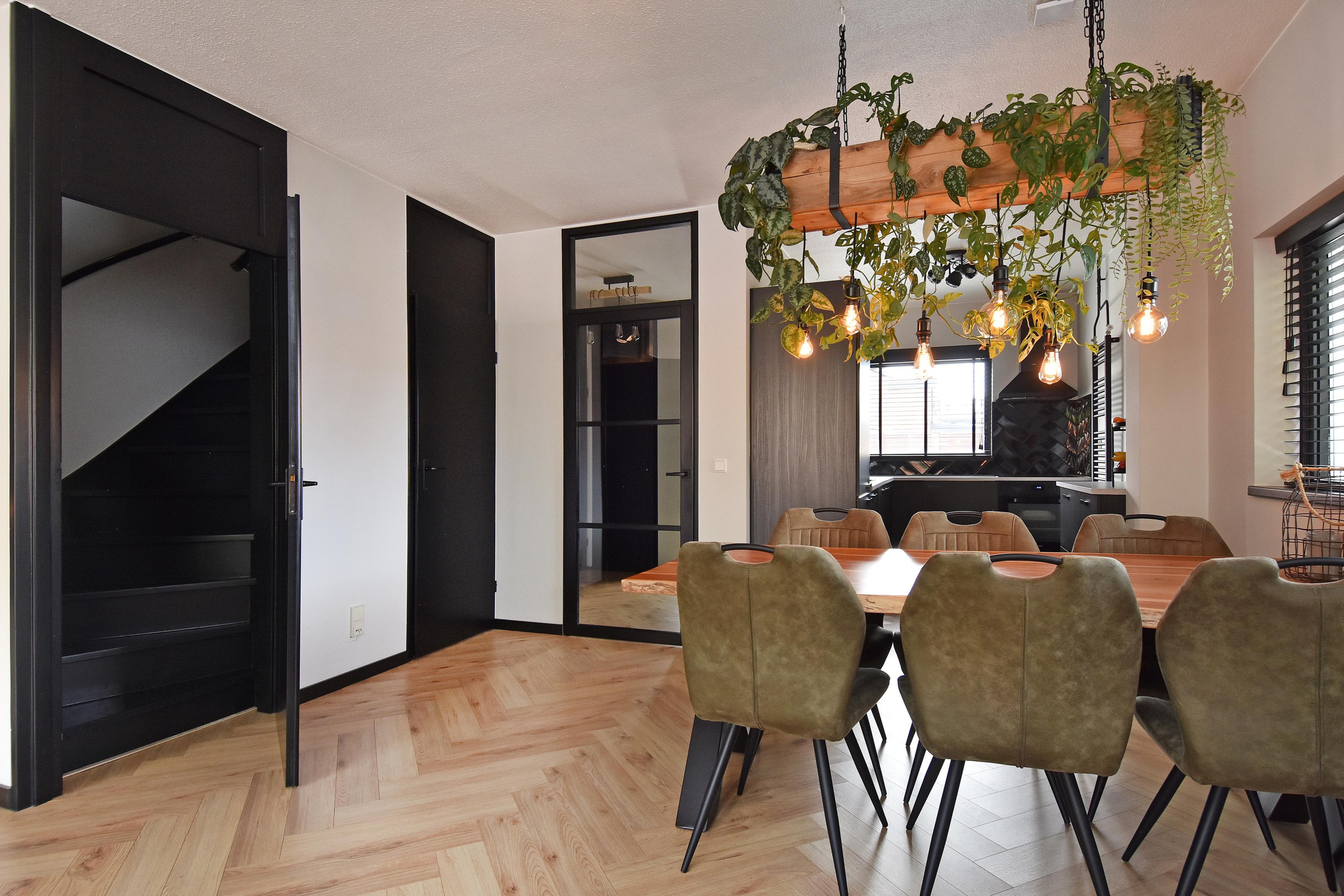 De woonkamer is royaal opgezet en voorzien van een stijlvolle visgraatvloer, goed afgewerkte wanden, een vaste trapkast en airconditioning die zowel kan koelen als verwarmen. Aan de voorzijde bevindt zich de moderne keuken (gerenoveerd in 2021), uitgerust met een inductiekookplaat met oven, vaatwasser, koel-/vriescombinatie en spoelbak met mengkraan. De vele kastjes en lades bieden volop bergruimte.